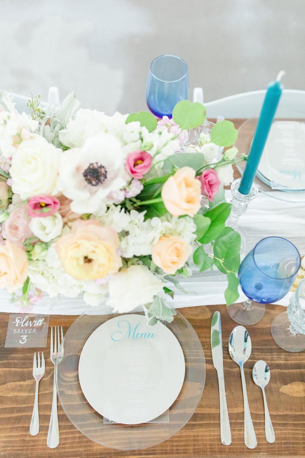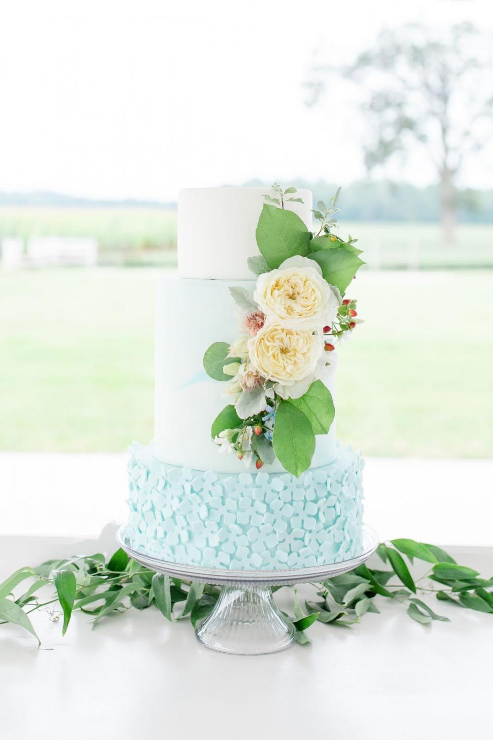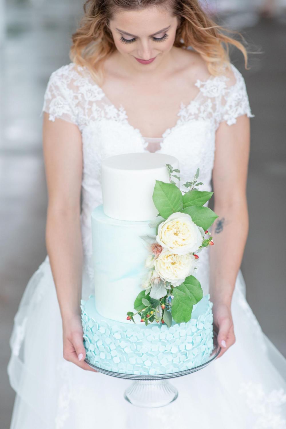 But let's not forget about that cake! The team wanted to put a spin on the classic white tiered look and added in a marble texture with shades of blue. The team notes, “Adding the shades of blue on the cake made it match the decorations around the venue making it all tie together. Then the final touches were the beautiful fresh flowers that really made this cake shine!” We’re ready for a slice!