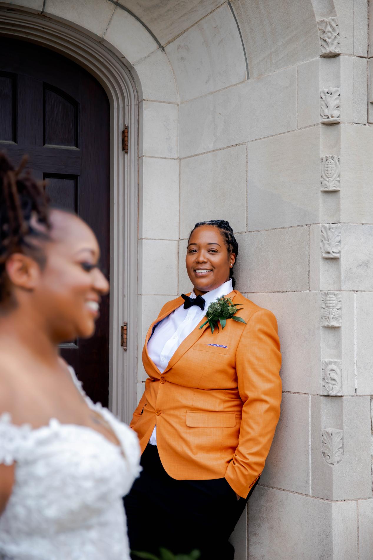 Instead of an entire suit of a different color, sometimes a jacket is all you need. This yellow jacket is sure to stand out in a crowd of traditional suits and tuxedos. We also love that a blue pocket square was added to this suit for an additional flair of color!