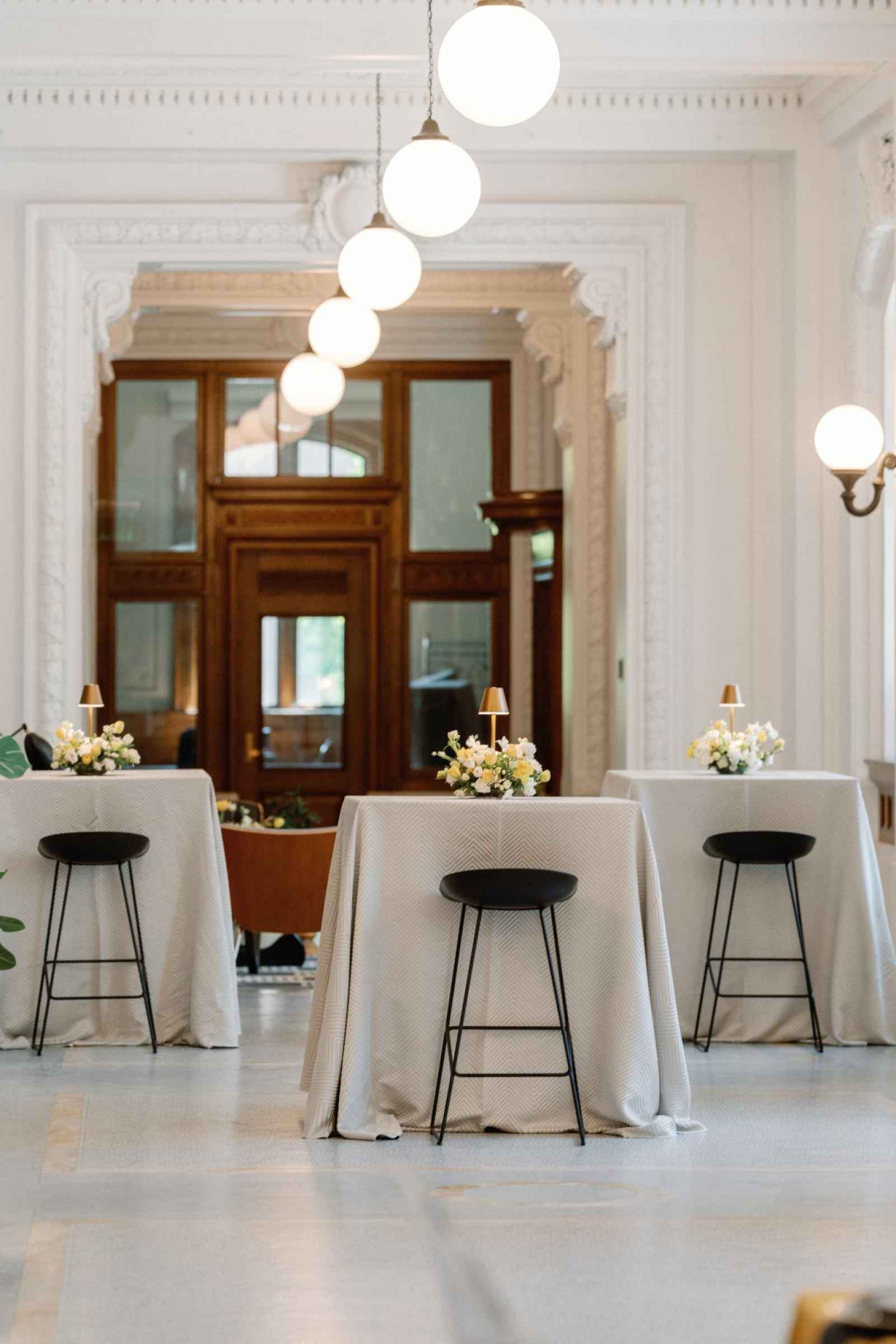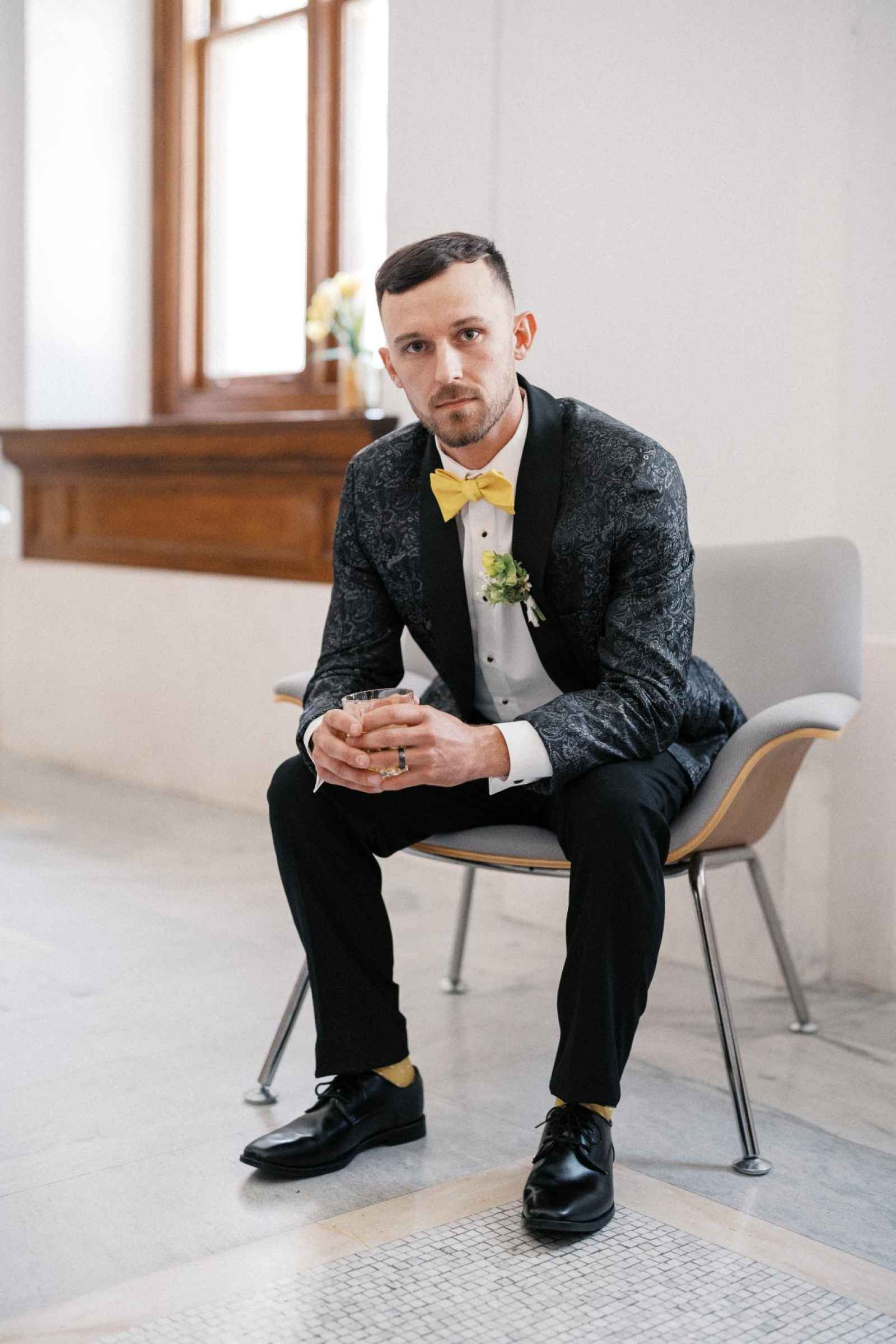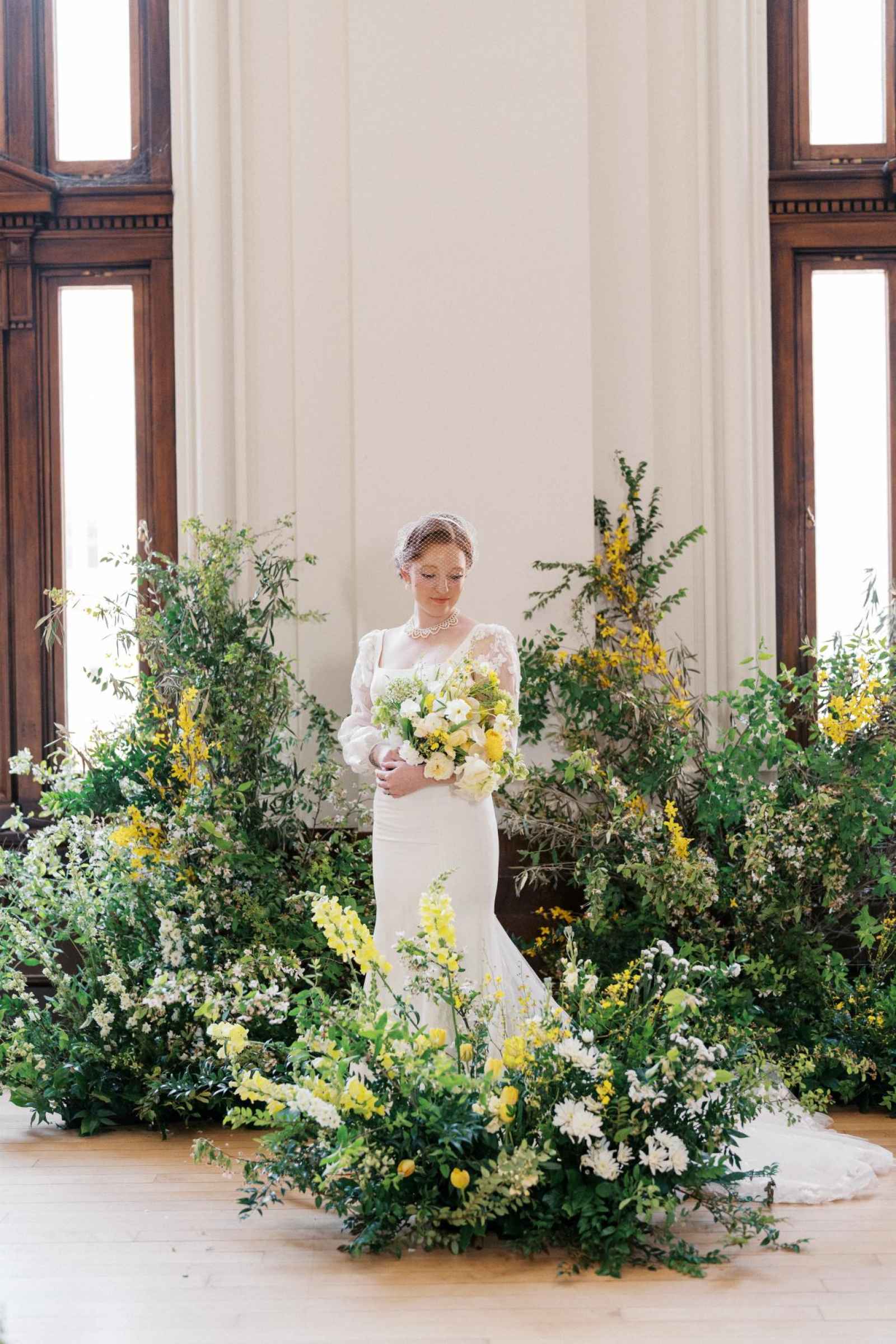 The design team behind this style shoot wanted to step into another era with a springtime twist, and they pulled it off beautifully! To achieve the Art Deco style, they focused a lot on geometric lines and glamorous details. We are absolutely obsessed with this color scheme for a spring wedding, too! The emerald green and yellow fit together so beautifully, reminding us of rebirth and new life after a long winter. For the décor, the team incorporated plenty of elegant items like glassware, golden flatware, satin and velvet. And the venue was a perfect fit for this design, with its marble accents, architectural details and metalwork!