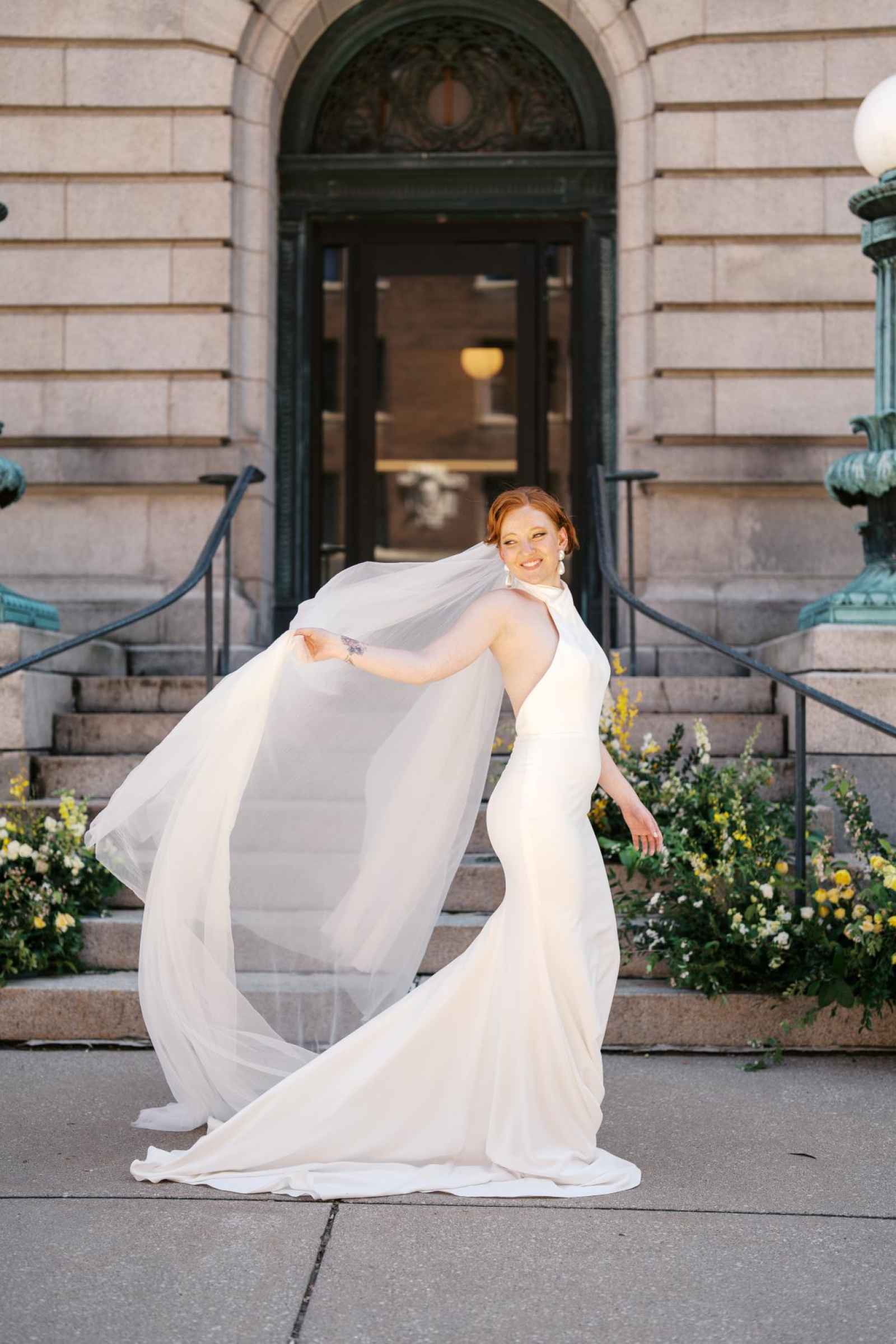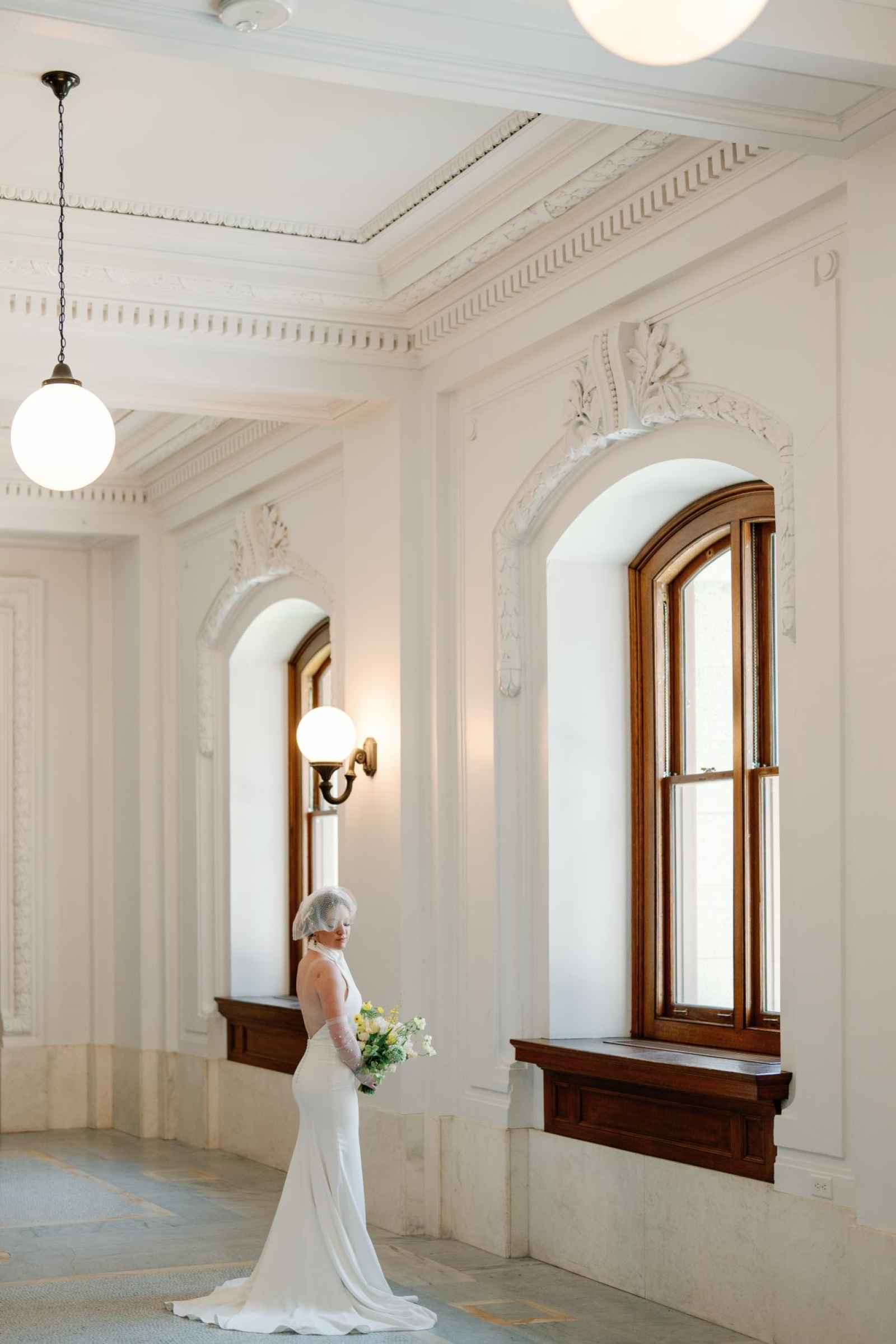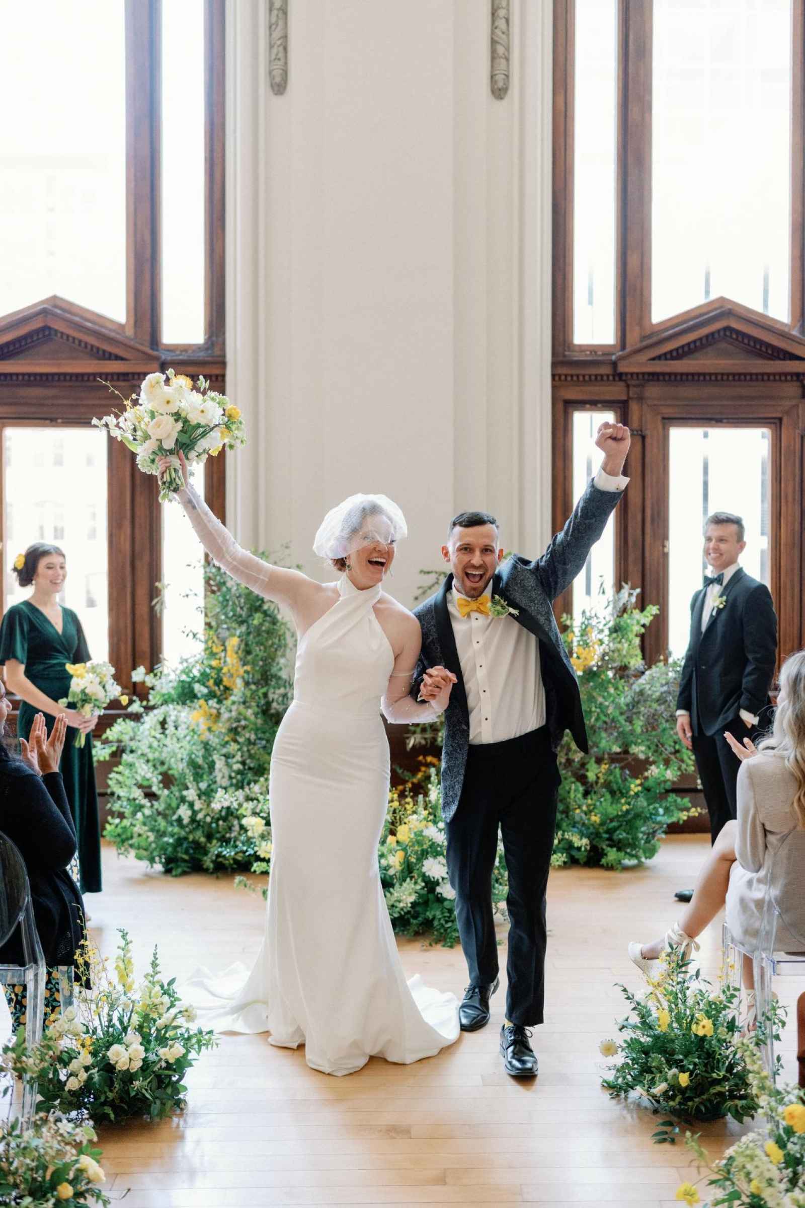 The design team behind this style shoot wanted to step into another era with a springtime twist, and they pulled it off beautifully! To achieve the Art Deco style, they focused a lot on geometric lines and glamorous details. We are absolutely obsessed with this color scheme for a spring wedding, too! The emerald green and yellow fit together so beautifully, reminding us of rebirth and new life after a long winter. For the décor, the team incorporated plenty of elegant items like glassware, golden flatware, satin and velvet. And the venue was a perfect fit for this design, with its marble accents, architectural details and metalwork!