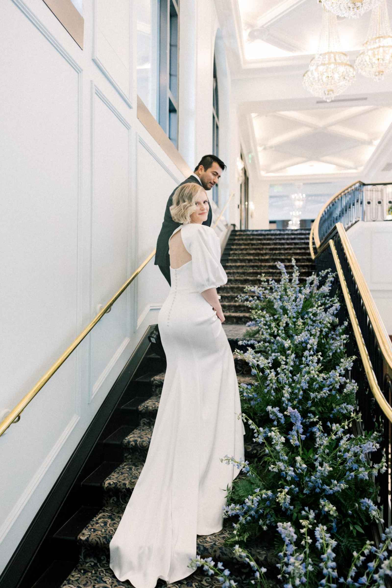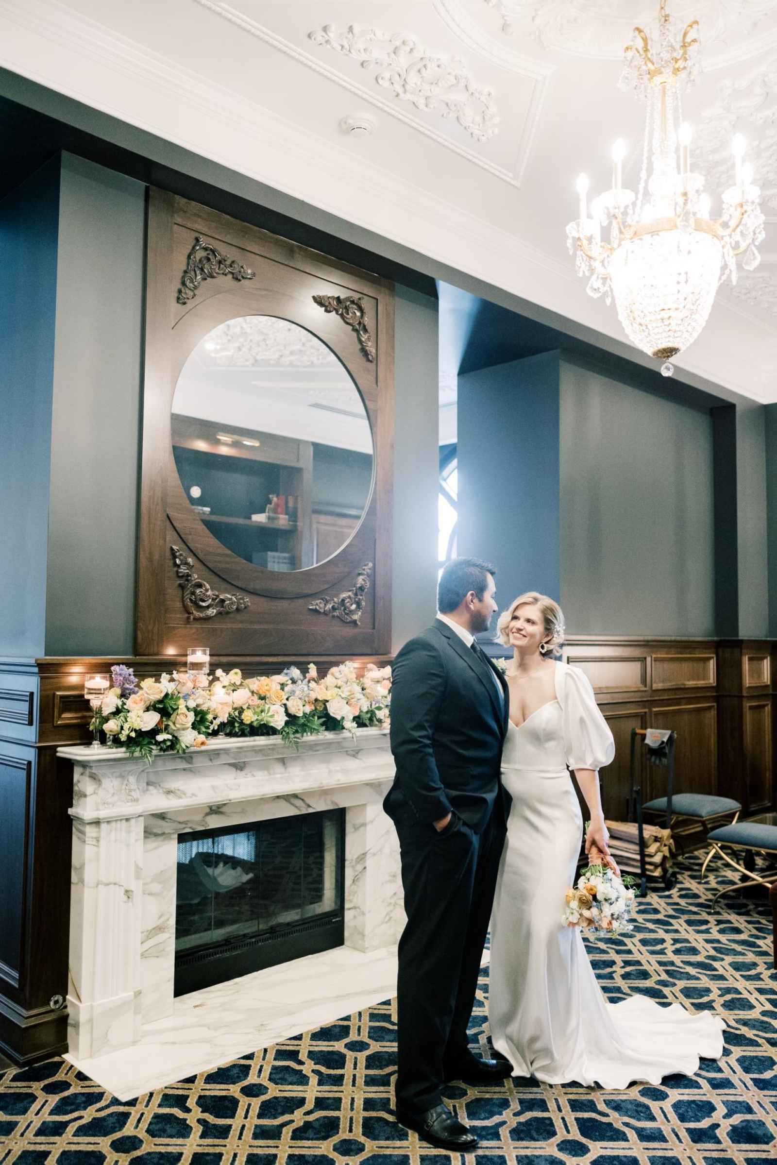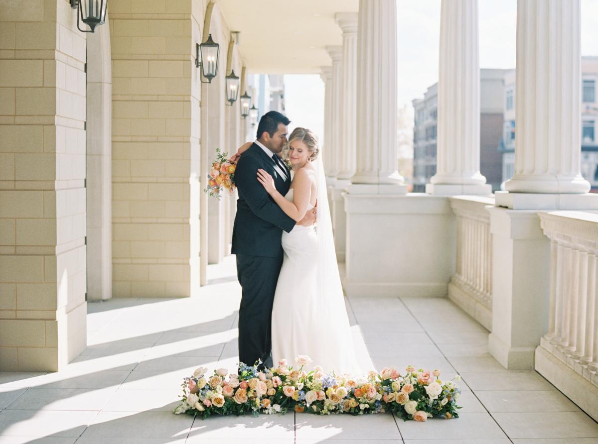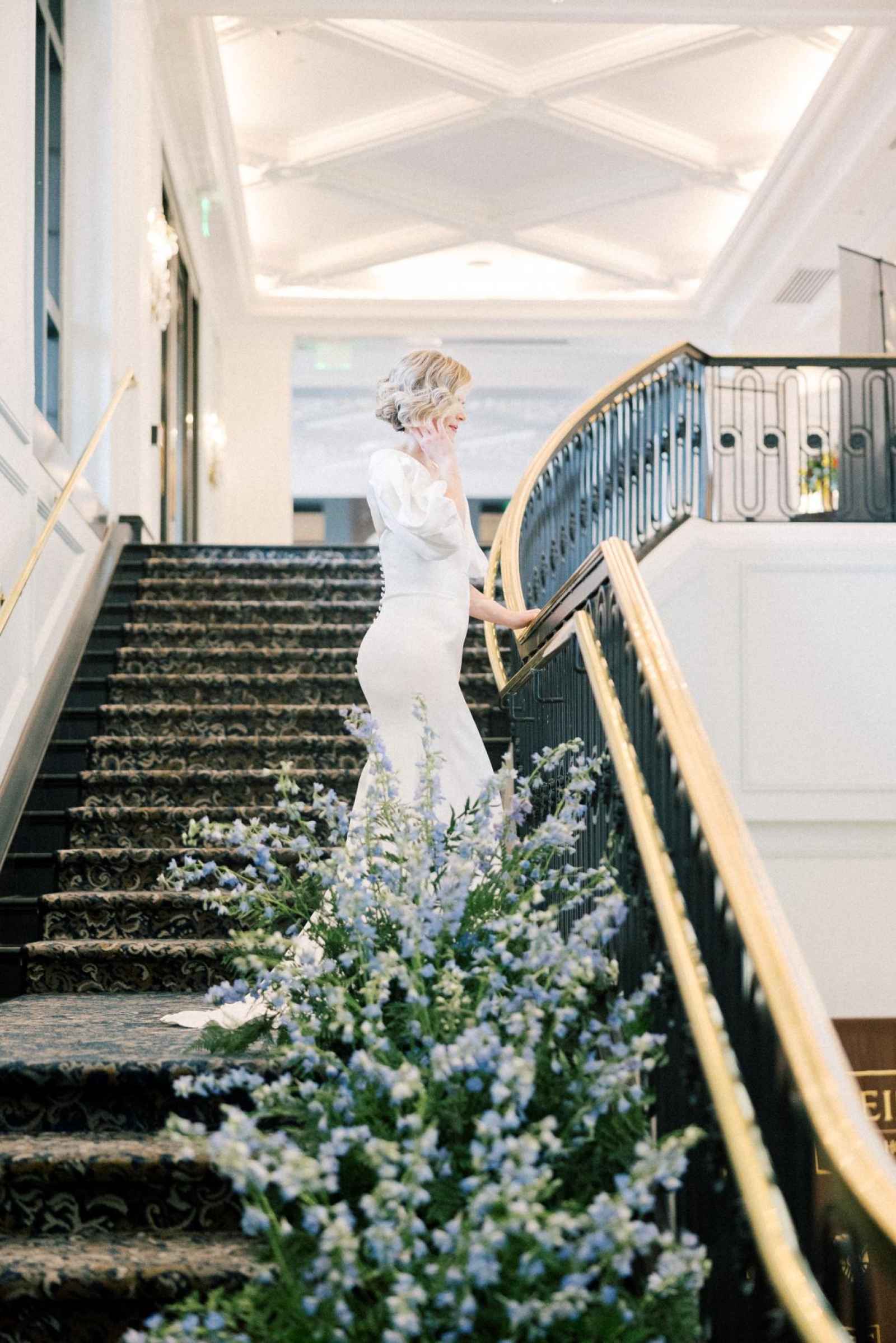 With Carmel becoming a blossoming city for weddings, Ashley desired a venue in that area to host this shoot. Once she saw Hotel Carmichael, Ashley knew it was the one! The elegant details and romantic colors around the space were what really sold the team. An additional benefit was its close proximity to notable landmarks and beautiful photo-op locations. Some of our favorite aspects of the hotel include the incredible natural light in the ballroom, expansive balcony, grand staircase and cozy lounge, to name a few!