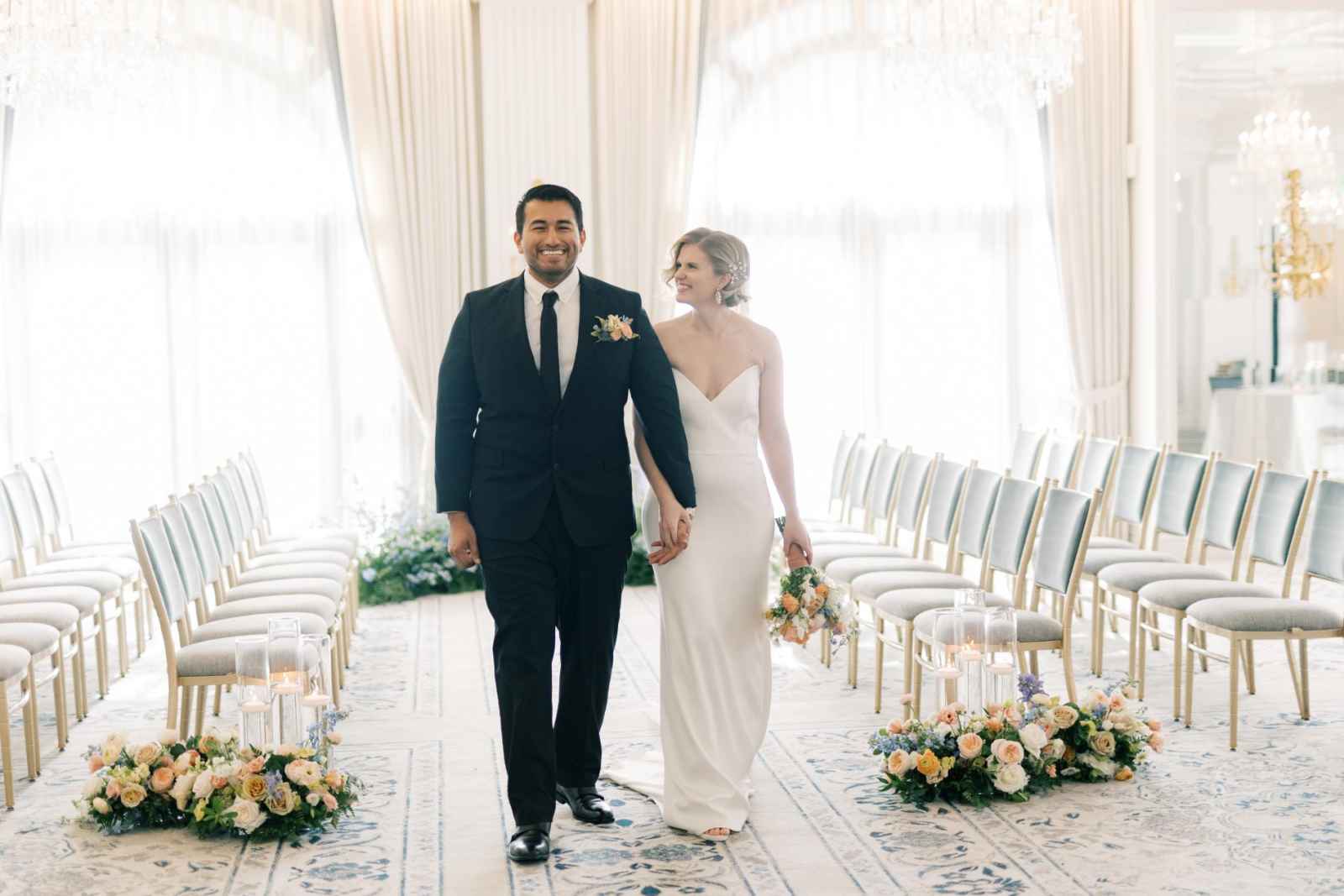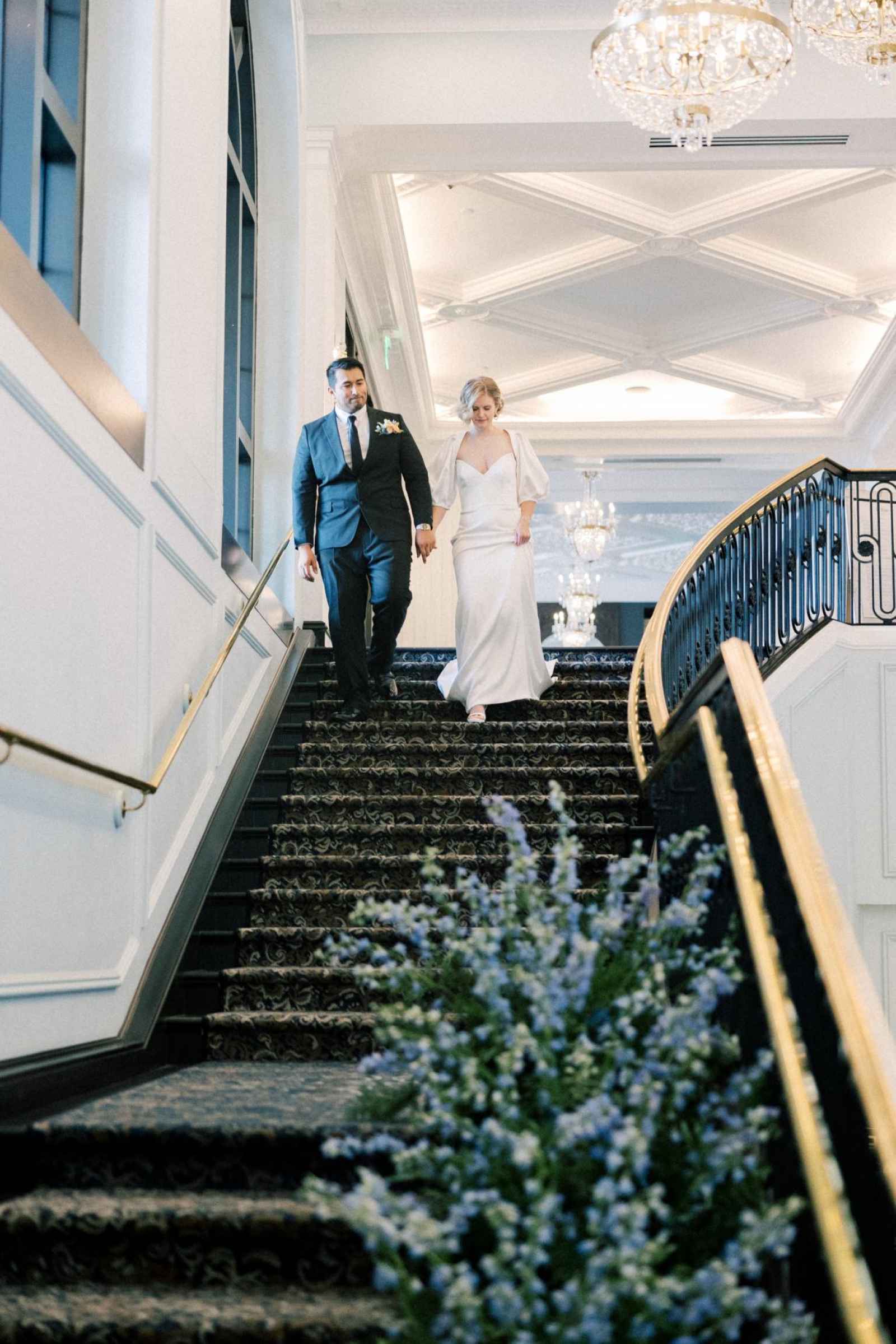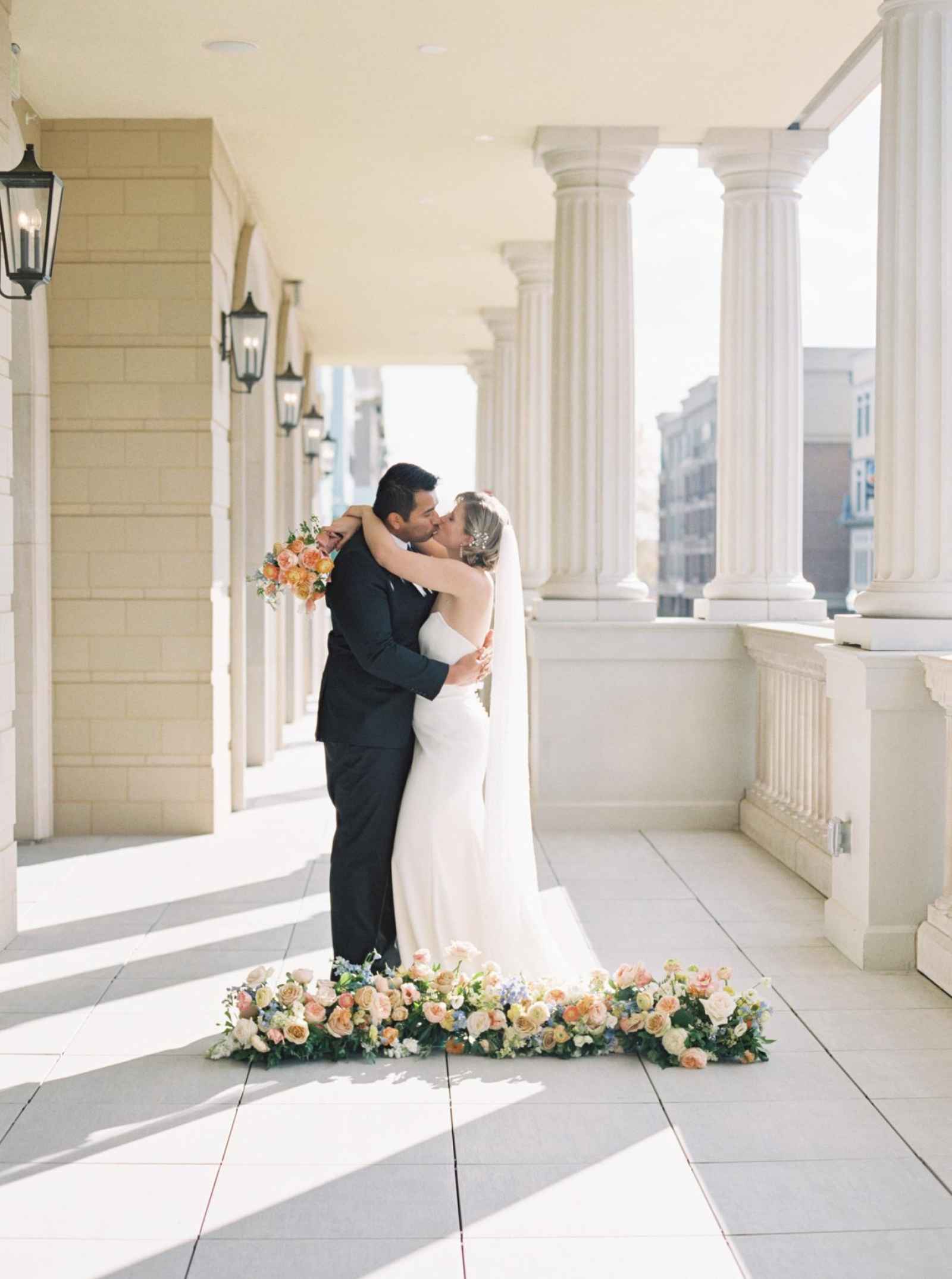 With Carmel becoming a blossoming city for weddings, Ashley desired a venue in that area to host this shoot. Once she saw Hotel Carmichael, Ashley knew it was the one! The elegant details and romantic colors around the space were what really sold the team. An additional benefit was its close proximity to notable landmarks and beautiful photo-op locations. Some of our favorite aspects of the hotel include the incredible natural light in the ballroom, expansive balcony, grand staircase and cozy lounge, to name a few!
