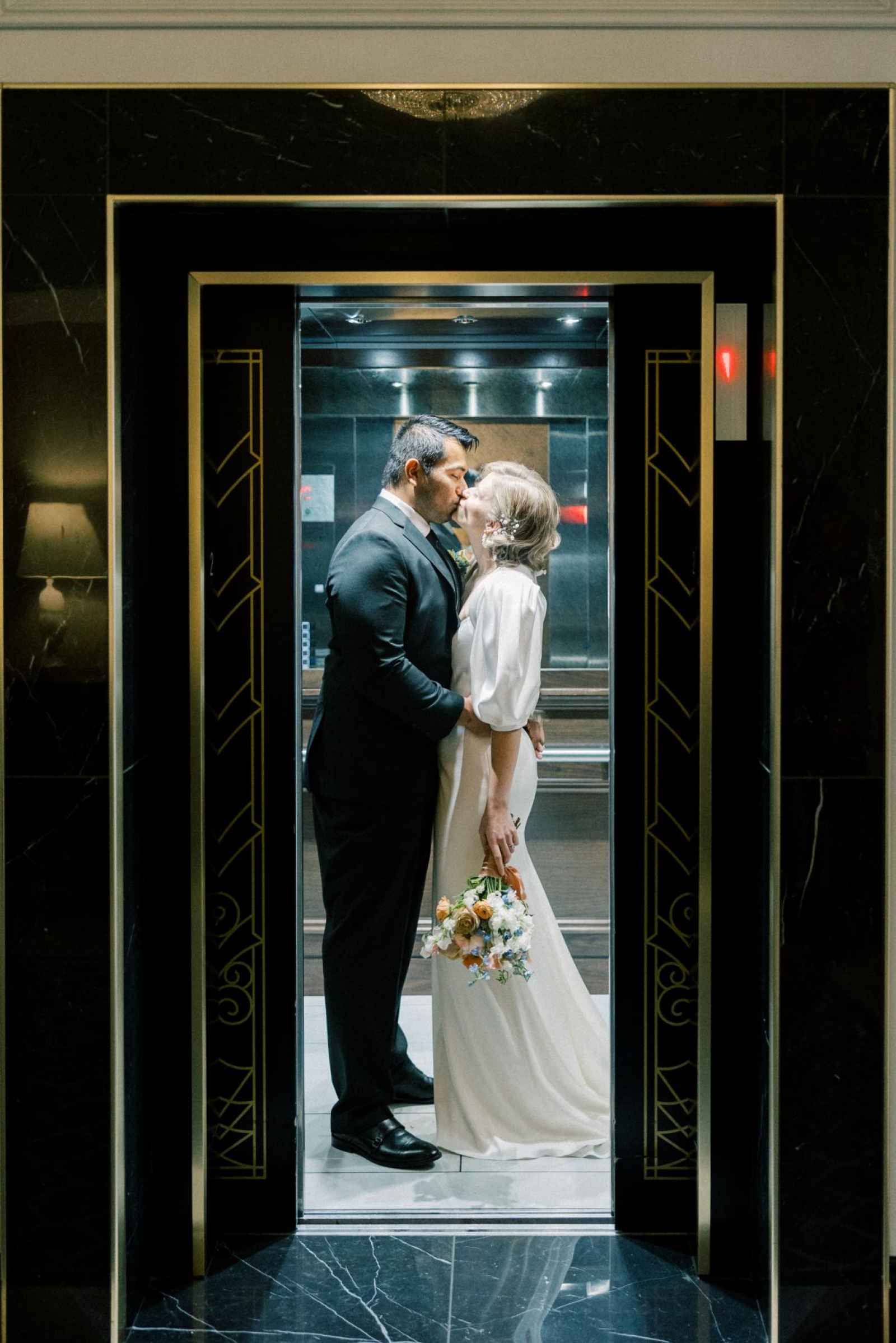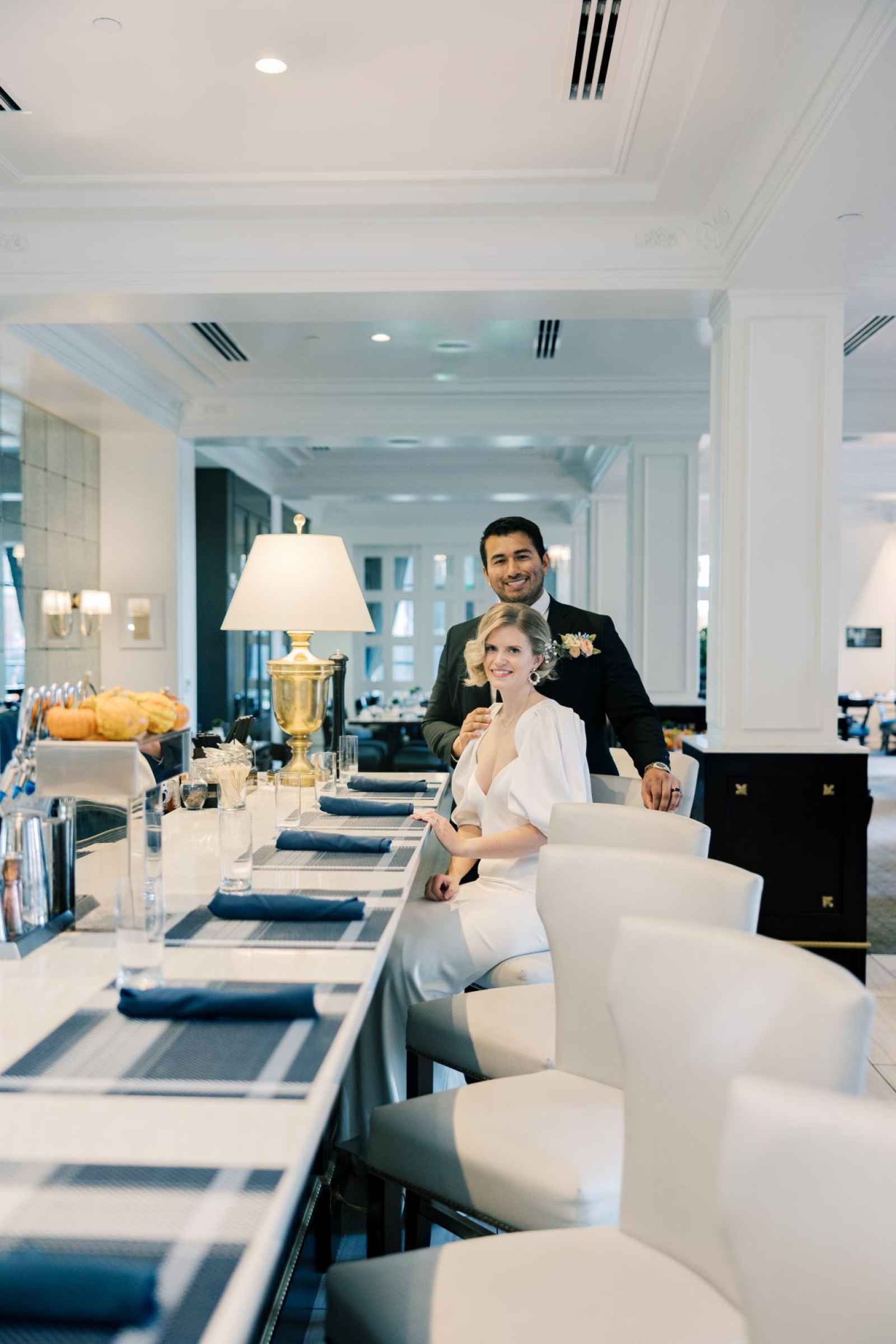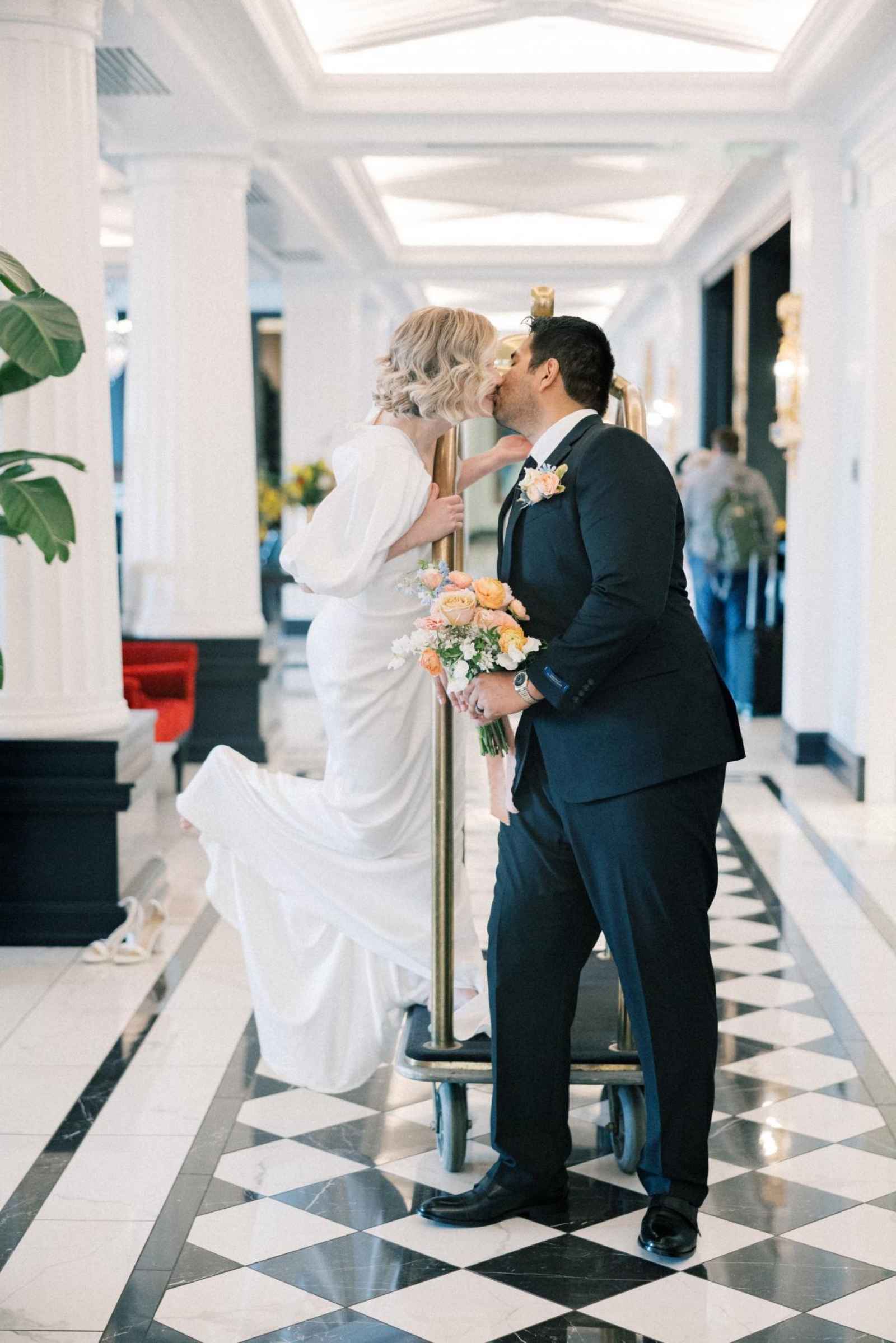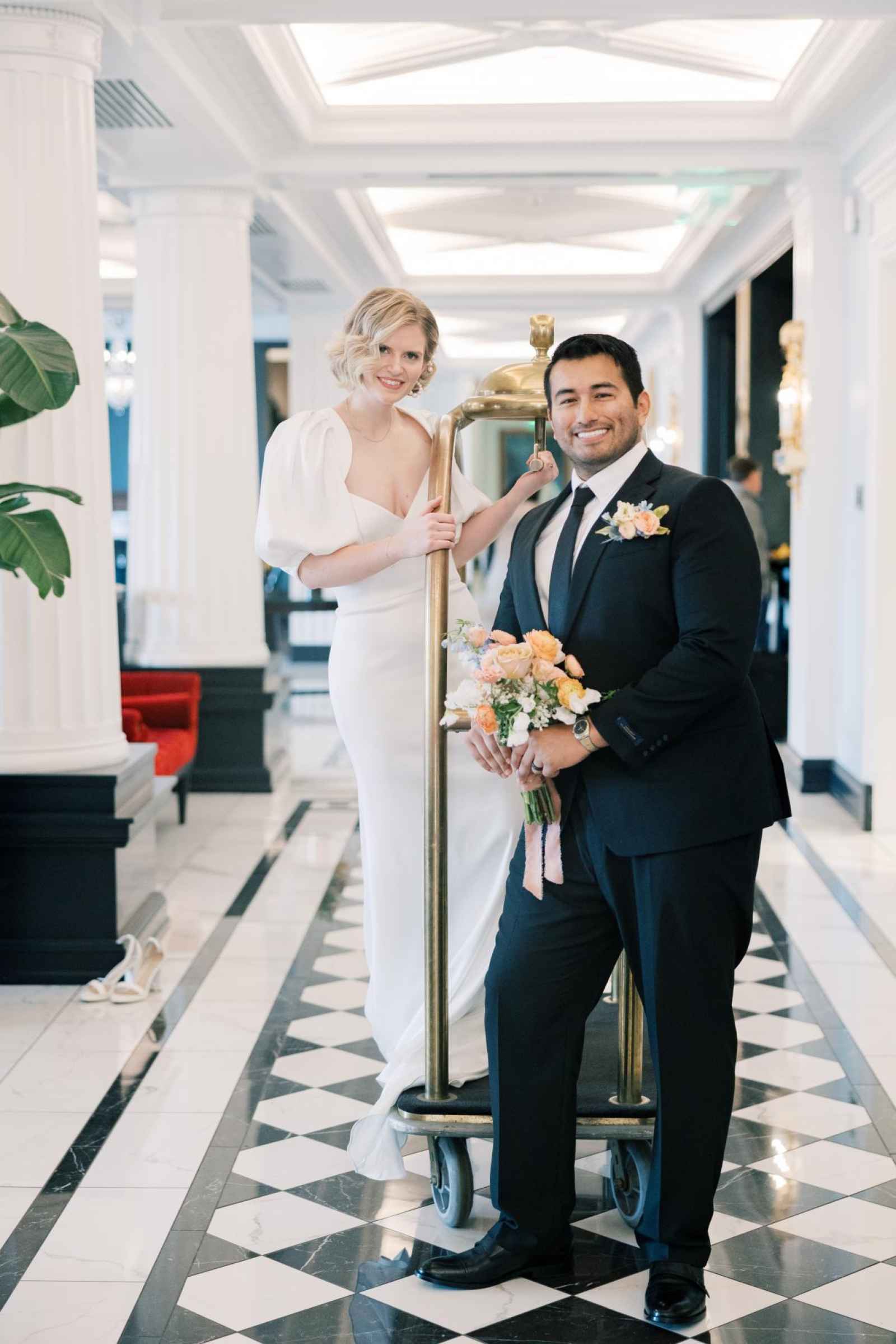 With Carmel becoming a blossoming city for weddings, Ashley desired a venue in that area to host this shoot. Once she saw Hotel Carmichael, Ashley knew it was the one! The elegant details and romantic colors around the space were what really sold the team. An additional benefit was its close proximity to notable landmarks and beautiful photo-op locations. Some of our favorite aspects of the hotel include the incredible natural light in the ballroom, expansive balcony, grand staircase and cozy lounge, to name a few!
