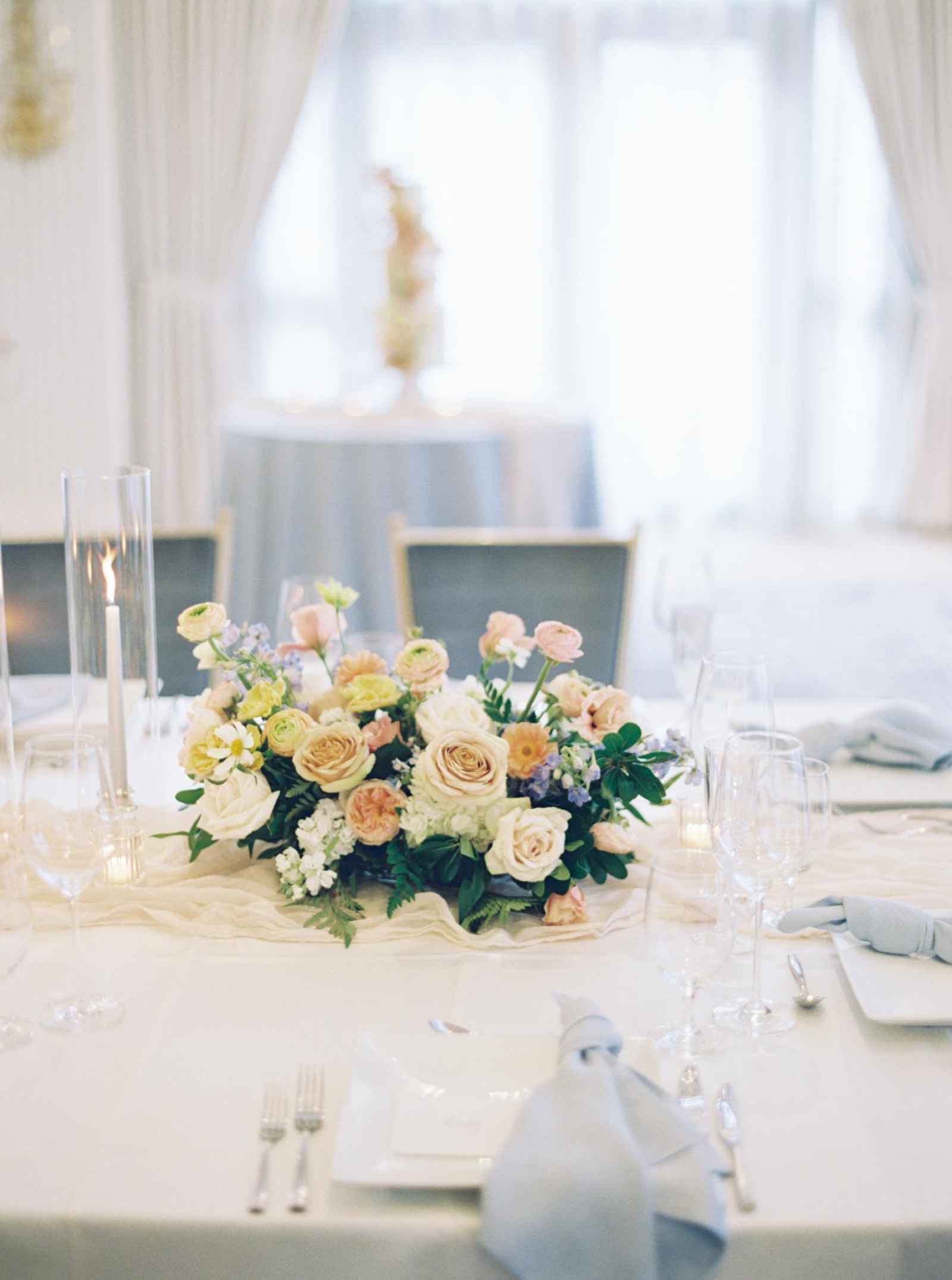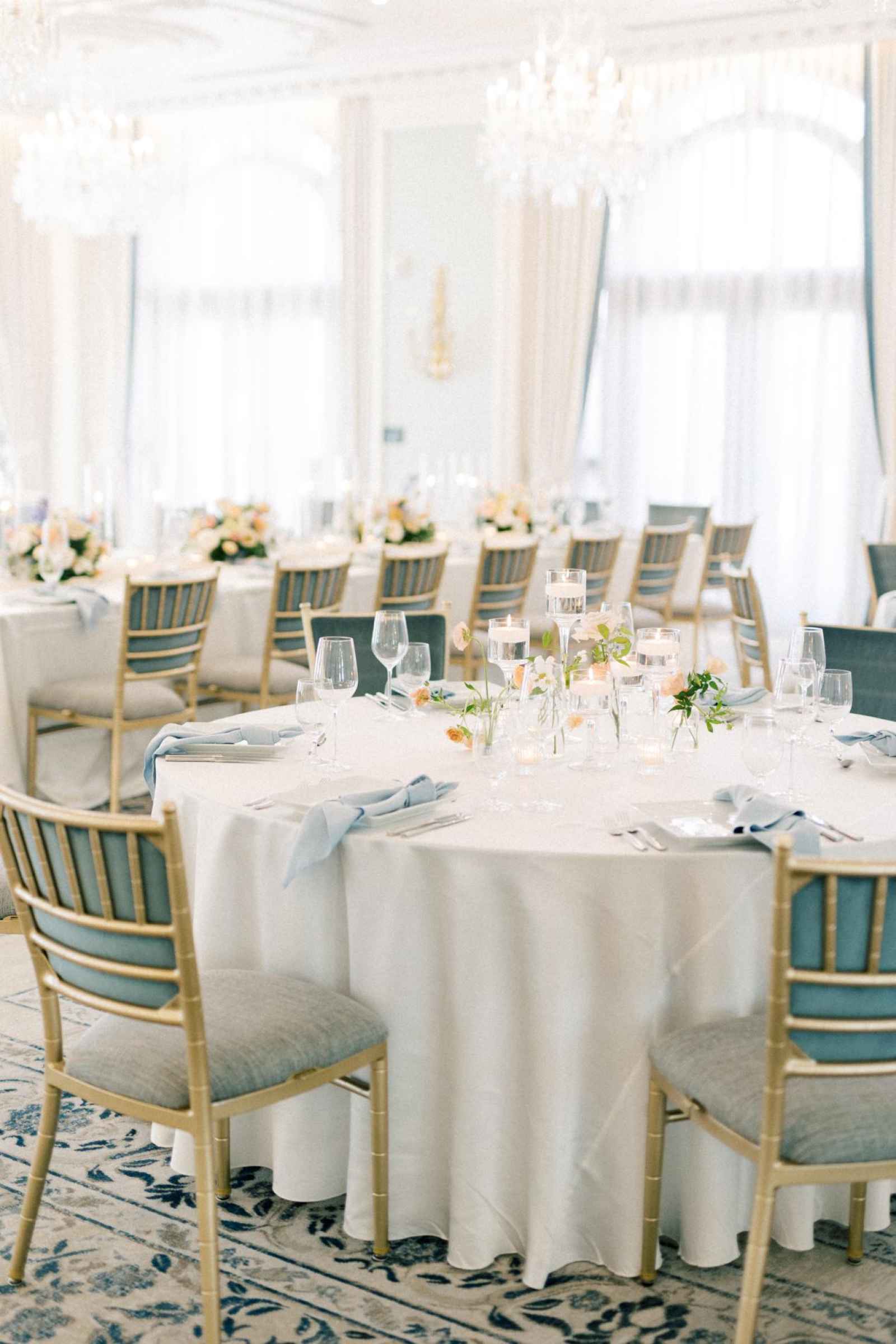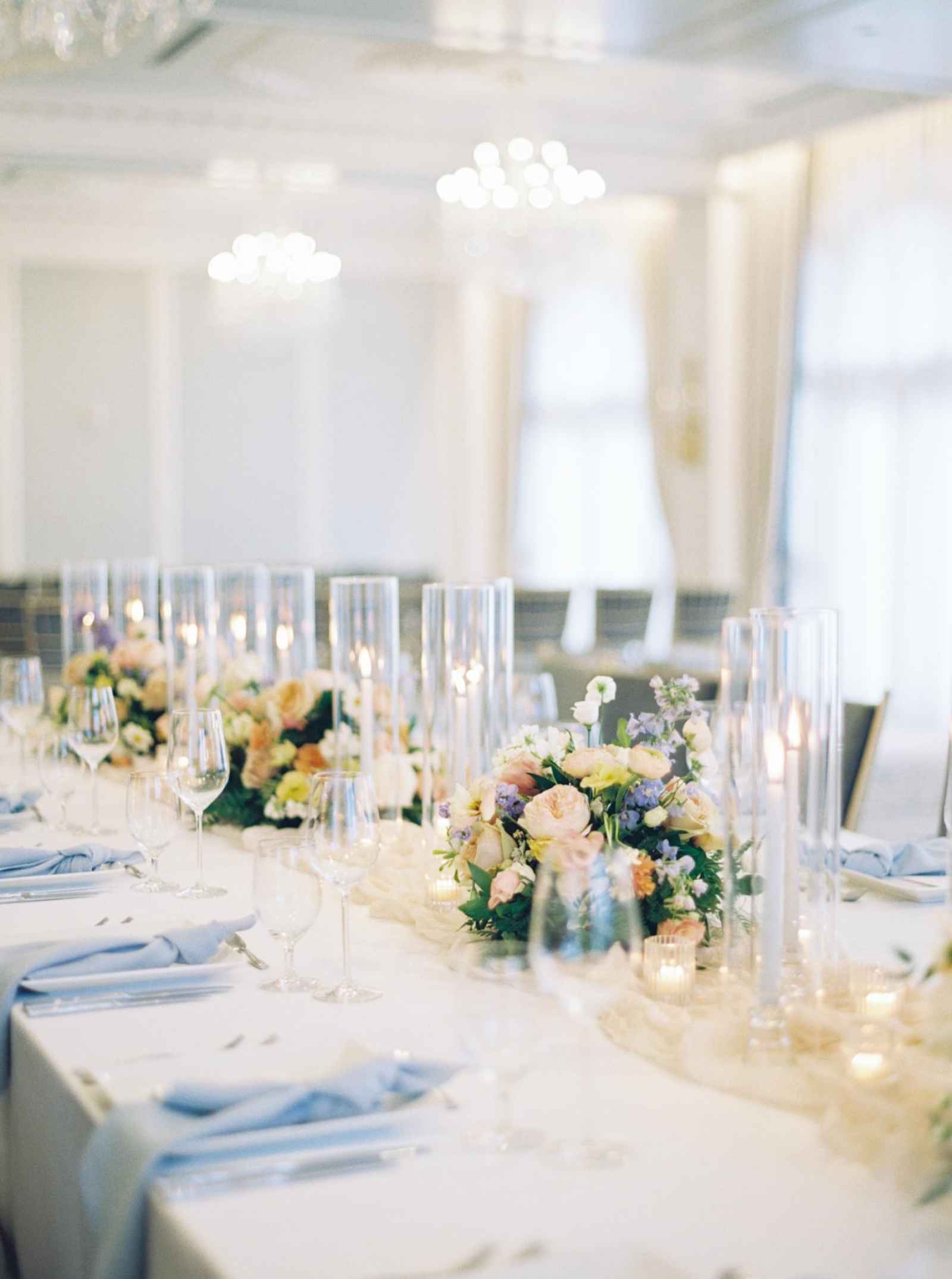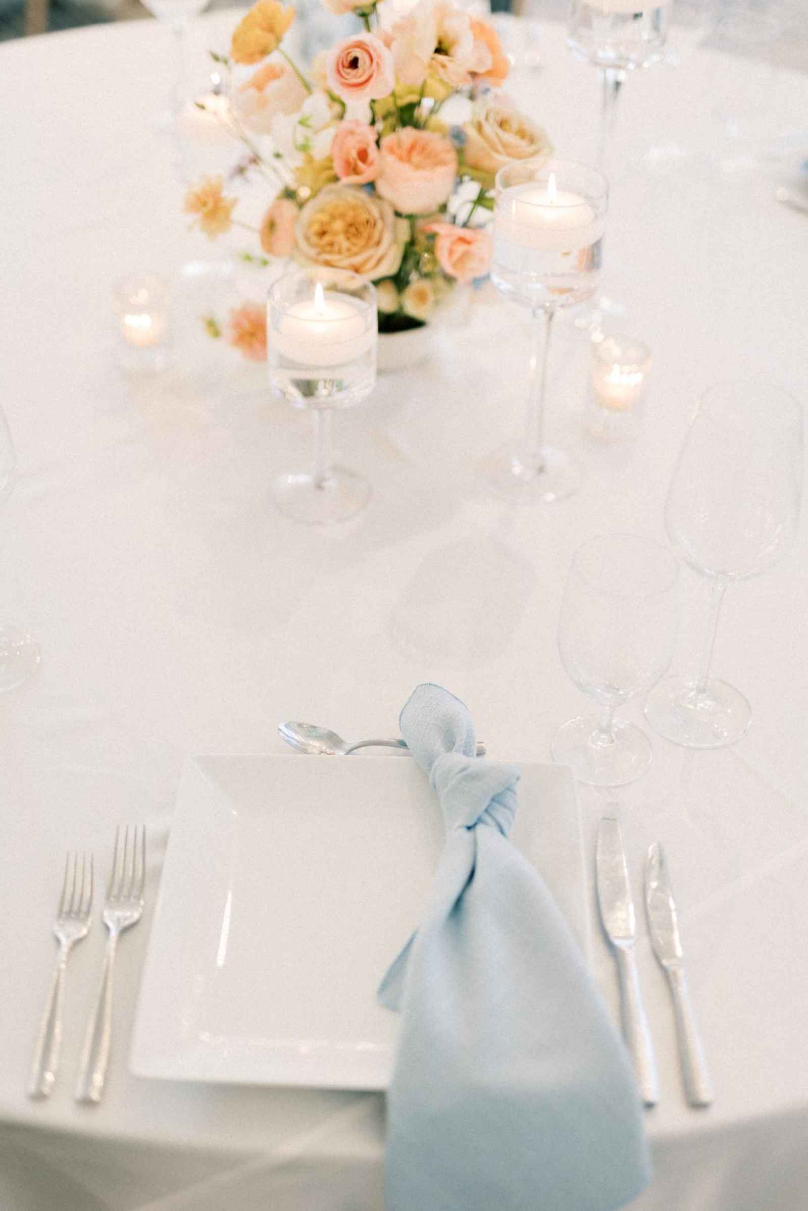 Elegance and romance come to life in the reception tablescapes! The toasting glasses and glass candleholders from Luva Events along with the stemware from Hotel Carmichael elevate the whole reception scene. We also adore how the pale blue napkins pop right off the white table cloths! Another unique touch that brings elegance into the shoot are the square plates that the team used. This simple element makes all the difference in taking your décor to the next level!