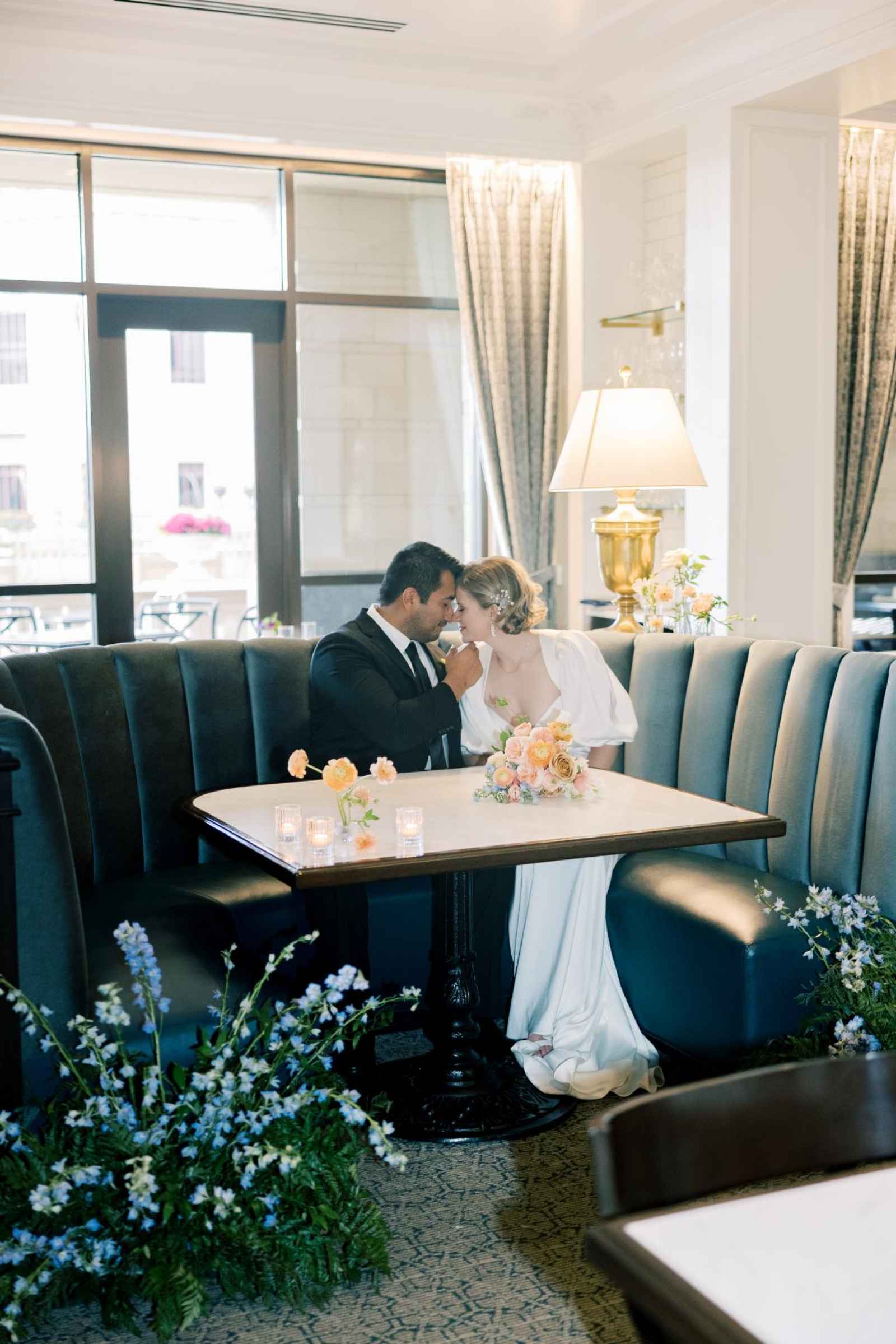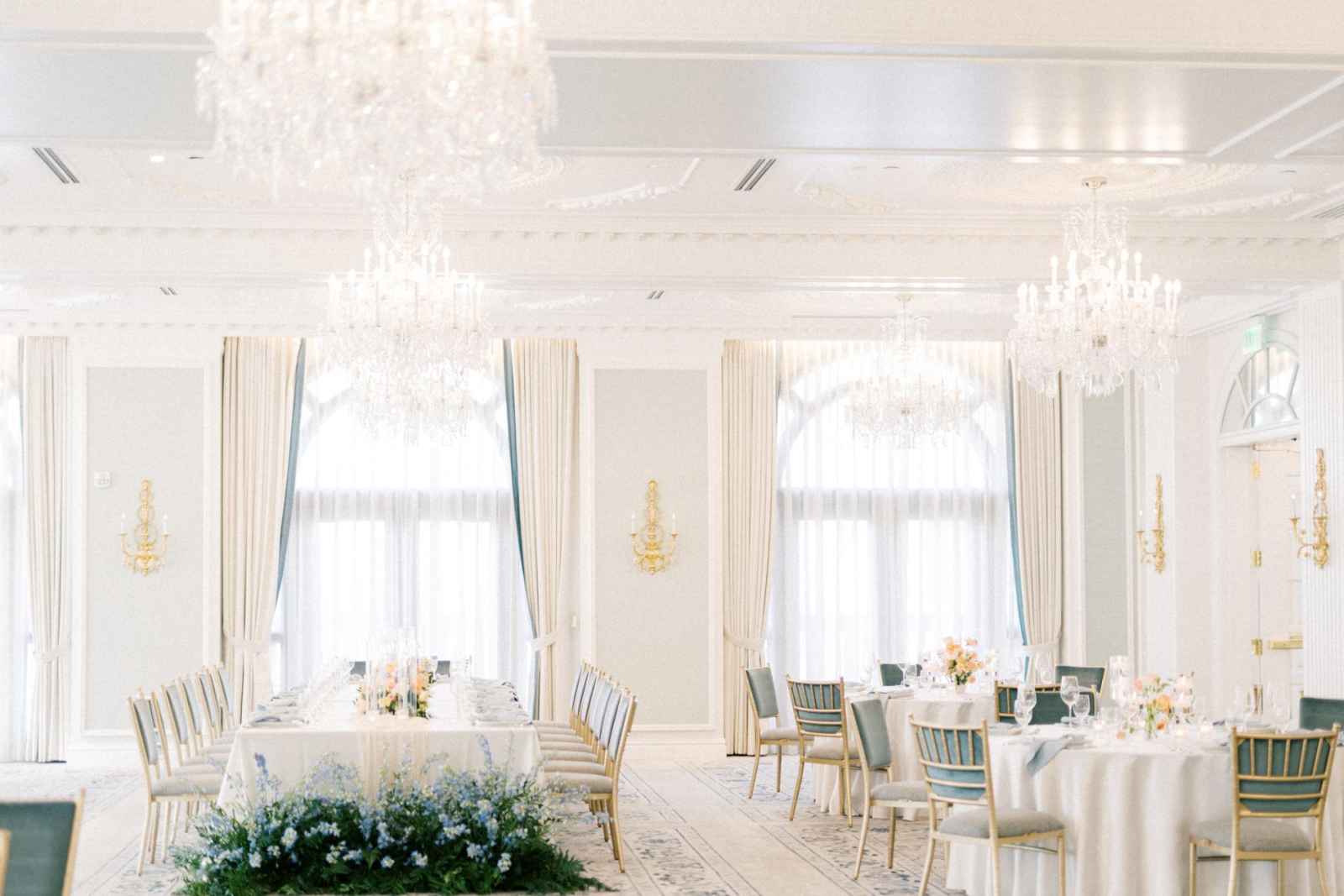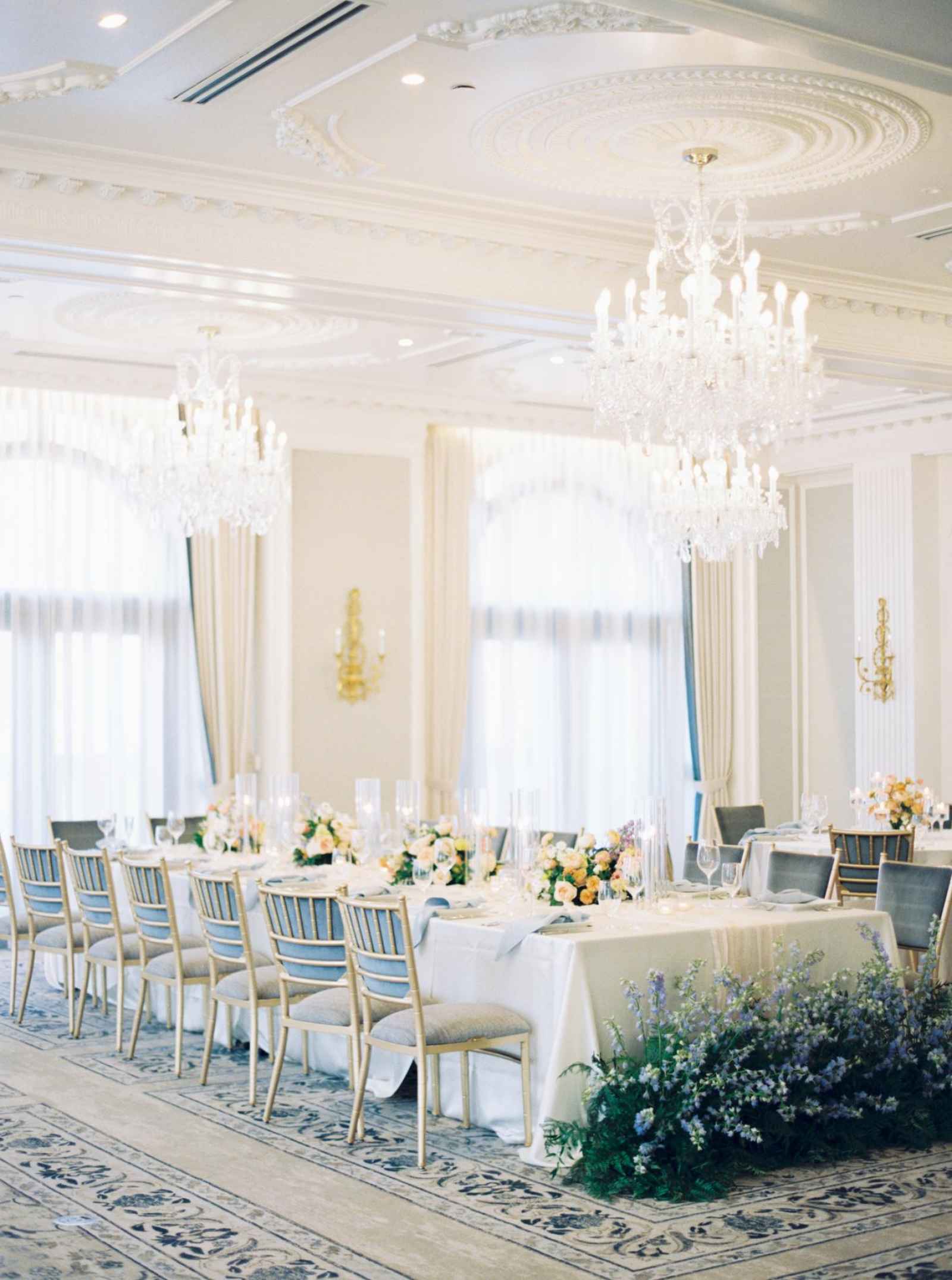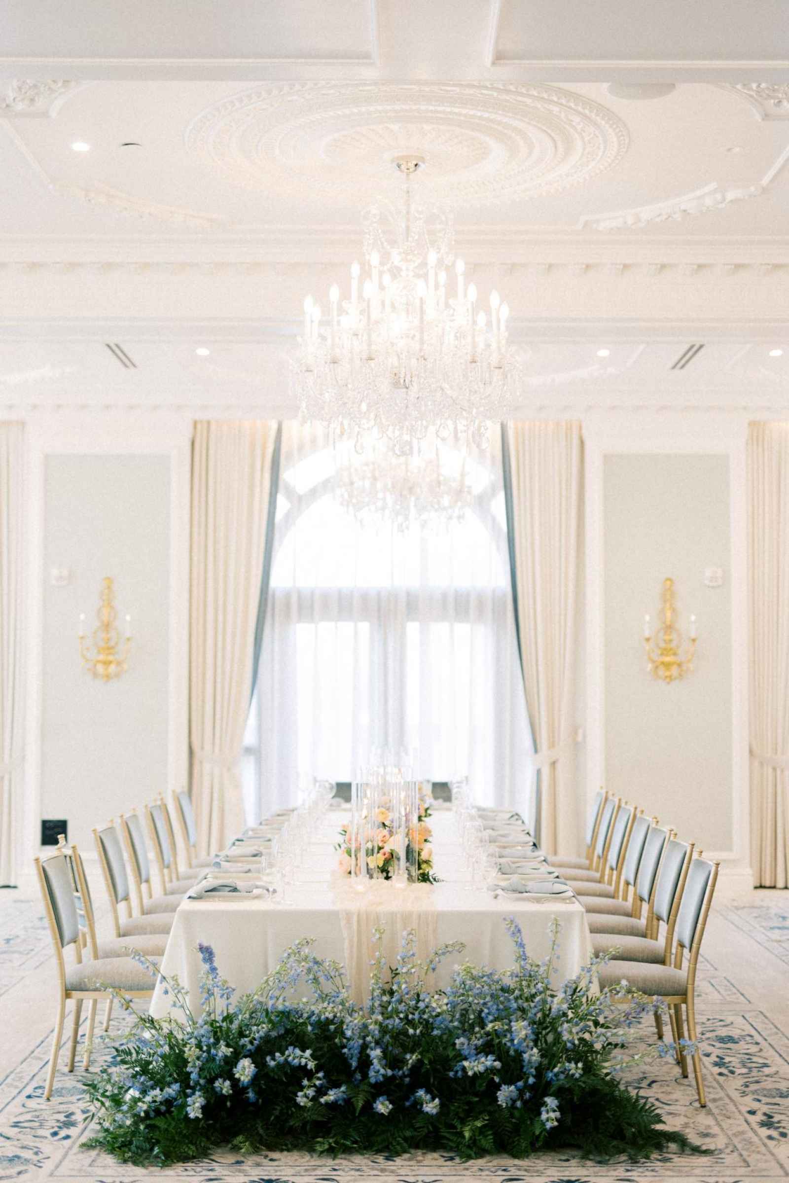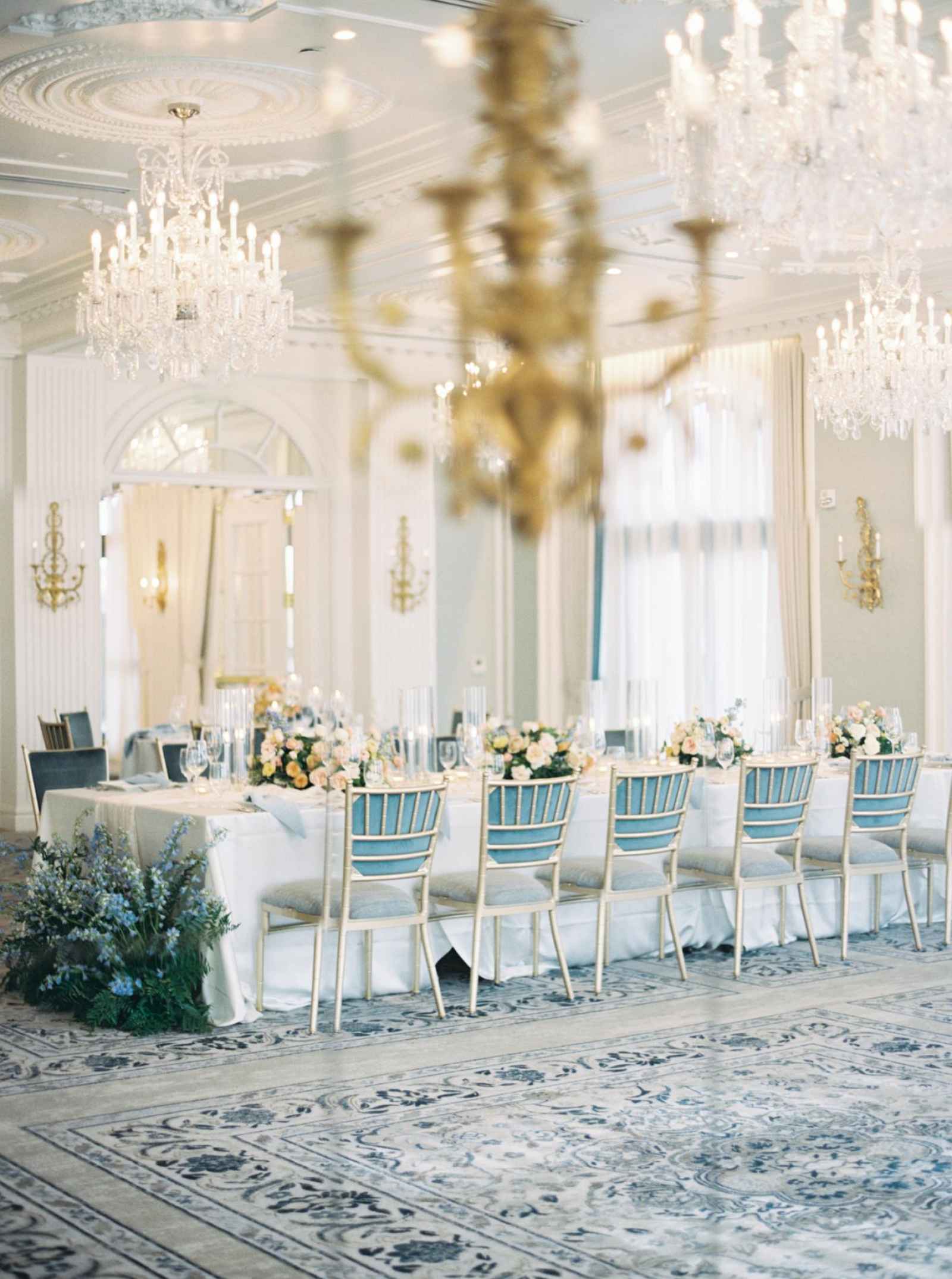 Duet Floral Studio designed whimsical and organic floral arrangements that gave this shoot plenty of romance! They chose to use clouds of blue delphinium to decorate the space and bring in the pop of blue that complemented the ballroom. The bride’s bouquet and centerpieces were the perfect spots to showcase the apricot color in the design. We love how the different textures help separate the colors in these arrangements even more and create plenty of balance in the shoot!