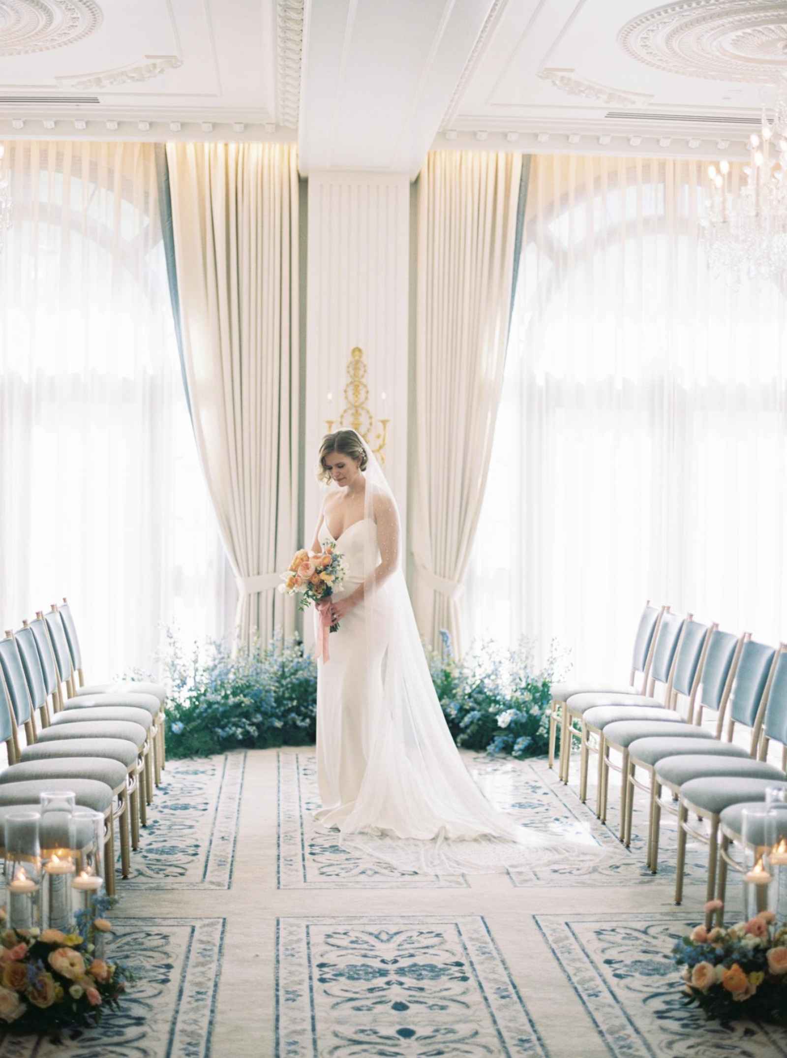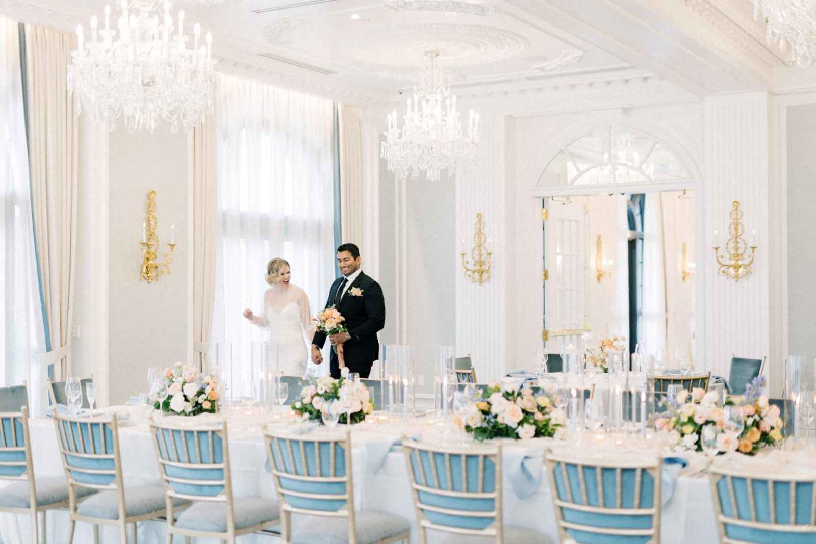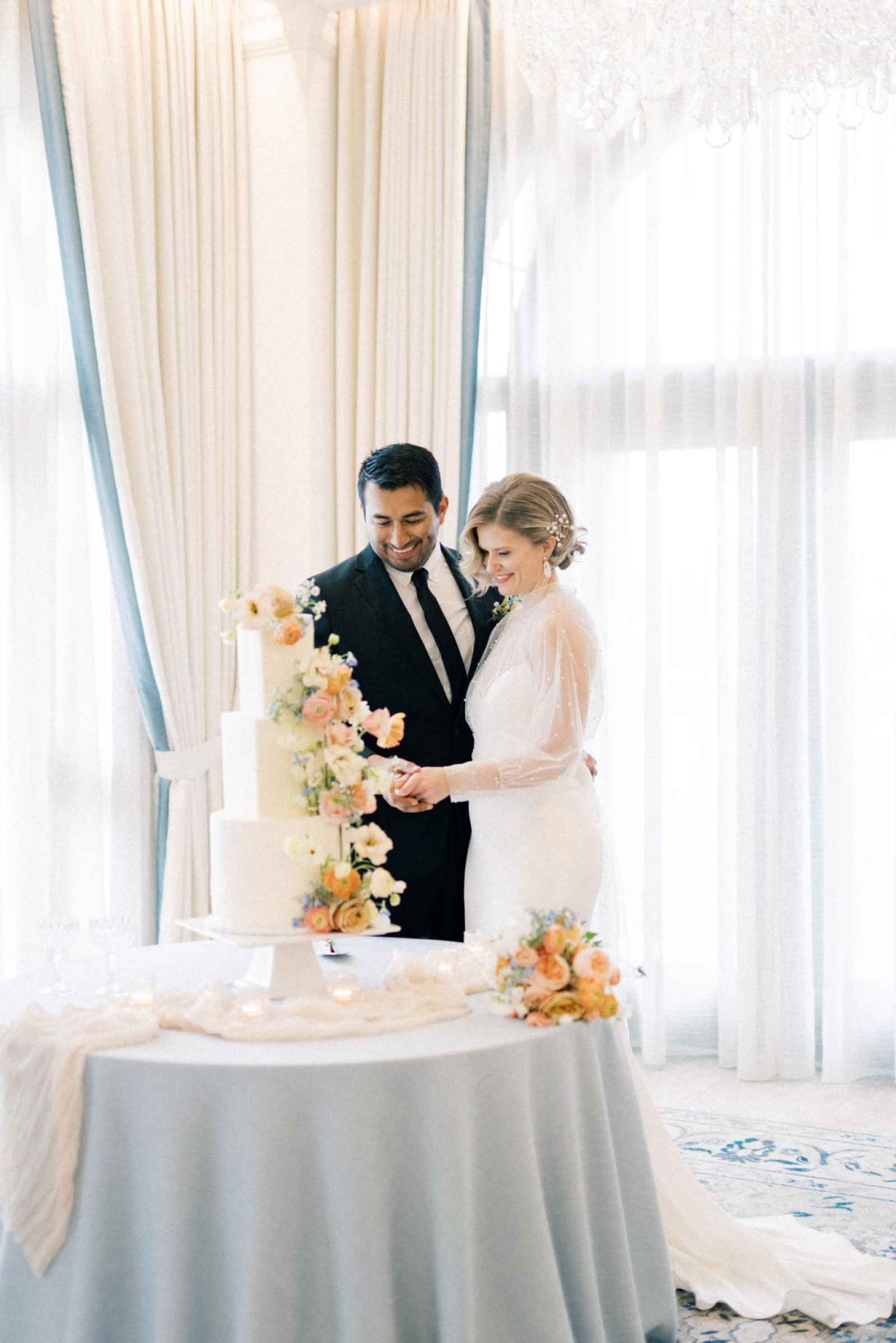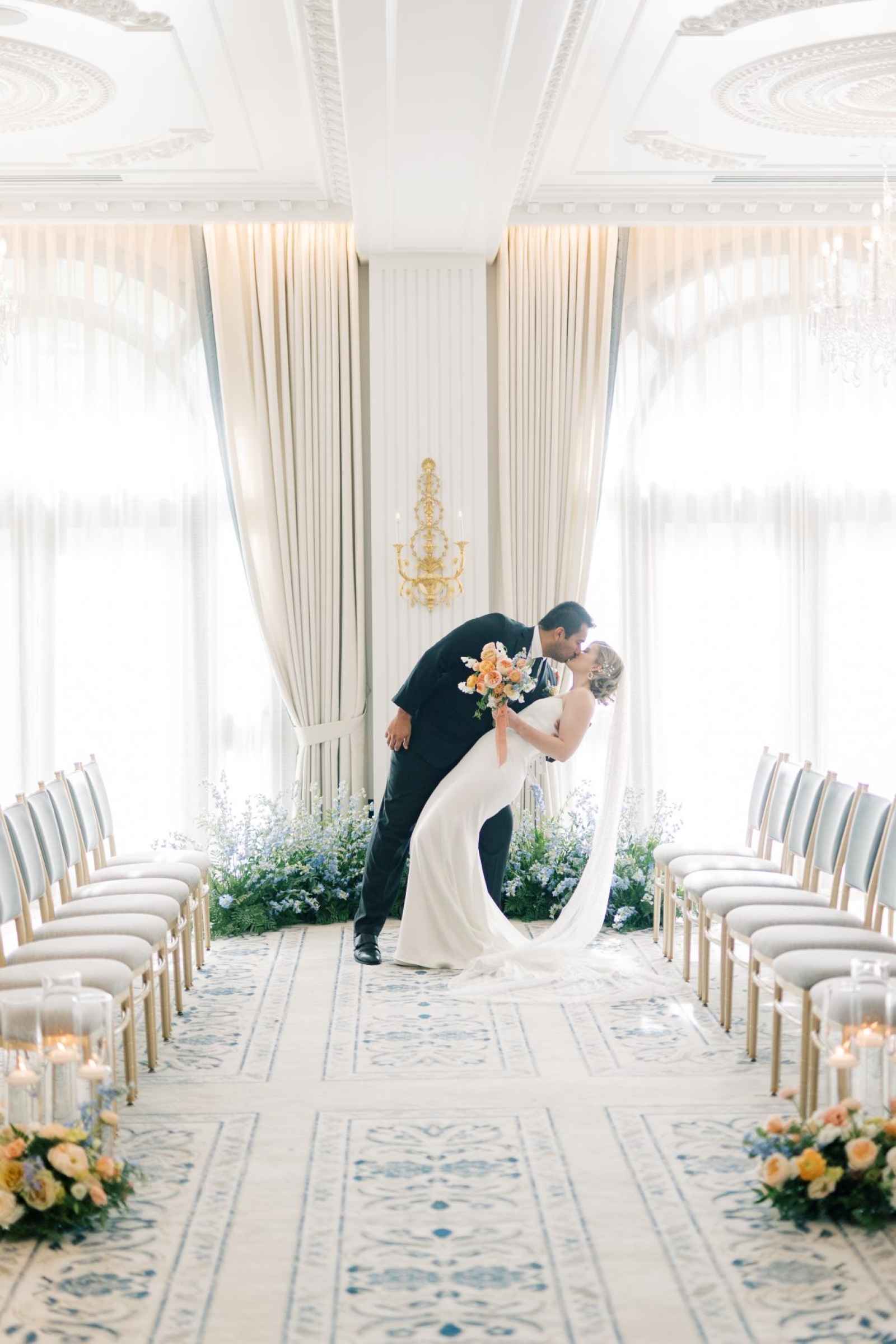 Duet Floral Studio designed whimsical and organic floral arrangements that gave this shoot plenty of romance! They chose to use clouds of blue delphinium to decorate the space and bring in the pop of blue that complemented the ballroom. The bride’s bouquet and centerpieces were the perfect spots to showcase the apricot color in the design. We love how the different textures help separate the colors in these arrangements even more and create plenty of balance in the shoot!