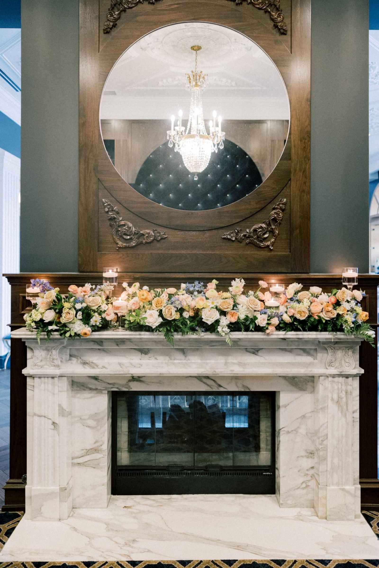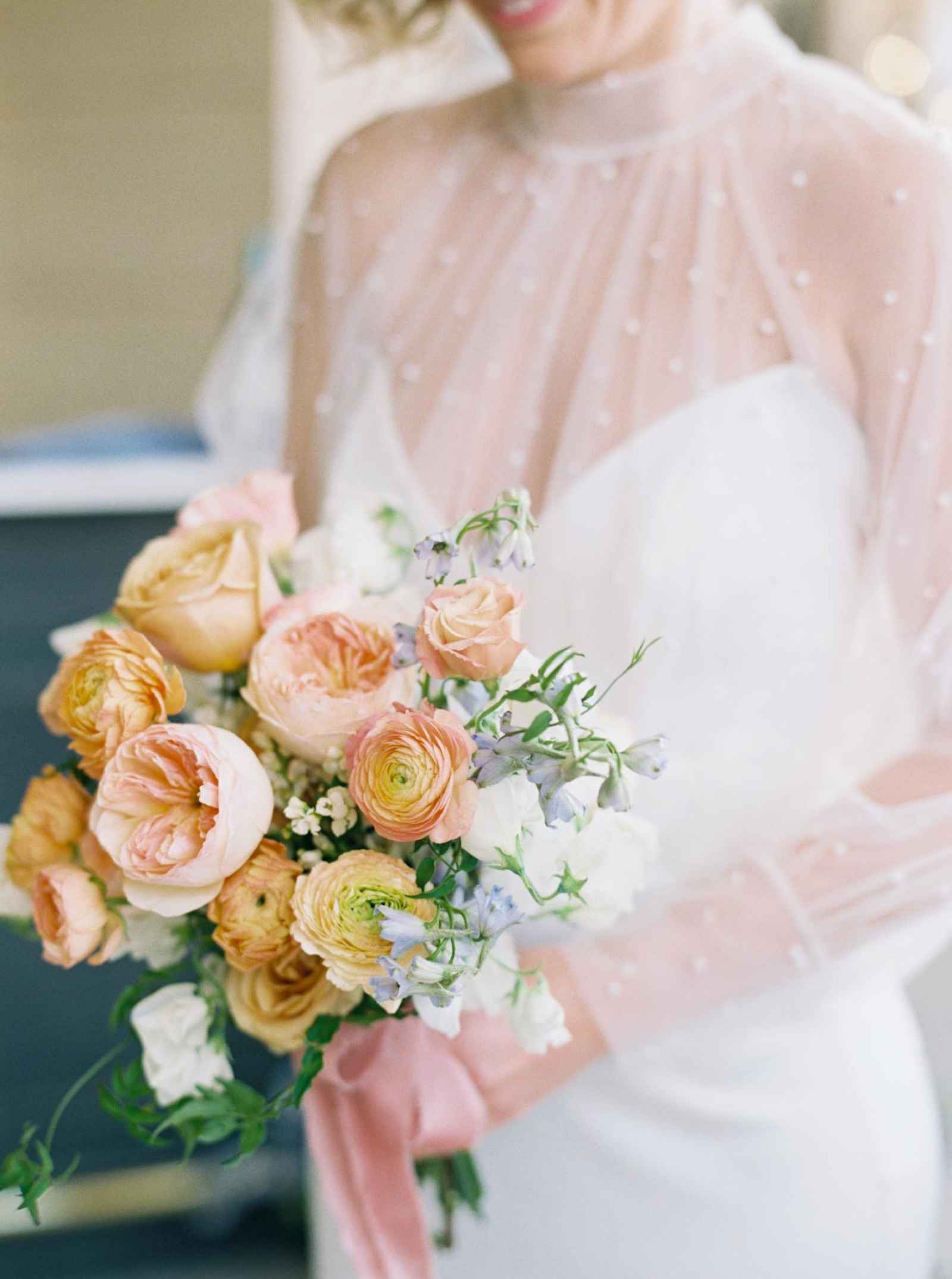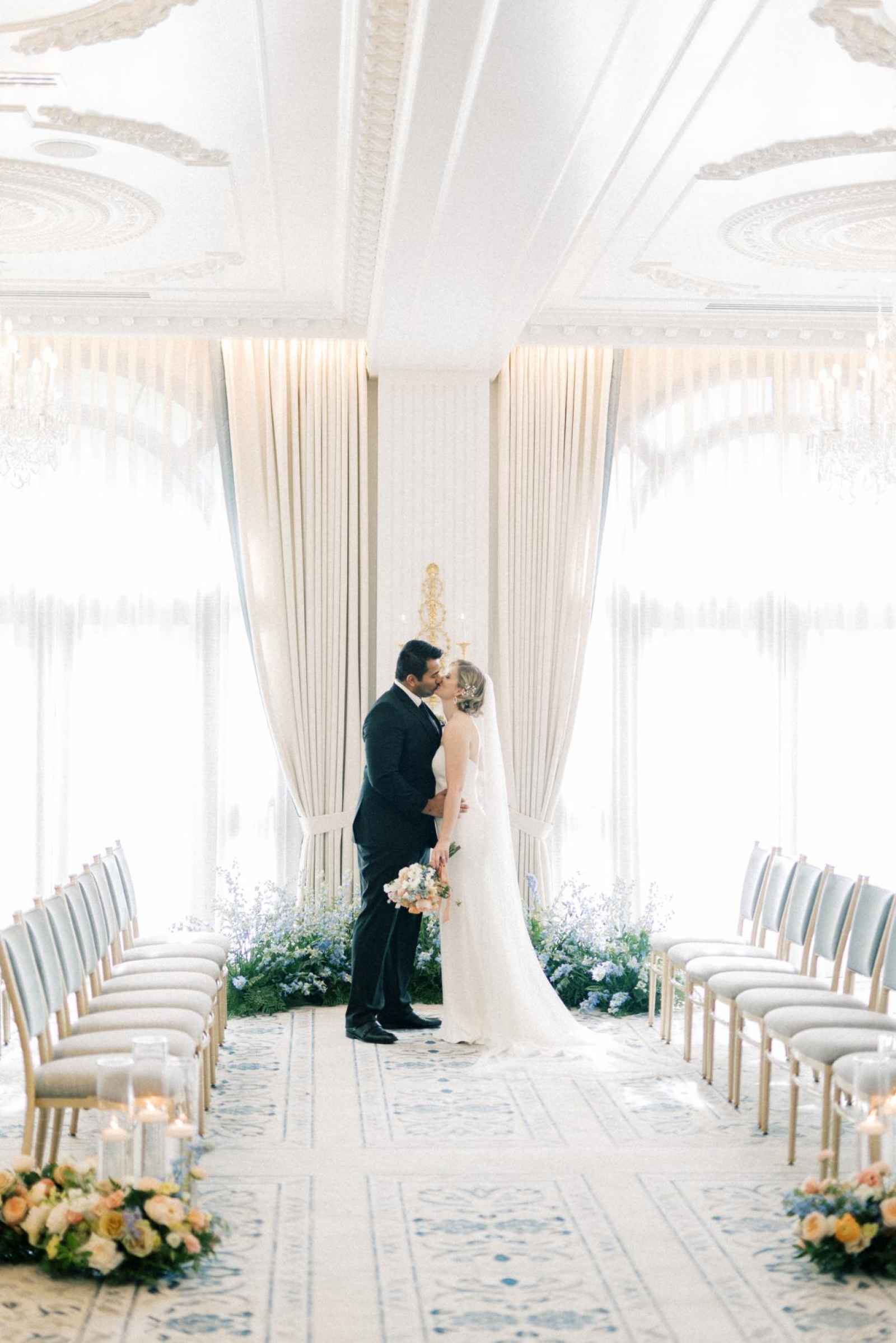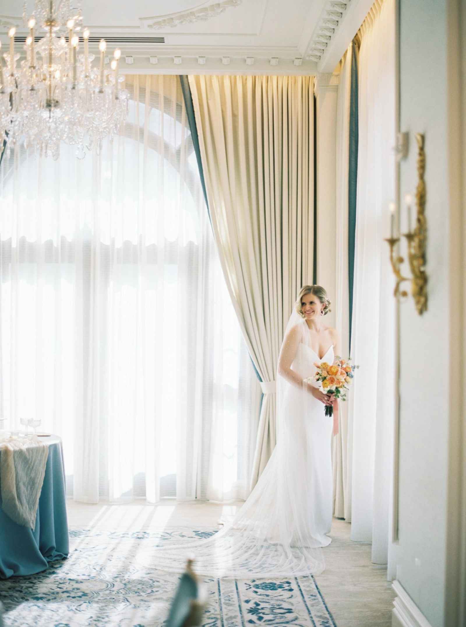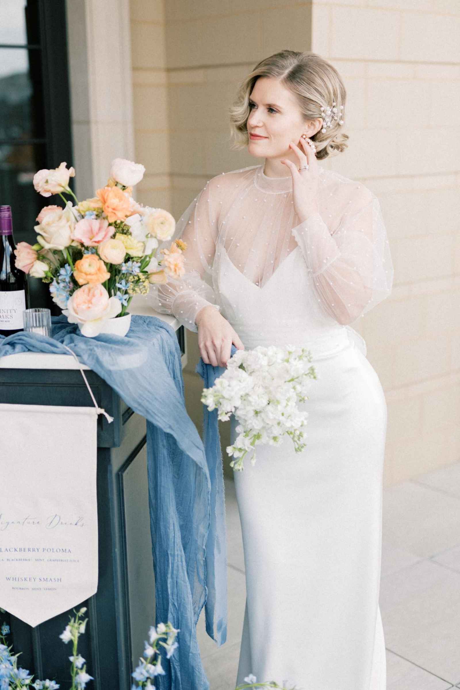 Duet Floral Studio designed whimsical and organic floral arrangements that gave this shoot plenty of romance! They chose to use clouds of blue delphinium to decorate the space and bring in the pop of blue that complemented the ballroom. The bride’s bouquet and centerpieces were the perfect spots to showcase the apricot color in the design. We love how the different textures help separate the colors in these arrangements even more and create plenty of balance in the shoot!