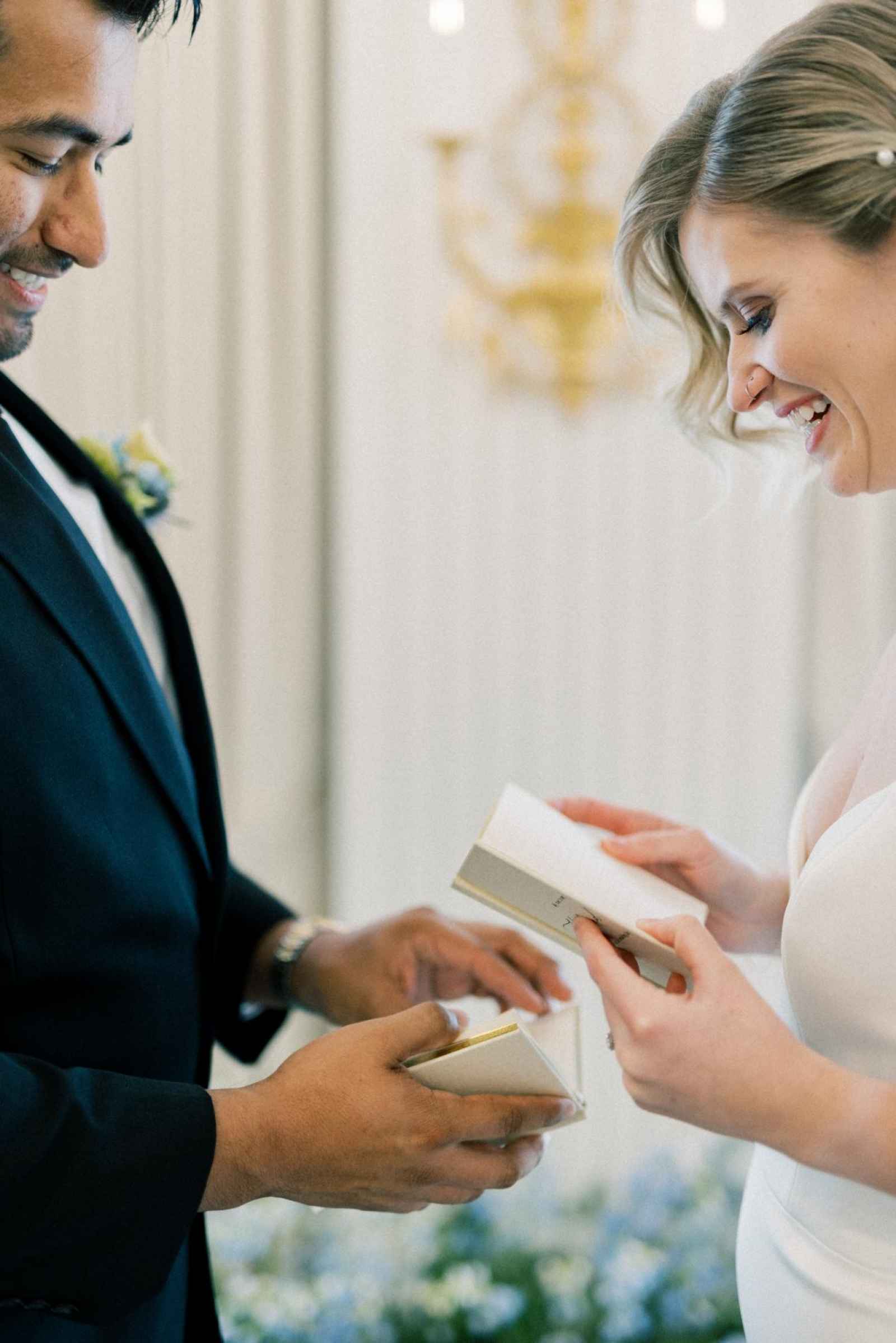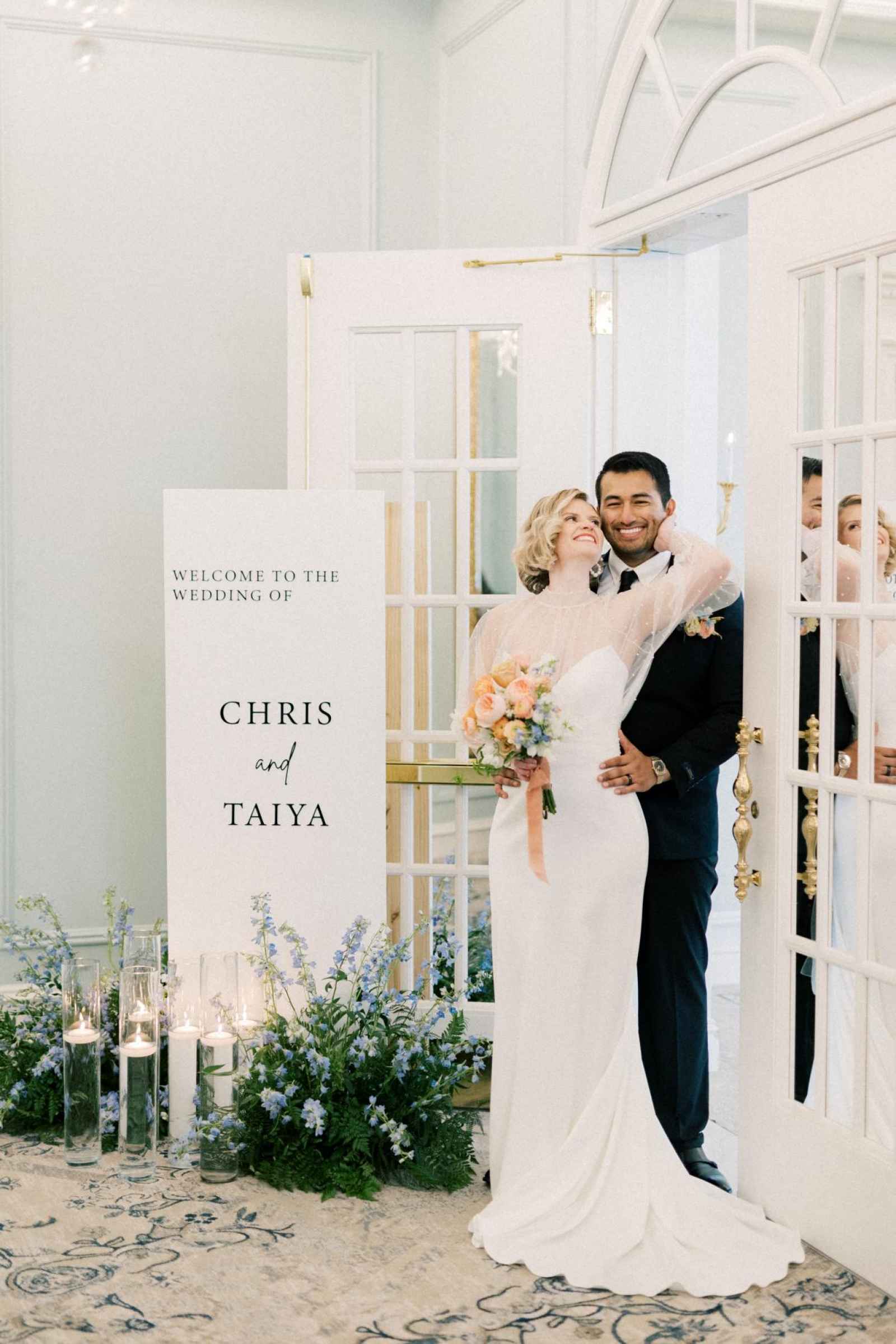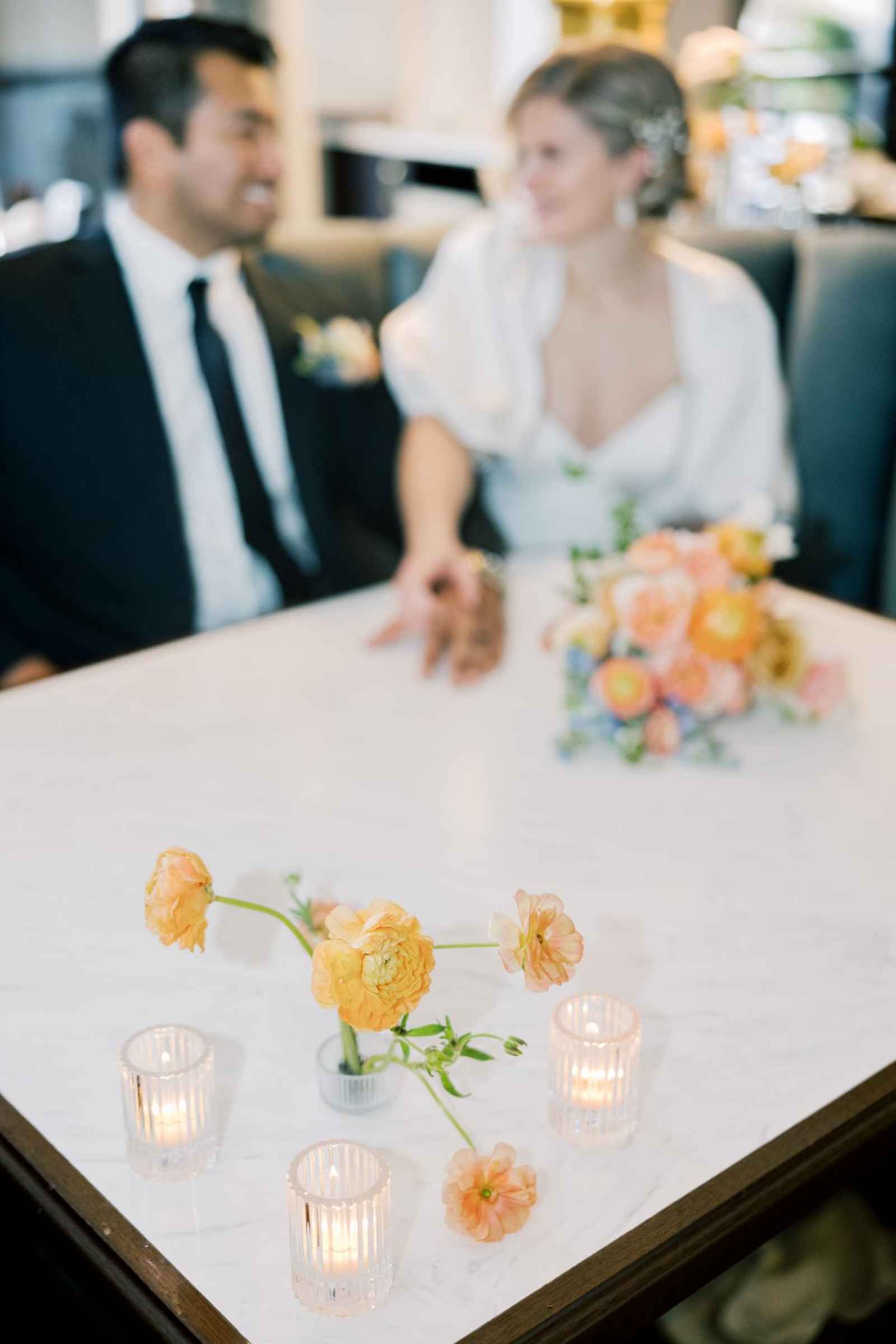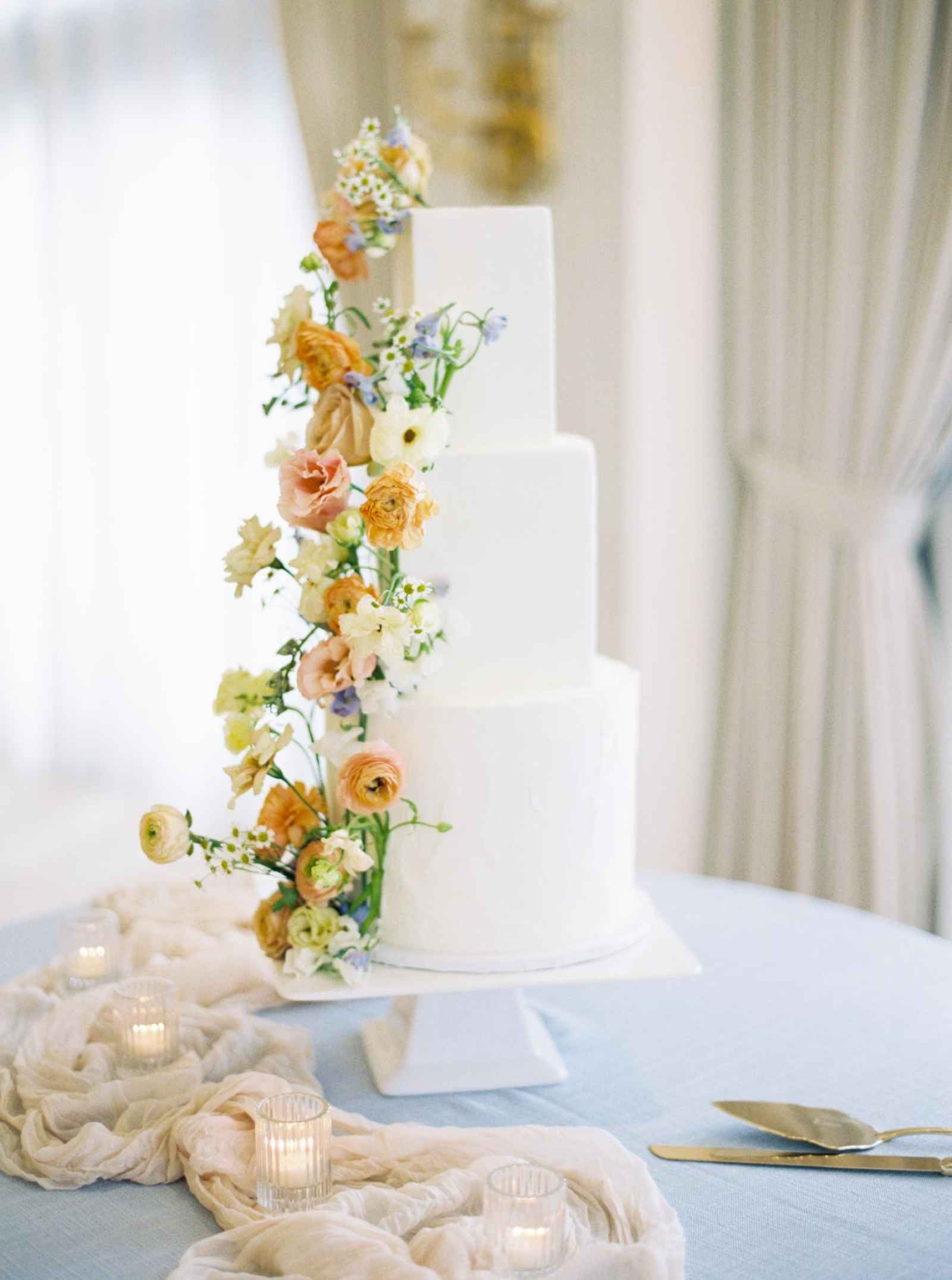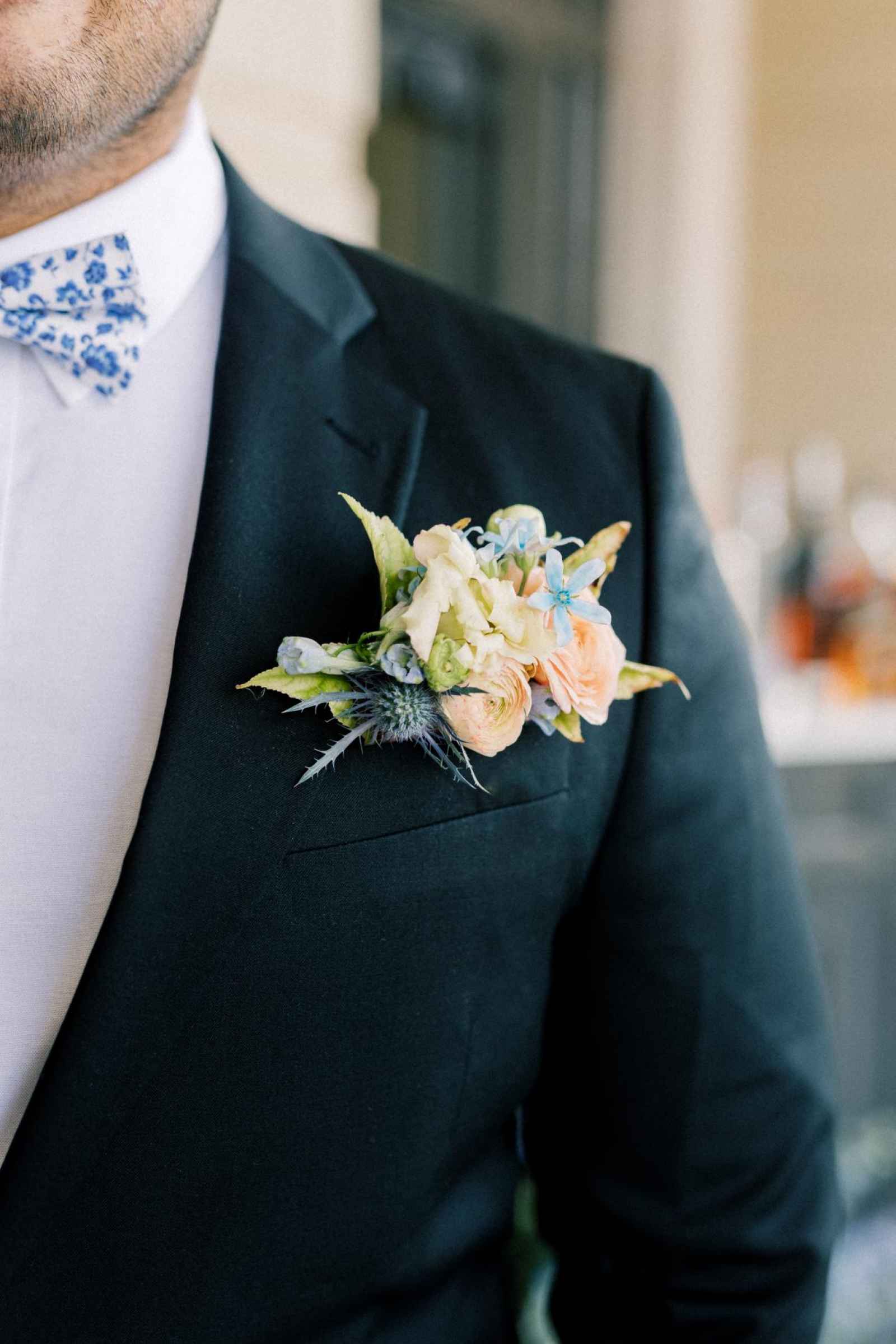 Duet Floral Studio designed whimsical and organic floral arrangements that gave this shoot plenty of romance! They chose to use clouds of blue delphinium to decorate the space and bring in the pop of blue that complemented the ballroom. The bride’s bouquet and centerpieces were the perfect spots to showcase the apricot color in the design. We love how the different textures help separate the colors in these arrangements even more and create plenty of balance in the shoot!