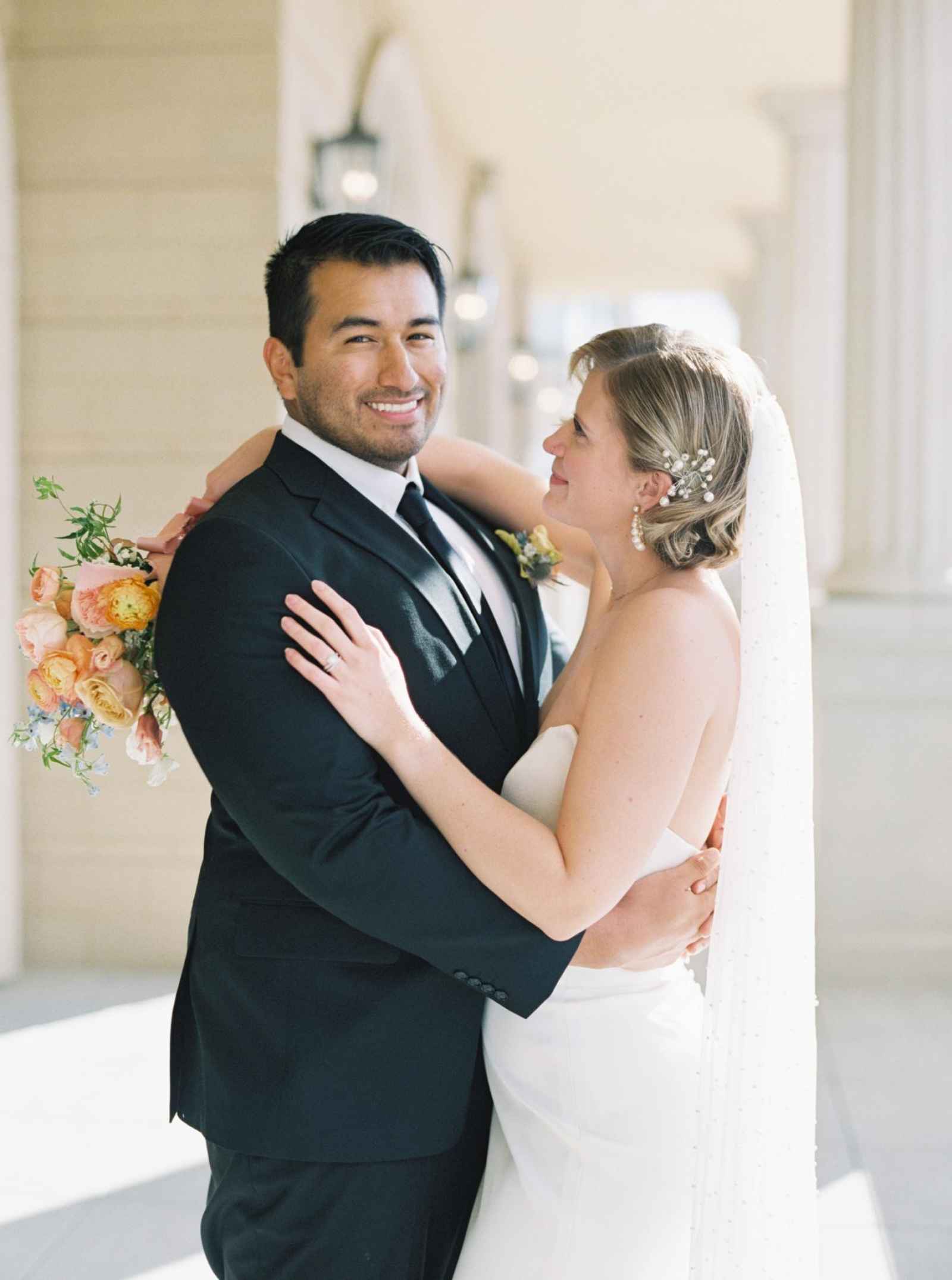 Ashley was looking for a timeless and classic dress to complement her design and The Frock Bridal had just the one! "The Collins dress is a simple luxe crepe gown with a strapless plunging V-neck. One of my favorite aspects of this gown was all of the embellishments that we were able to add to create more drama!" Ashley raves. These included a luxe crepe bolero, a pearl high-neck blouse, a large tulle bow and pearl armbands. We think it is so fun to be able to create so many different looks with just one gown! Both Wedding Hair with Ash and The Mane Bridal styled this bride with a clean and classic look. "Our bride had short hair so we chose a classic Hollywood wave and our hair stylist, Ashley, added a fun silver hairpiece," Ashley shares. The makeup was kept rather simple to highlight her natural beauty and to complement the timeless nature of the shoot. Two different ties and suspenders from The Bold Bow Tie completed the groom’s look.