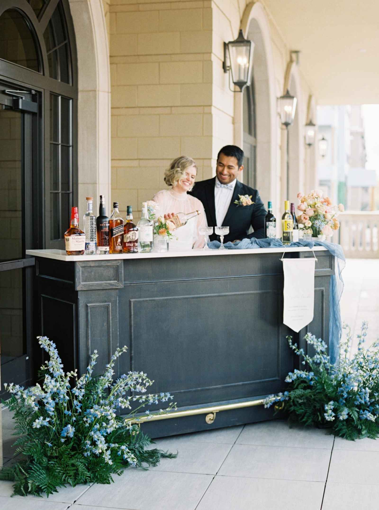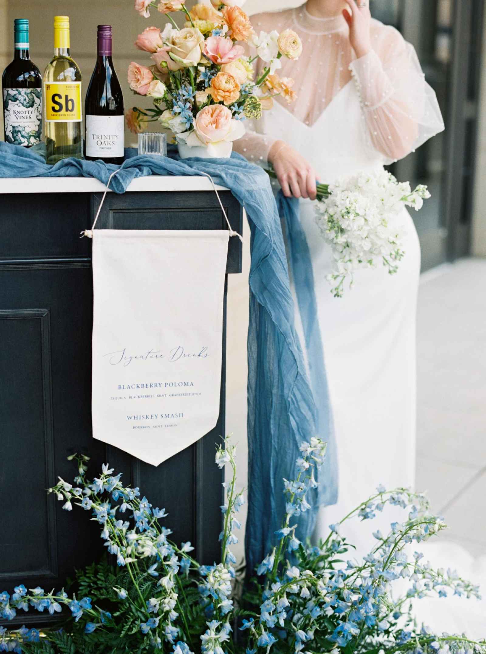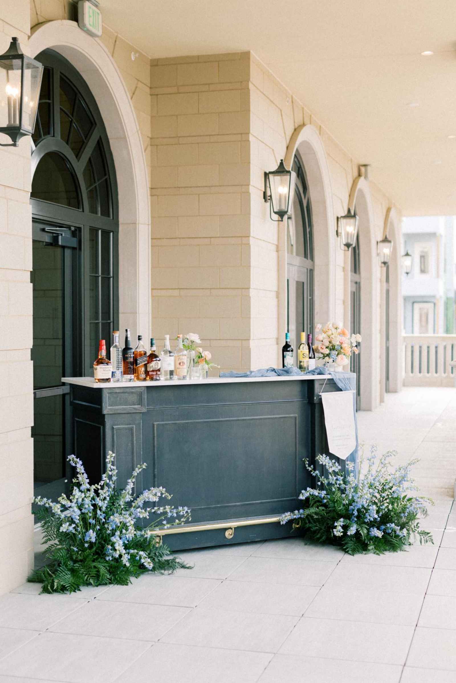 The hanging signature drink sign provides a touch of elegance to the bar setup while pulling in the light blue color scheme.