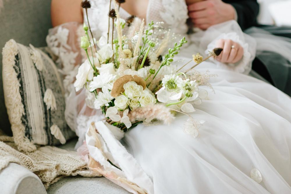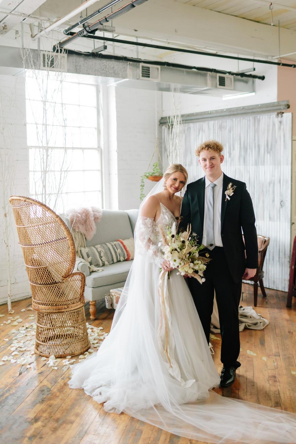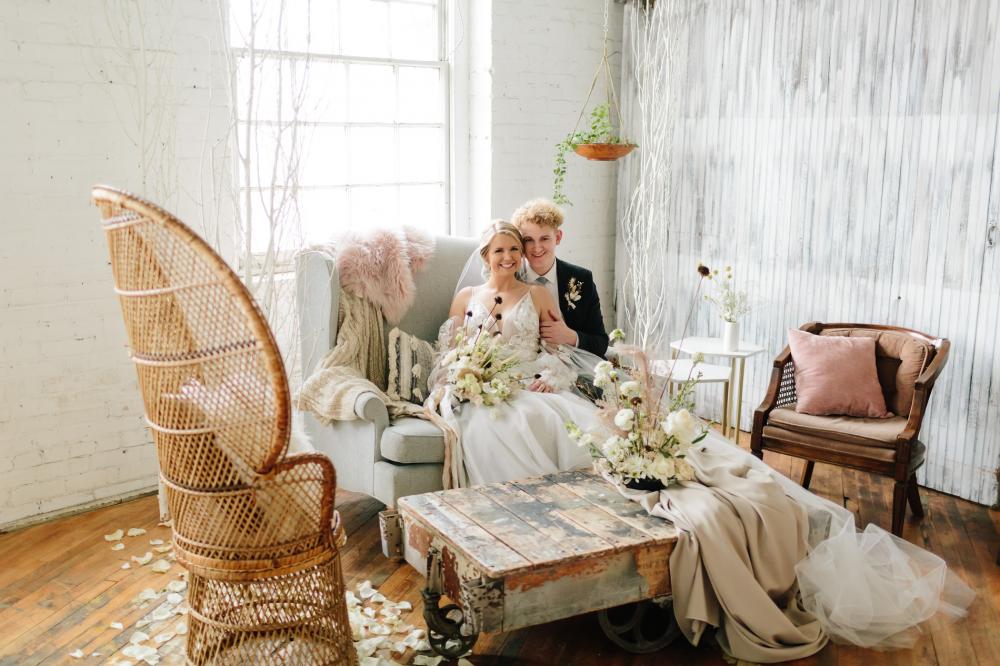Everything for the shoot came together perfectly to bring Laura's vision to life. The venue was the ideal spot for the shoot because it brought in a touch of industrial without distracting from Laura's idea. Laura shares, "I love that they already had lounge furniture we could choose from." We think the venue is the perfect backdrop and adds plenty of earthy tones and whites to create the feeling of winter nature!