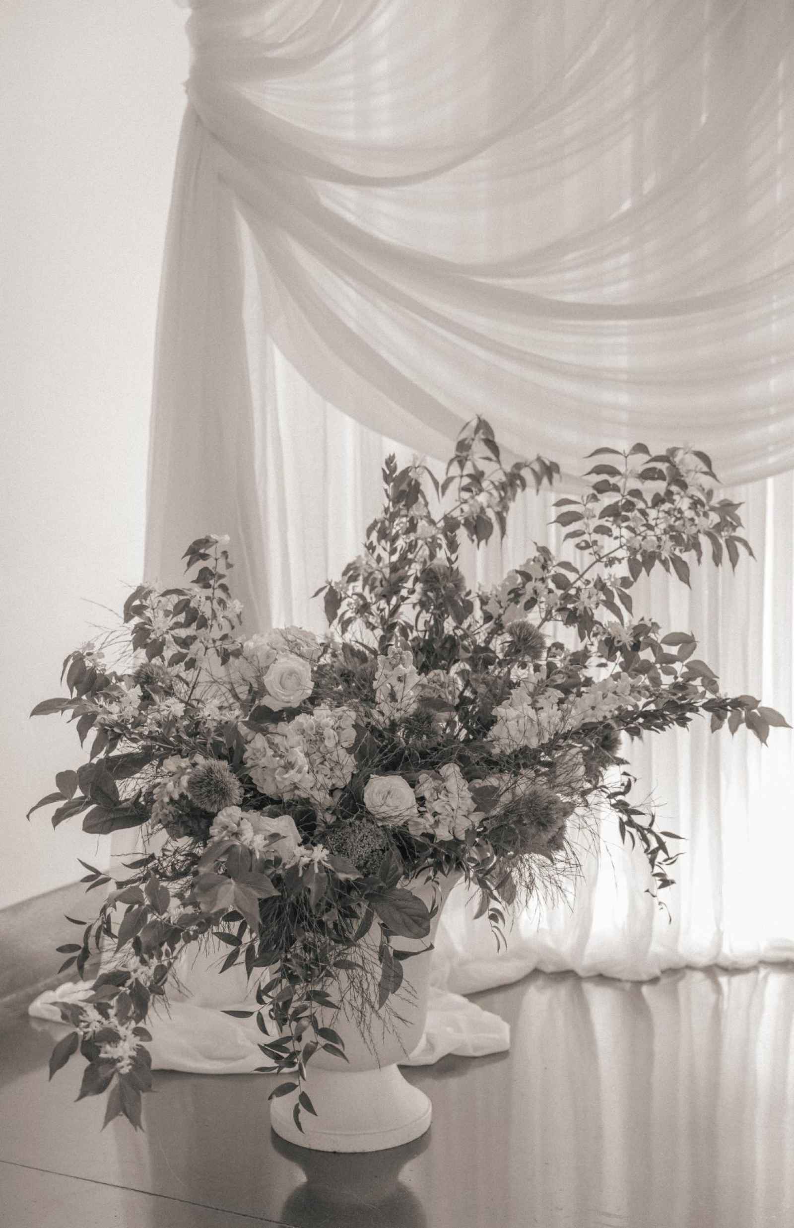 The arbor was draped in flowing fabric and cascading vines, anchored by grand urns overflowing with lush white and green florals. The bride’s soft curls and gently pinned tendrils completed the look, capturing a quiet, princess-like grace that felt both regal and modern.