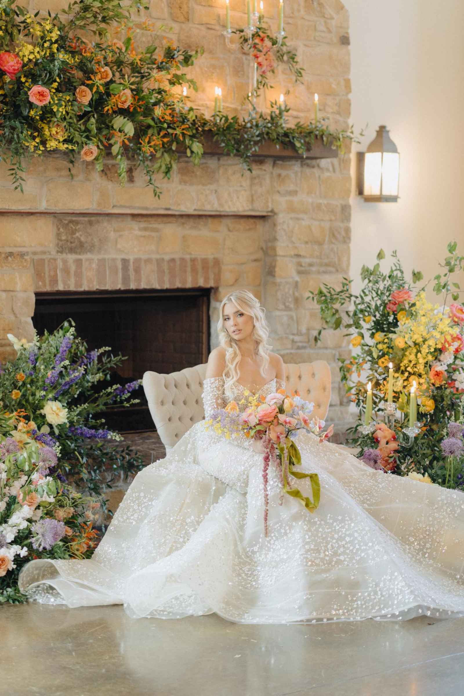 The warmth of the fireplace vignette evoked an intimate fairytale charm. With a palette of soft, romantic hues, the scene featured a statement-making fireplace adorned with overflowing florals and an abundance of candlelight and glowing candelabras. A bouquet tied with flowing silk ribbon completed the vision, while the model’s loose waves and soft floral accents enhanced the dreamy, timeless mood.