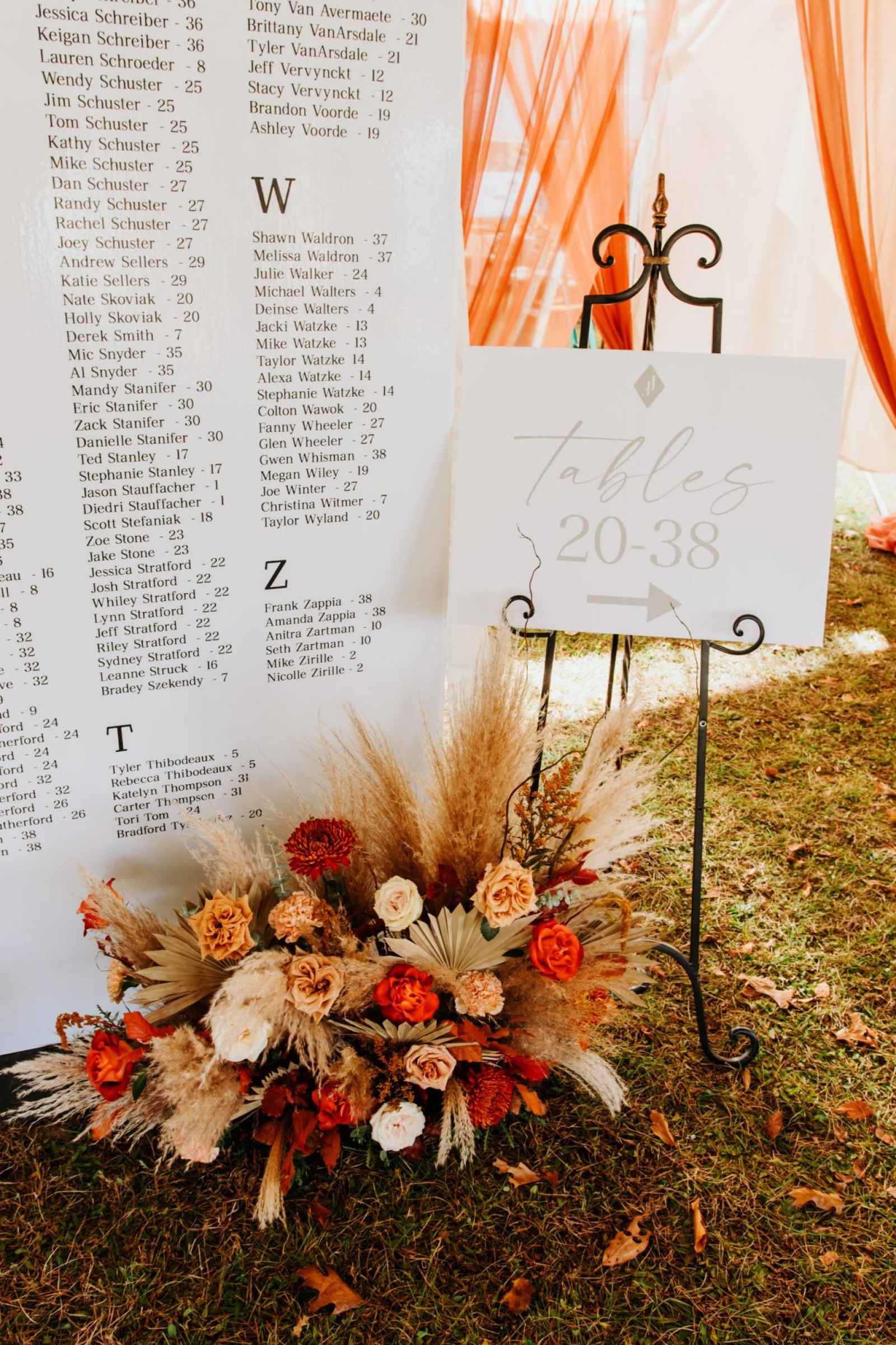 Knowing they wanted to have a large wedding, Jessica and Jordan’s main priority after they got engaged was to find a venue with plenty of space. With the help of Jordan’s family's business, Burns Special Events, the happy couple was able to find the perfect park venue to set up a large tent and celebrate the night away! Since fall is their favorite season and they were surrounded by nature, Jessica and Jordan envisioned a fall, boho celebration with the best décor and warm fall tones. “Burns Special Events really took our vision and took it to the next level,” Jessica raves. “From huge pampas grass chandeliers and a light tunnel to enter the wedding to personalized logos on the bars and personalized signage, it was all so beautiful!”