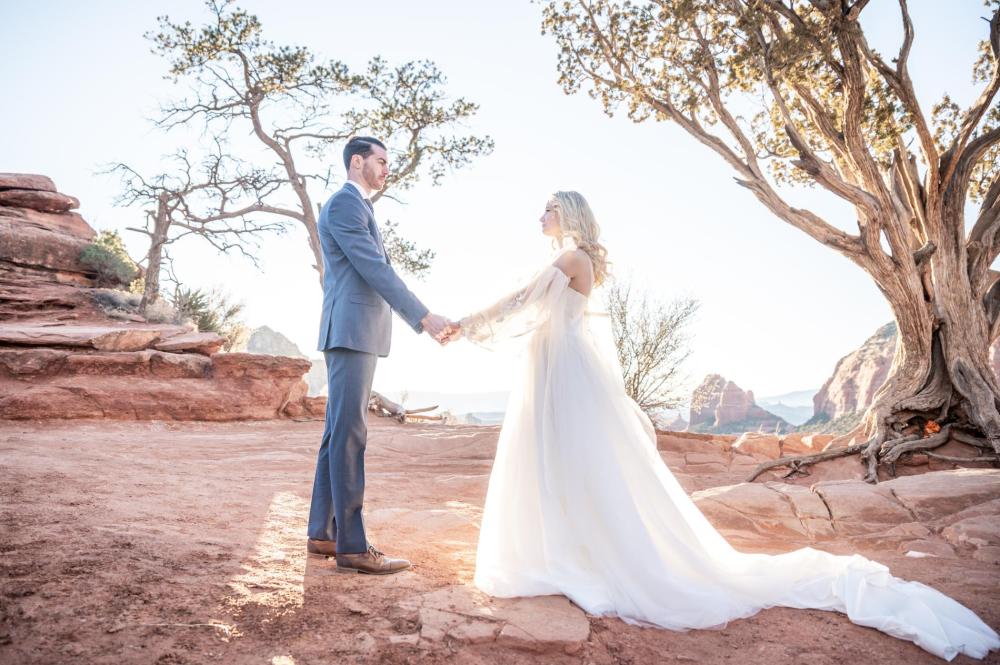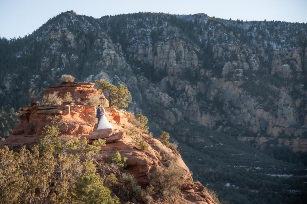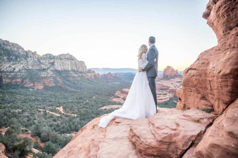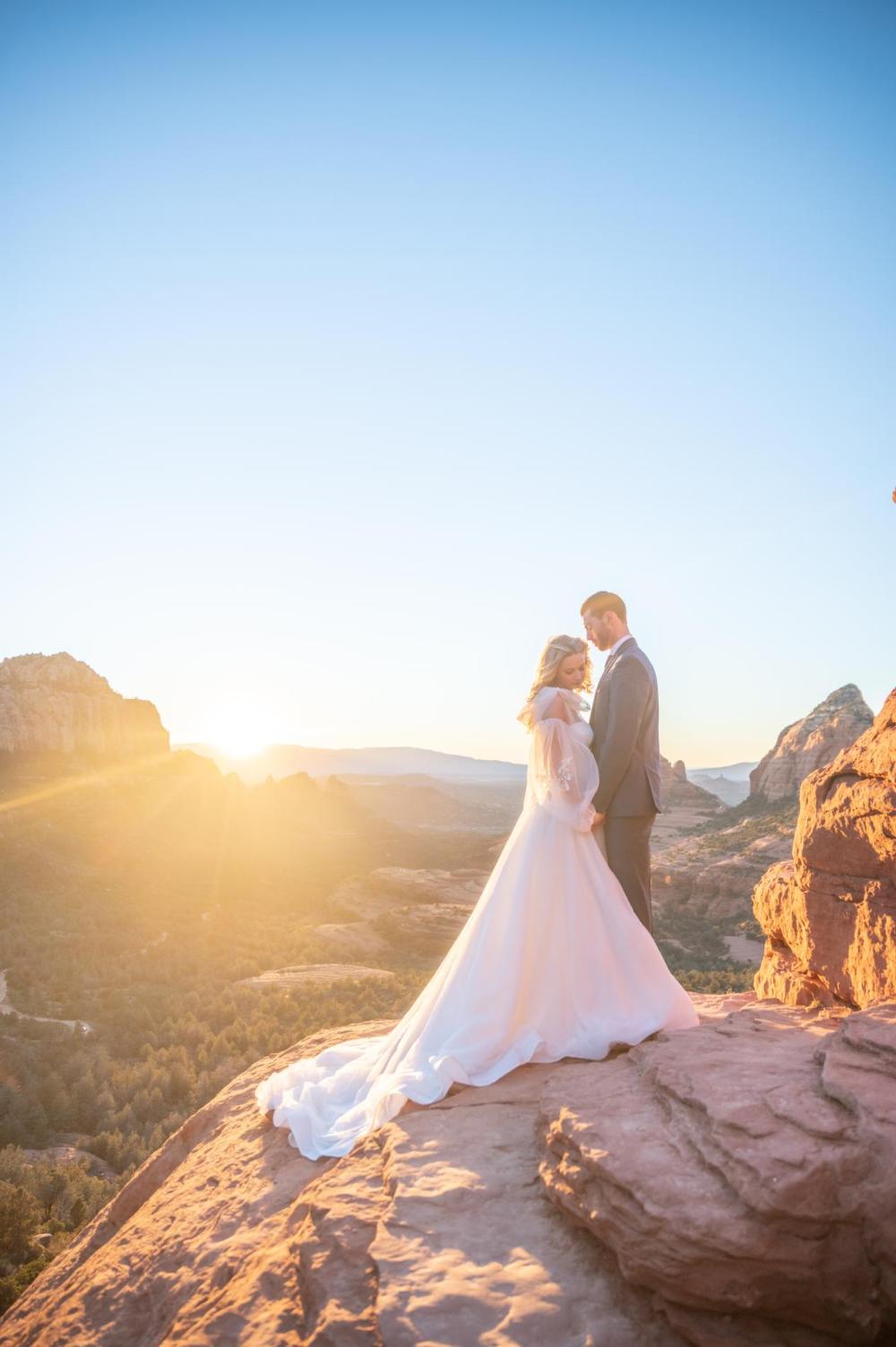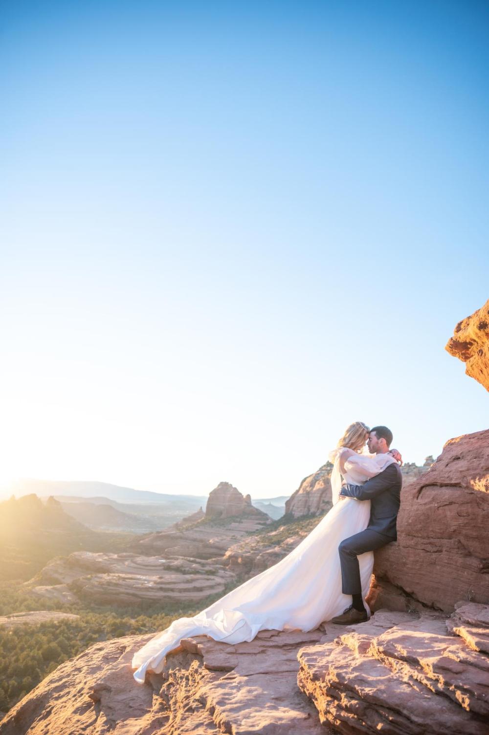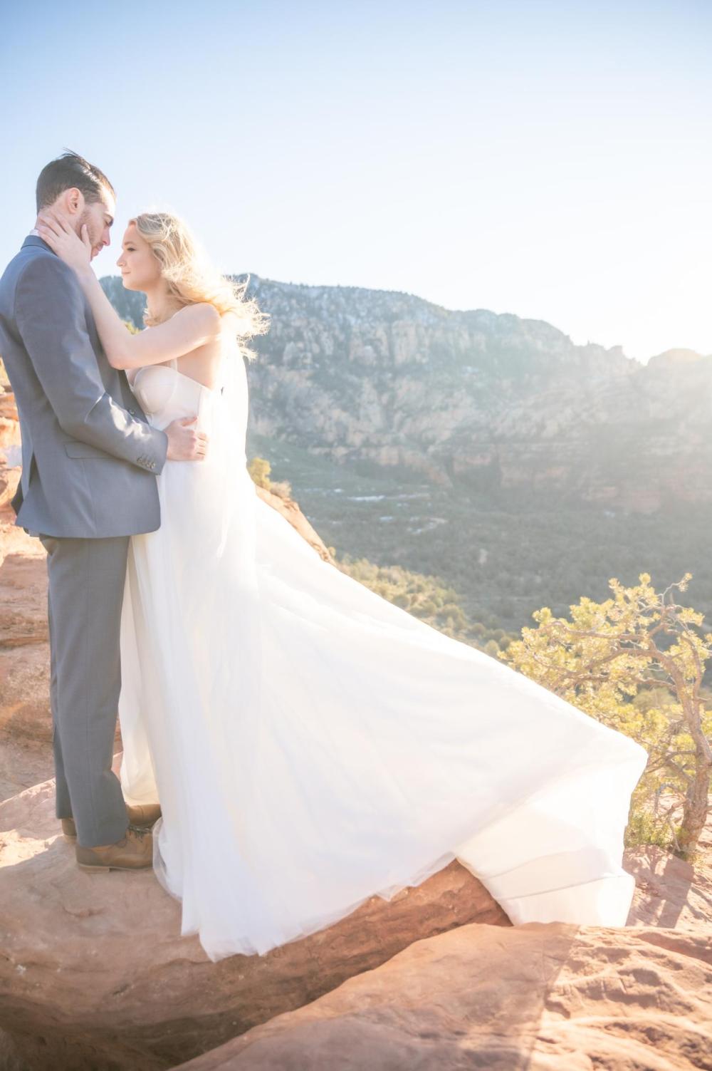 Heather Sherrill Photography had the idea to create a dramatic elopement to make the average Midwest bride rethink her wedding plans. Her vision for the shoot was to dream up an adventurous styled elopement to show off the beauty and the thrill of the canyons in Sedona, Arizona. To top it all off, the team managed to arrive at the valley in time to capture sunset photos for this ethereal shoot!