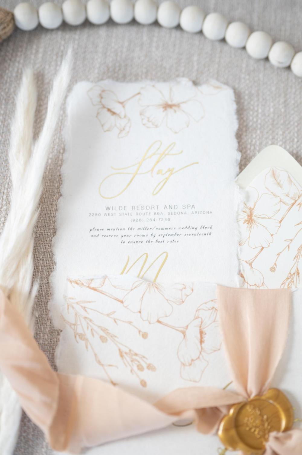 The color scheme for this shoot was curated to match the red rocks in Sedona. Using that as a jumping off point, the stationery designer was given full creative control and produced an amazing invitation suite. The floral details on the stationery as well as the soft reddish pink color is absolutely stunning and delicate just like this shoot!