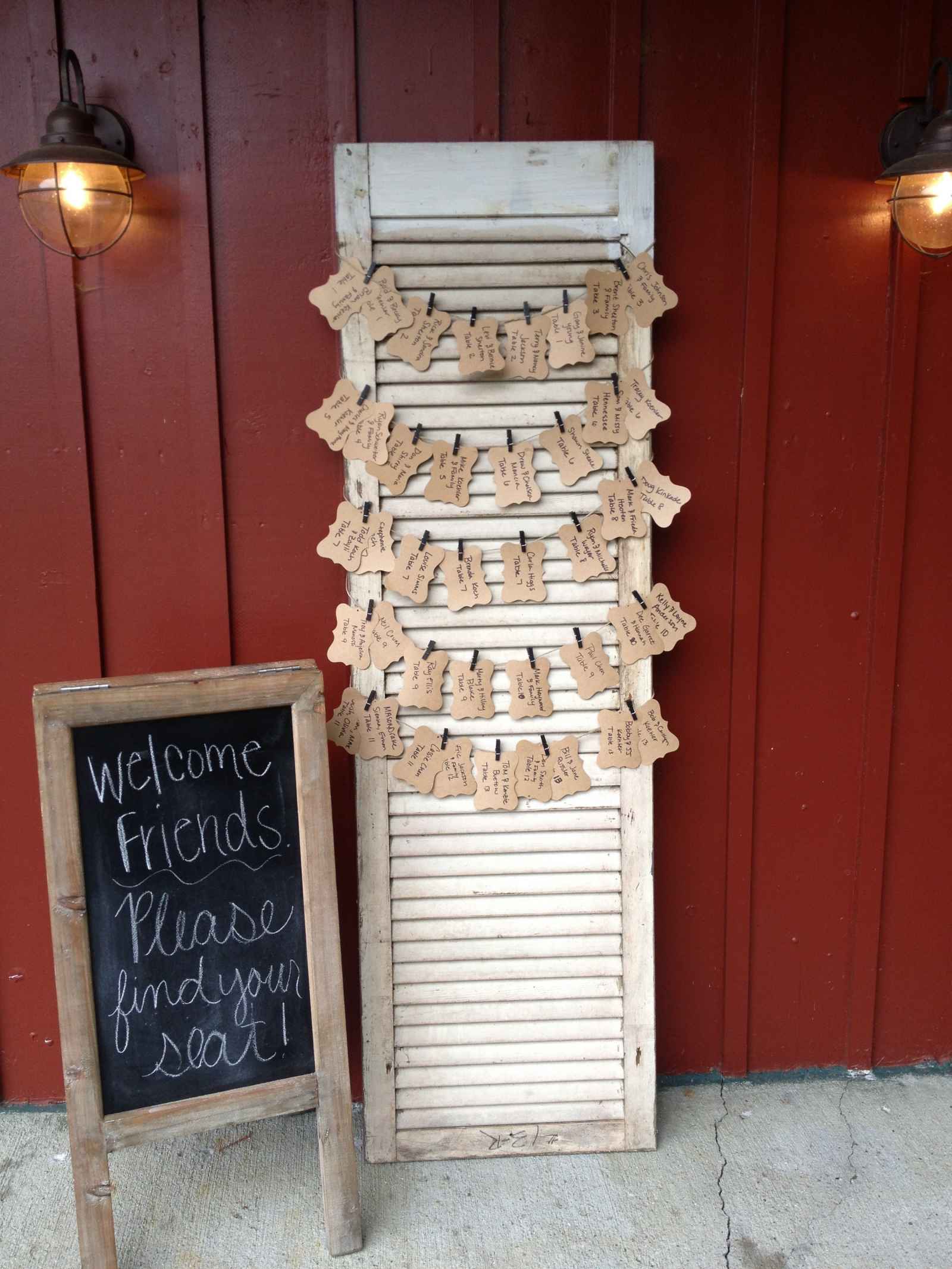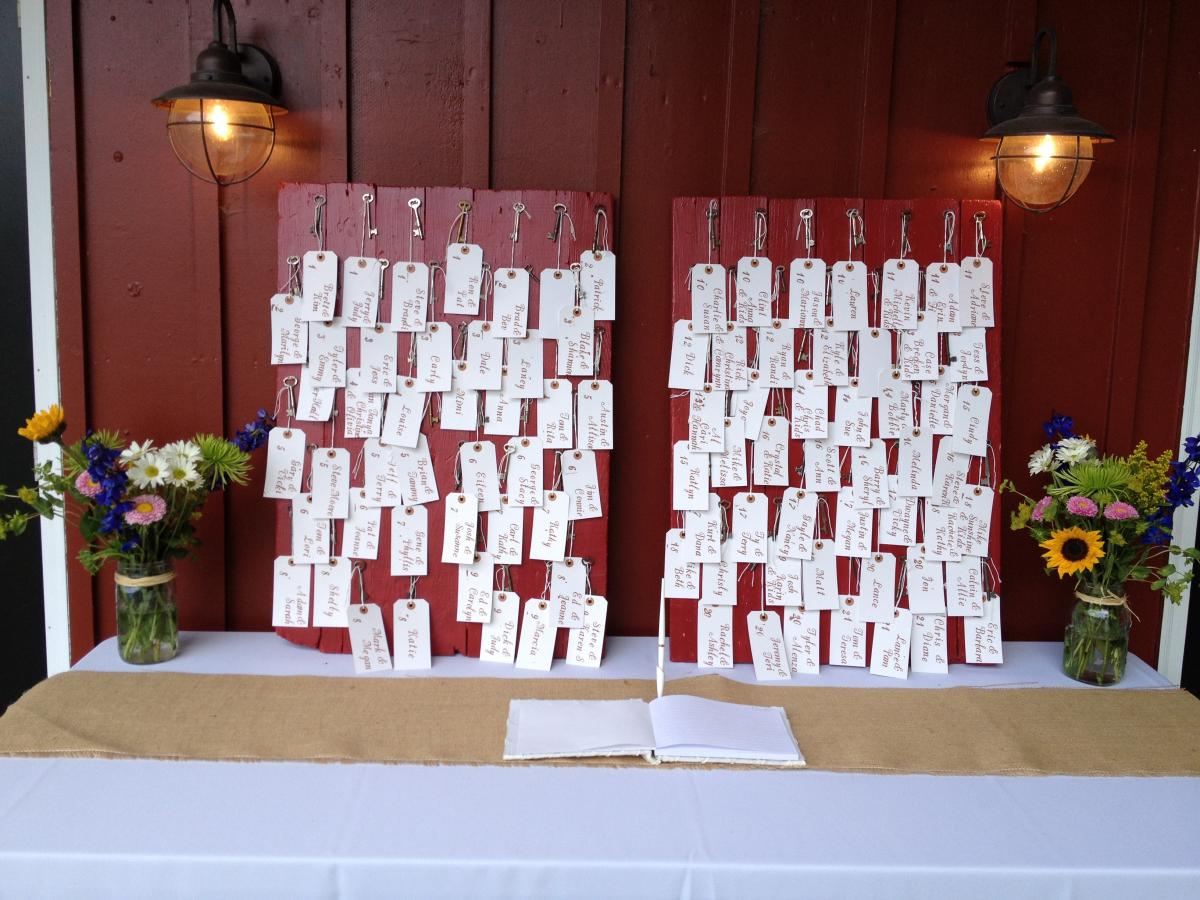 Try to make your display match with the theme of your wedding, or even try to bring out your personal style. Some popular rustic chic ideas for escort displays (see attached photos) are window panes with guest names and tables numbers written in white ink, exterior window shutters with guest names scrolled on kraft paper and pieces of wood siding painted in an eye-catching color with guest names penned on tags.