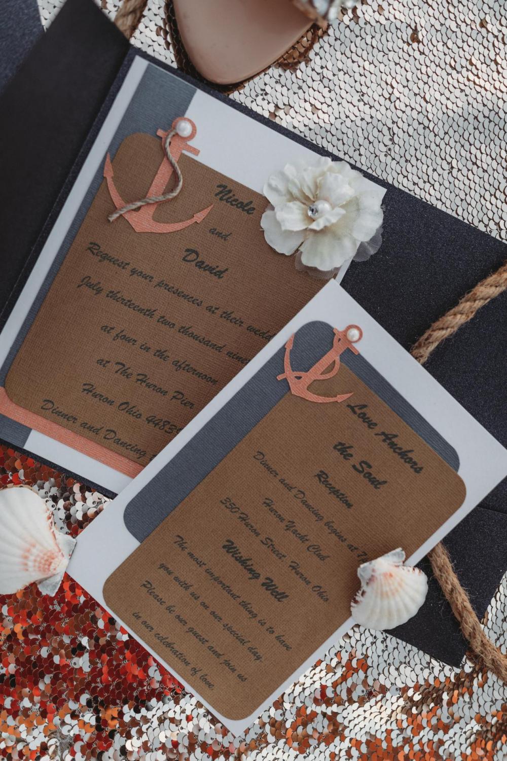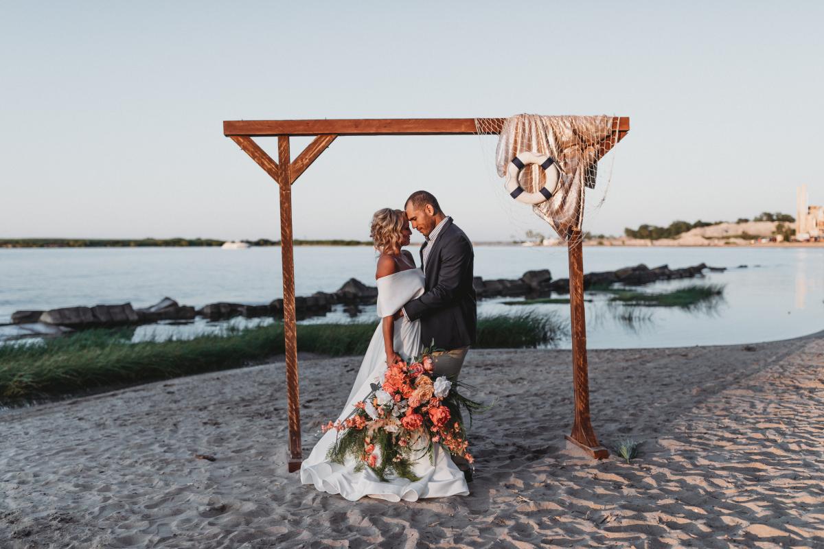 This shoot brings a touch of sparkle to a natural beachy elopement. Danielle Browning of Dashing Designs wanted to showcase how lovely Lake Erie can be during the fall season, and titled this shoot “Nautical Glam.” “Small town meets bold and the beautiful is exactly what I wanted to convey,” Danielle explains. “The challenge with a small public beach is that you only have a short window of time to get just the right shots in, but nature managed to provide us with the perfect evening and sunset background.”