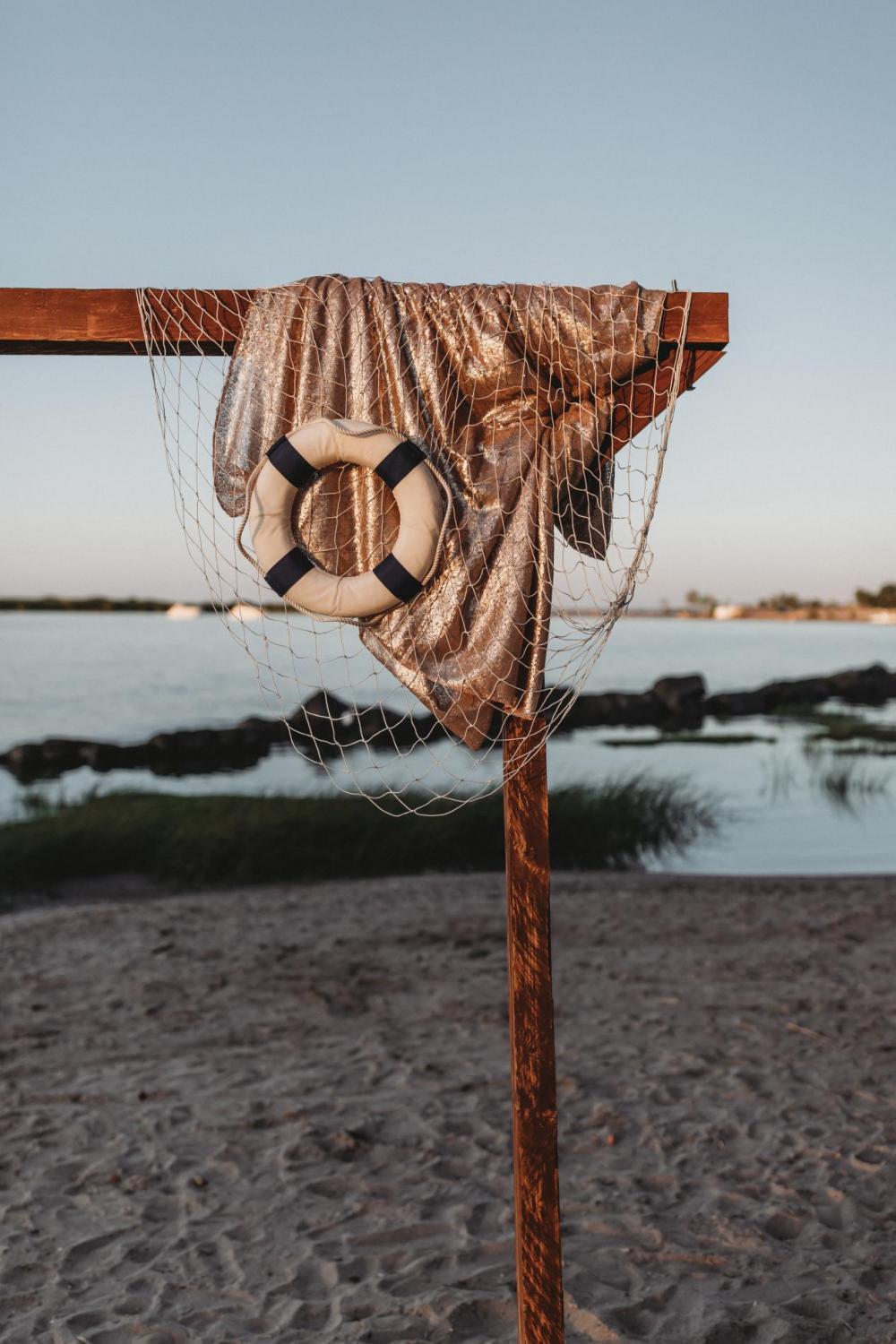 The tablescape’s natural vibes make us want to sit and stay a while! We love the touches of the navy and white satin linens, seashells, and gold/copper tones from the glasses. The sequins make this shoot sparkle with romance! Because Danielle envisioned this elopement to be simplistic, she opted not to have a cake. But that ceremony arch certainly steals the show!