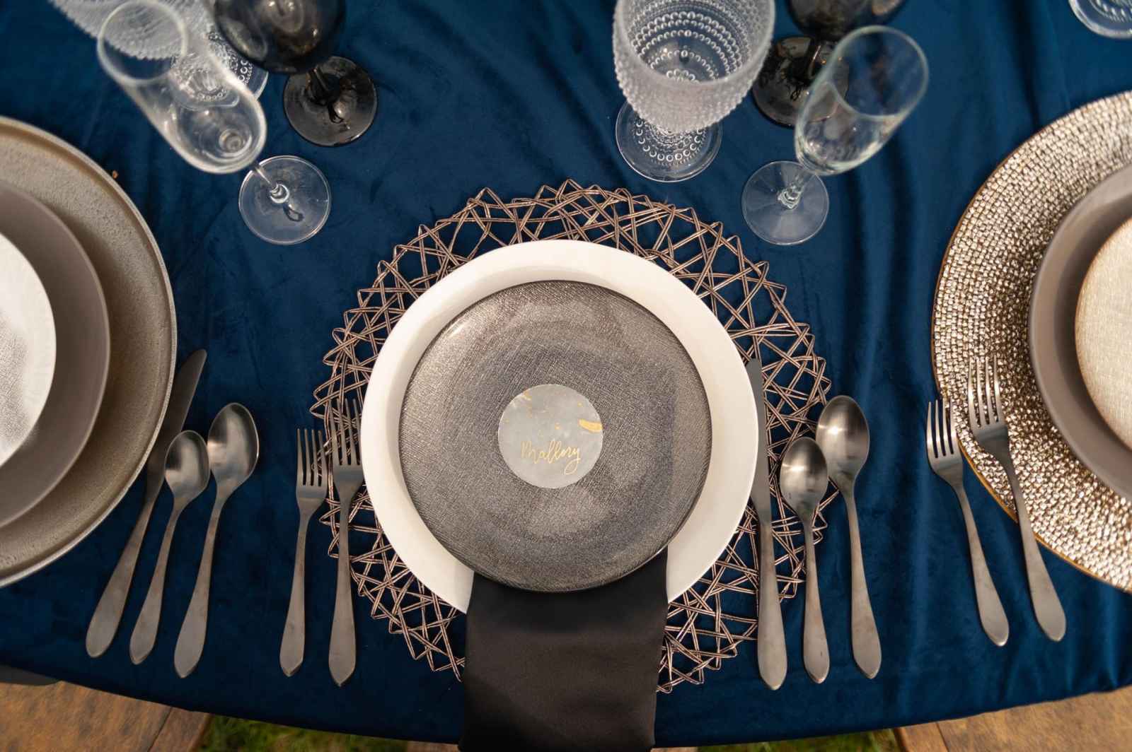 The keys to the lovely decor? Rich, navy velvet, mixed metals, glam stationery, loose, romantic signage and some pretty special guests.