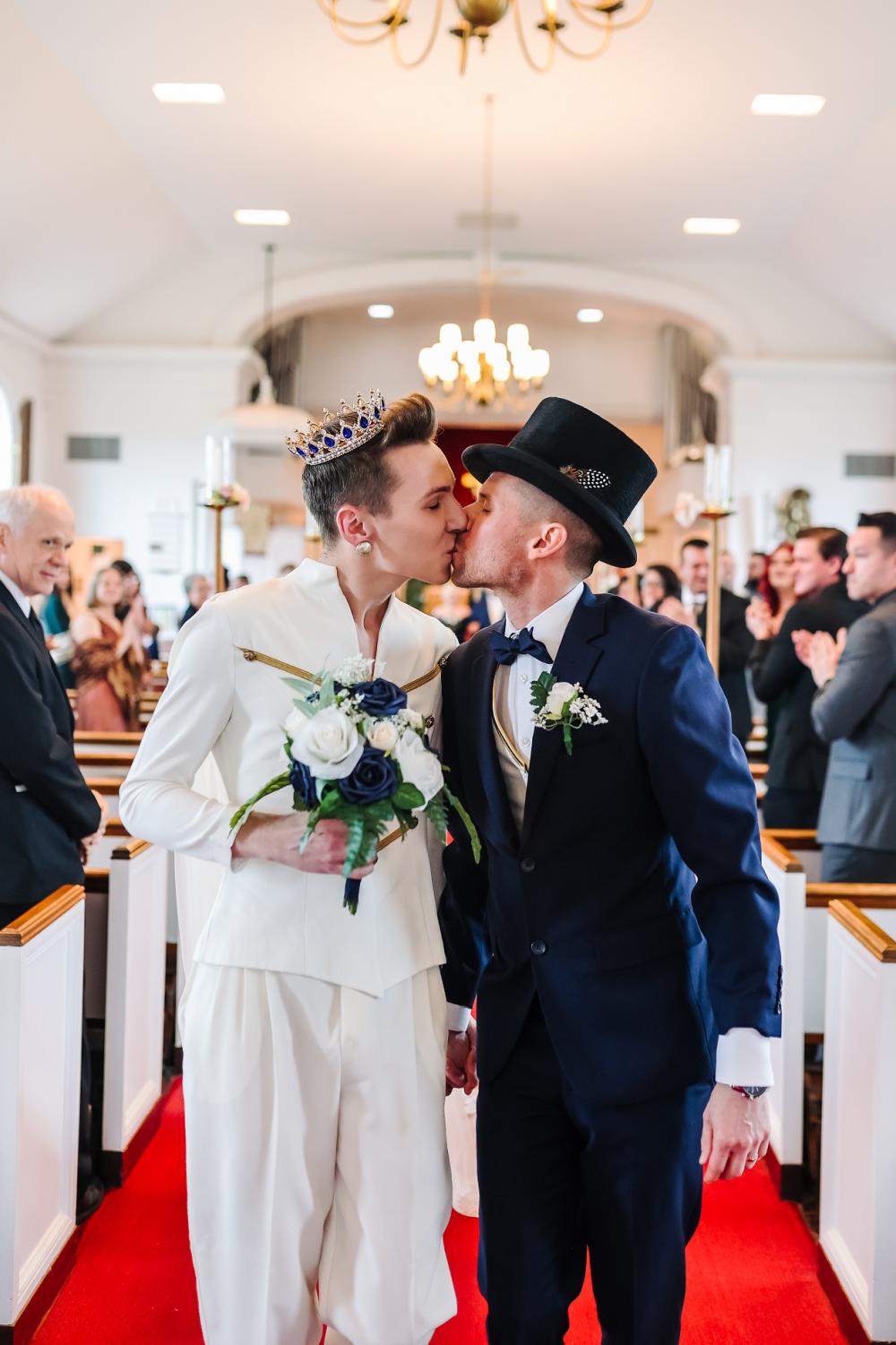 Andrew actually thrifted much of his white, Prince Charming-inspired outfit. "Sticking true to myself, I began thrifting early on for what I wanted to wear. I thrifted my jacket that had the perfect Prince Charming look with gold buttons down each side of the jacket with gold ribbons connecting them to each side of the jacket. The ivory pants I wore were also thrifted and high waisted, that matched the jacket perfectly," Andrew raves. We think the sapphire crown is such a show-stopping touch that beautifully ties Andrew's look to the bridal party's outfits!