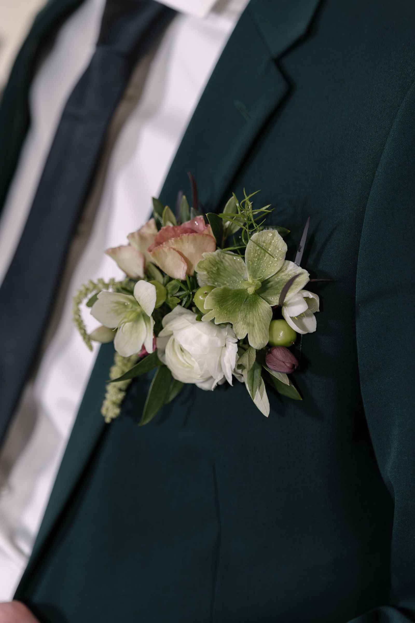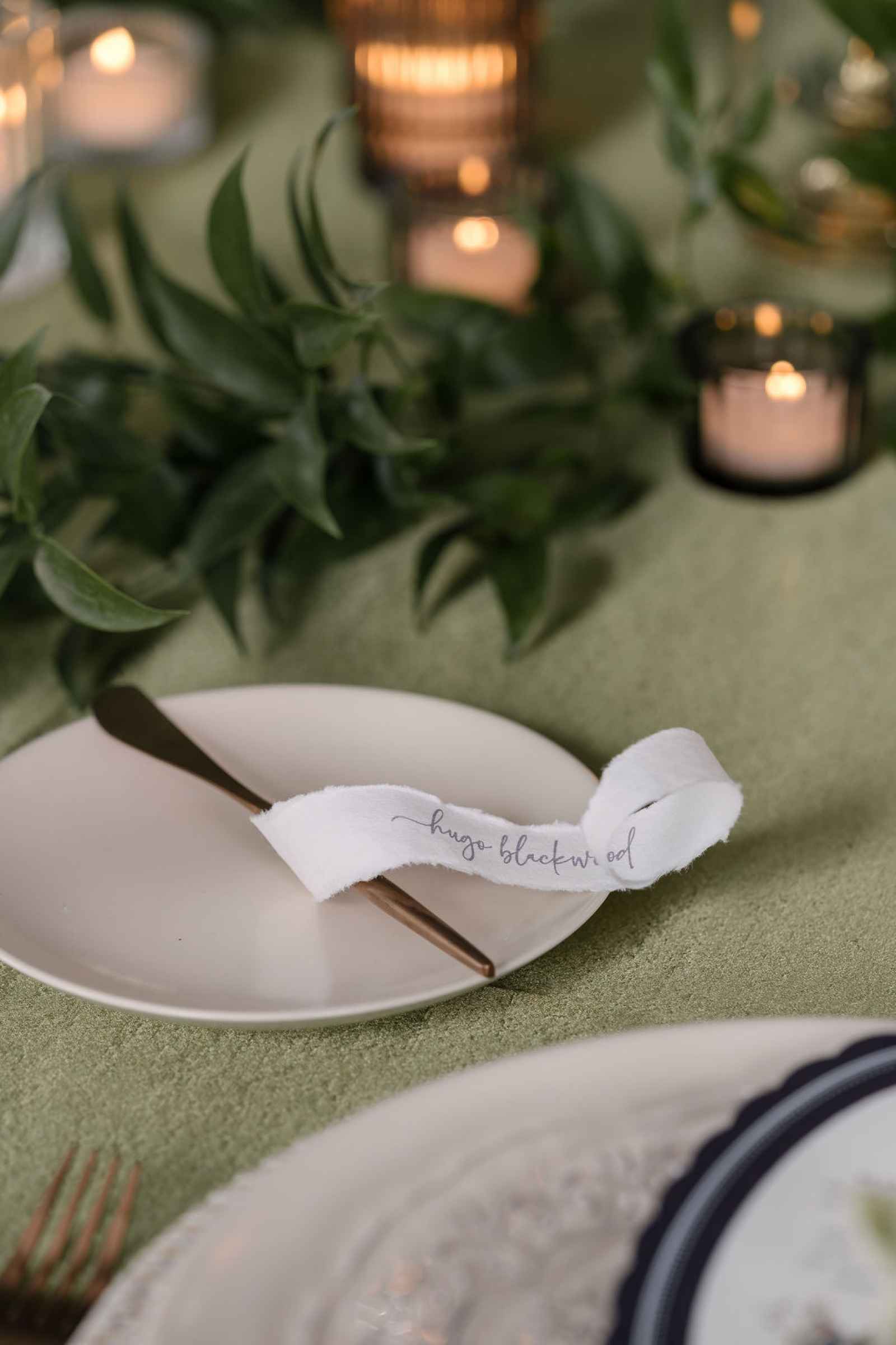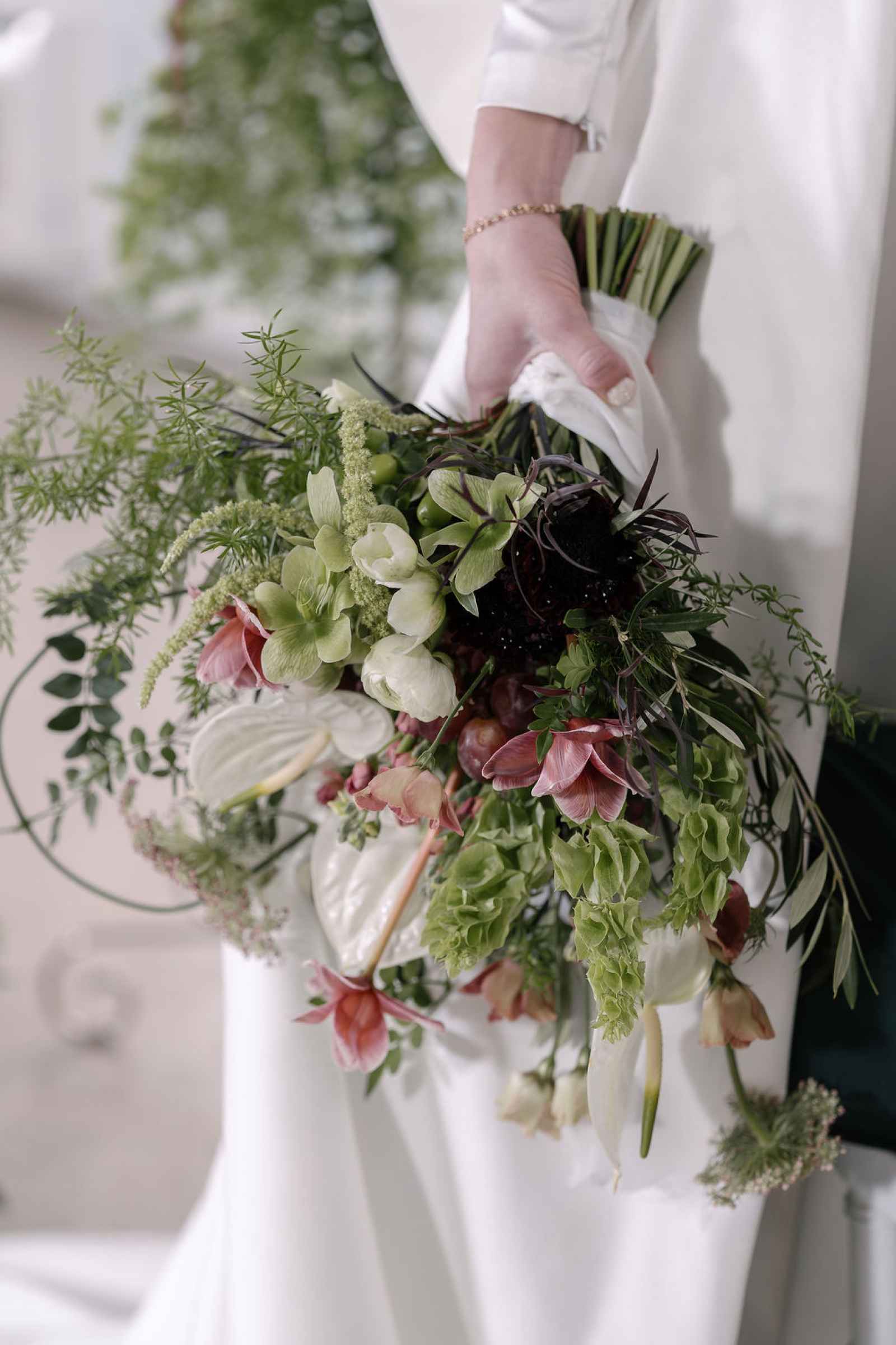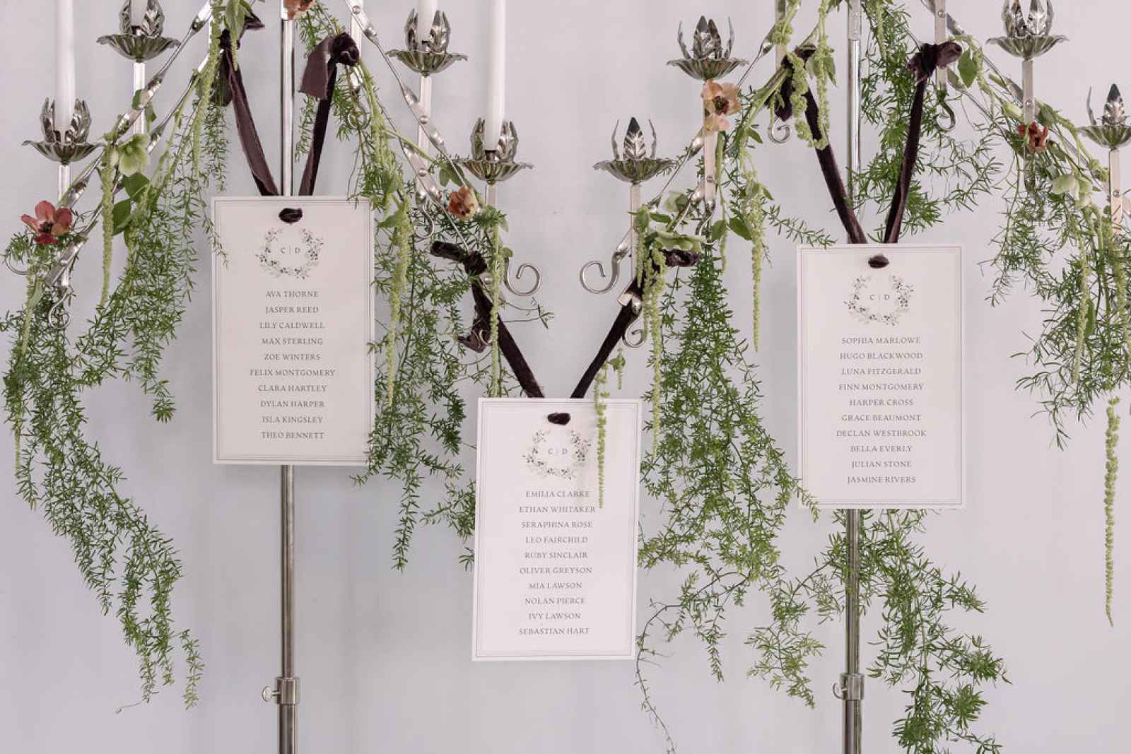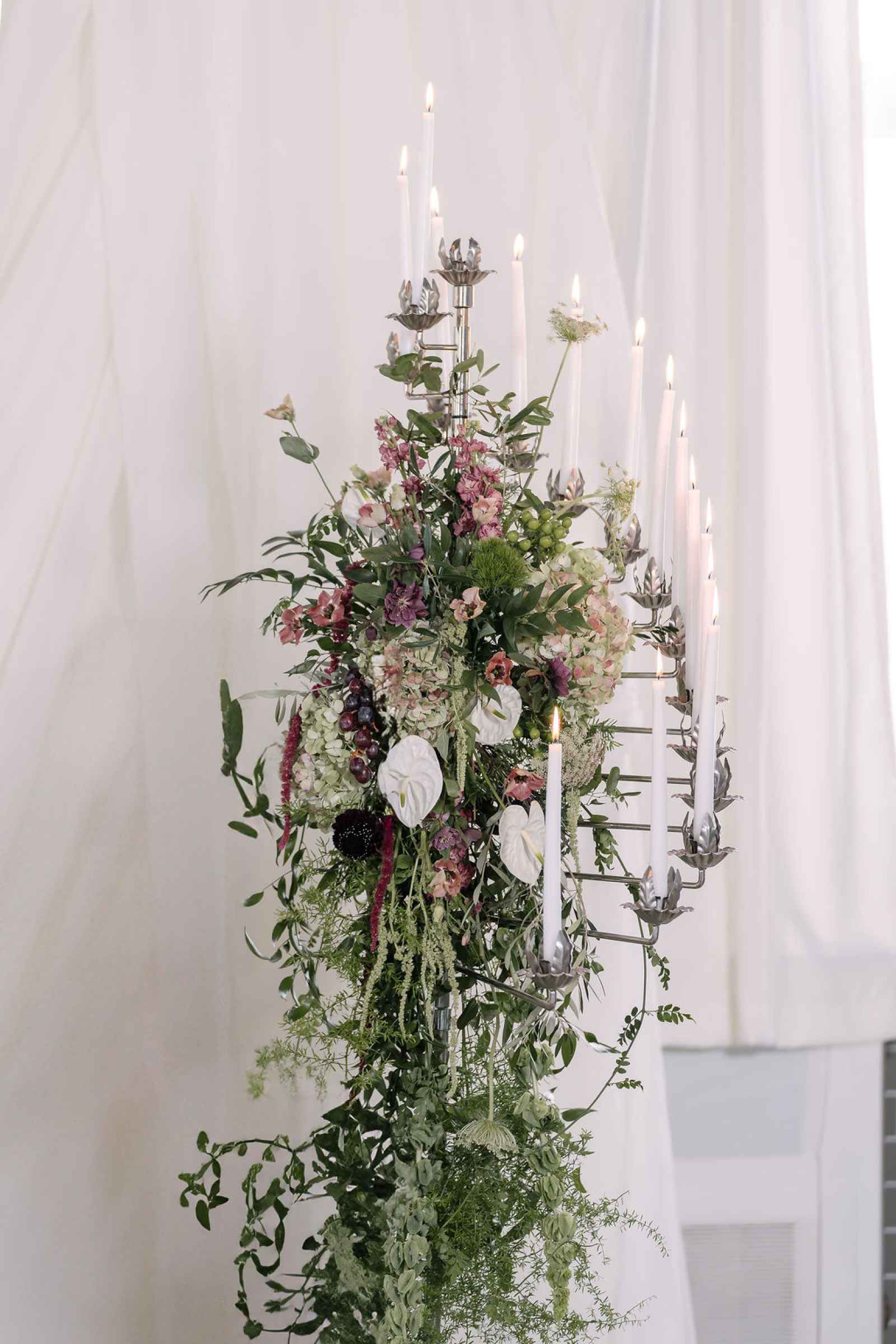 For the florals, Jaime wanted the florist's creativity to take center stage. After sharing the overall aesthetic and vision, Flowers by Anna ran with the concept, sourcing blooms first by color and then by texture to bring our lush, abundant vision to life. The arrangements cascaded from the silver candelabras and spilled across the tablescape, thoughtfully composed to feel as if they had naturally grown wild in the space. Every flower was chosen to complement the rich shades of green and plum, adding organic movement and depth that perfectly tied together the entire design.