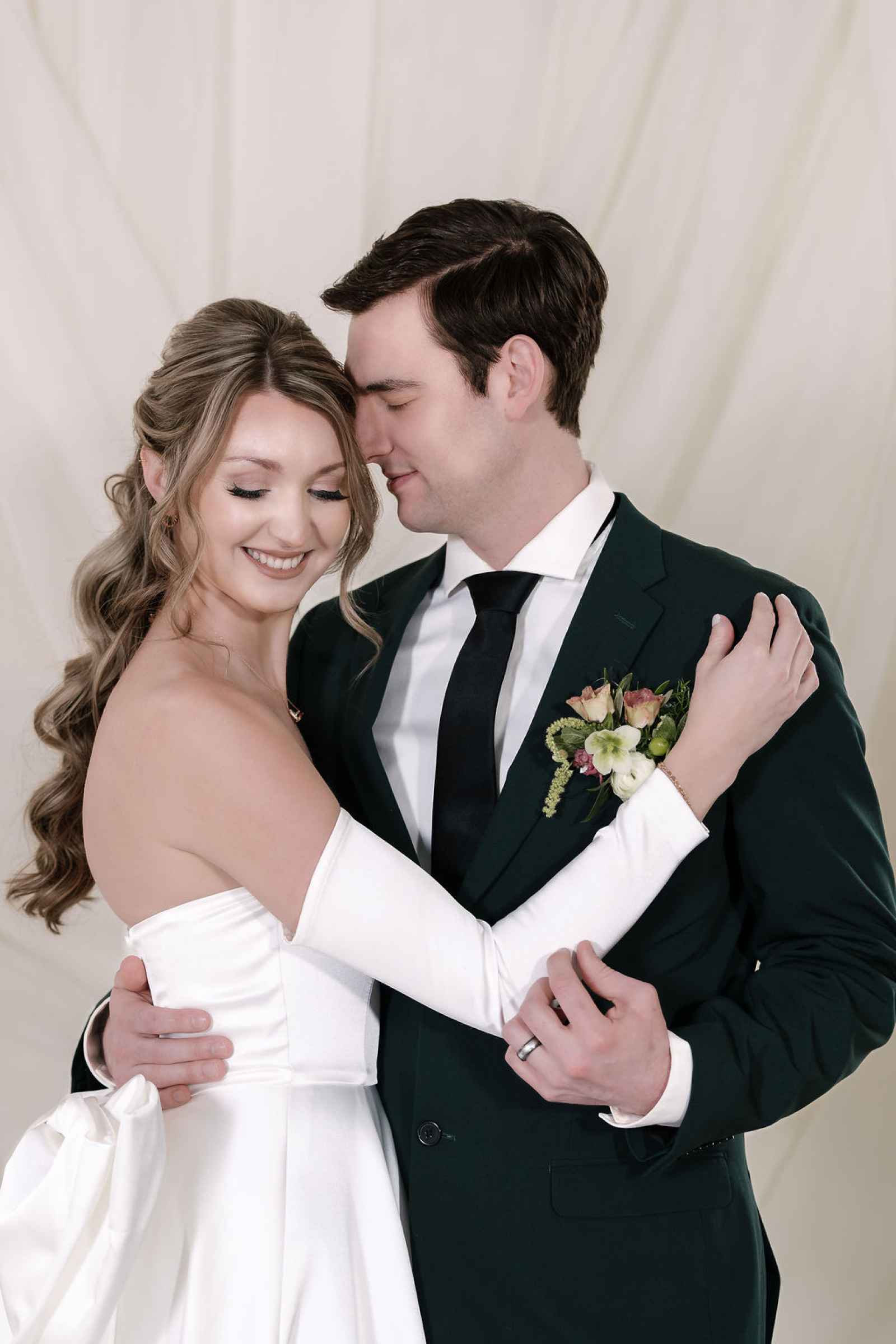 CBTKbrand drew inspiration from the luxurious design, showcasing three of their stunning new creations. The selection included two breathtaking ballgowns—both with flowing satin and cathedral trains. One featured an oversized bow and off-the-shoulder long sleeves for a classic, romantic look, while the second combined drama and versatility with a detachable skirt and train, complete with a mesh corseted bodice and off-the-shoulder neckline. The final look was a playful party dress with a short satin bubble skirt, sparkling appliqués and a corseted bodice of mesh. To complement these looks, BÜK Weddings chose soft, natural makeup that defined the bride’s beautiful features—especially her soft blue eyes—without overpowering them. Warm tones of peach and gentle browns enhanced her eyes and lips, keeping the overall vibe fresh and romantic. Blushing Beauty & Co. styled her hair in loose, soft curls cascading down her back in a half-up style, which paired effortlessly with the cathedral veil and added to the graceful, ethereal feel of the entire shoot!