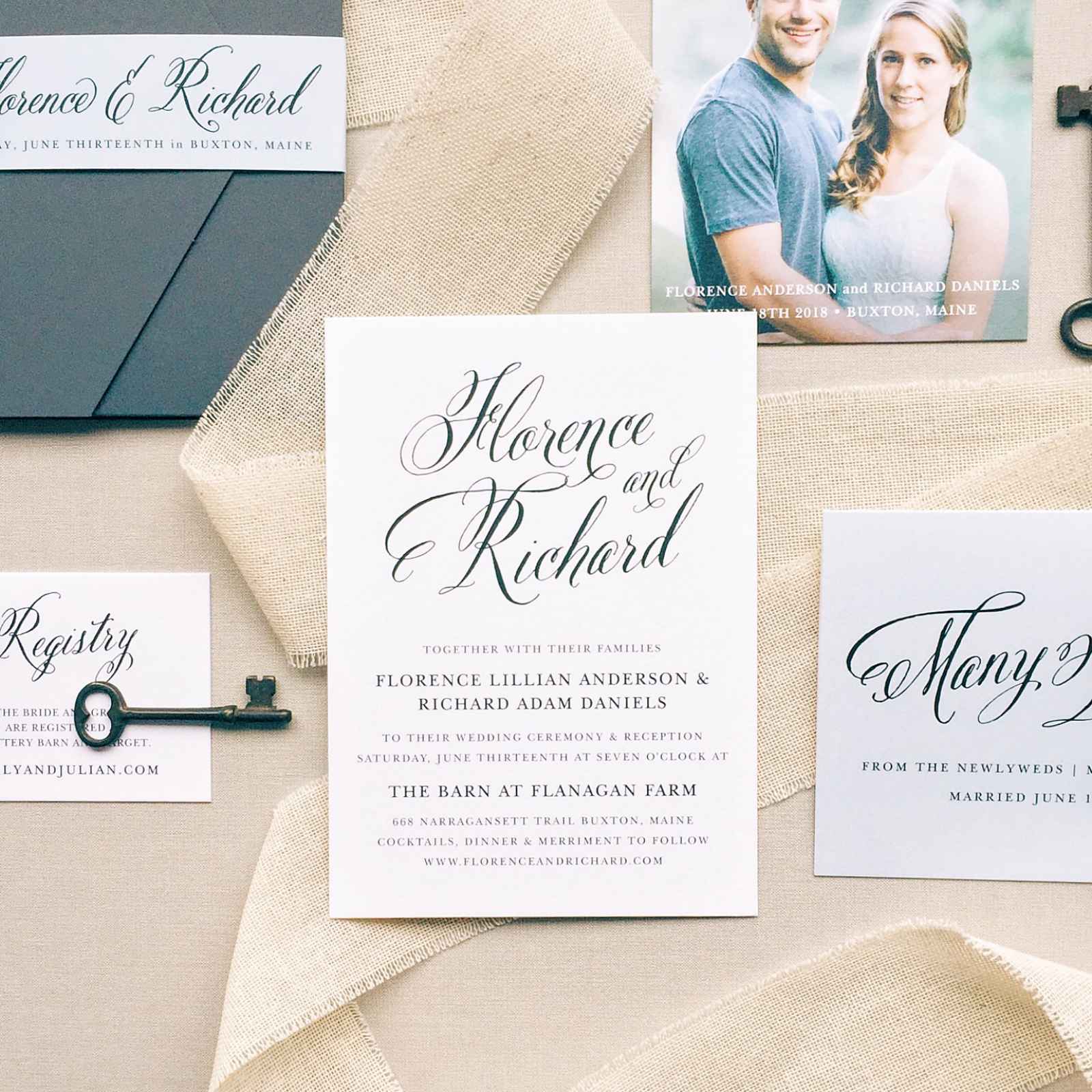 Start with your wedding invitation—the most important part! Your invitation can be as simple or as extravagant as you would like. Uploading a photo and laying out the details on the back is a super cute way to personalize your invites. If you go with a more formal look like a calligraphy design, spice it up by choosing from 180 colors or go with a foil invite. You want your invitation to be the centerpiece of your suite so make it bold!