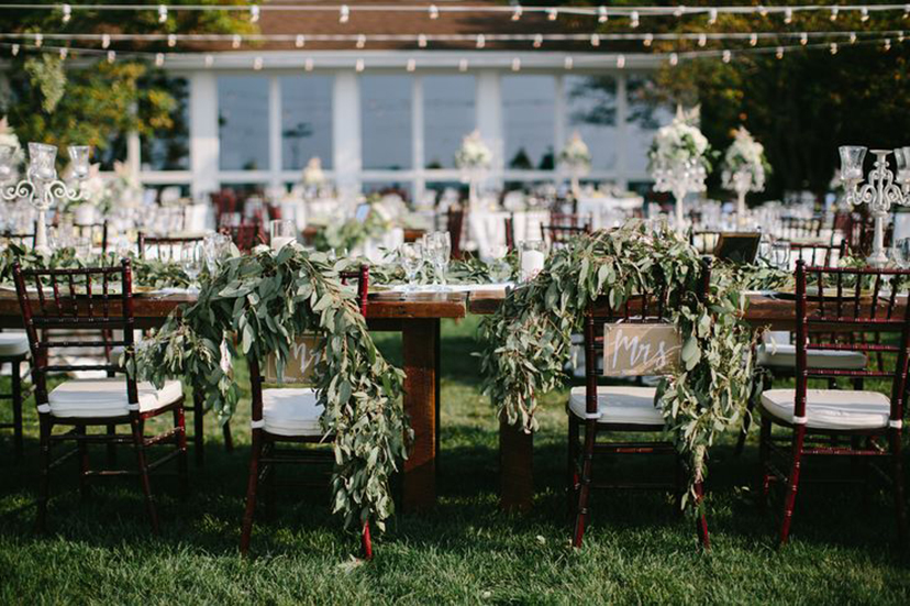 Floral draping paired with a little rustic charm goes a long way. A simple idea for dressing up rustic chairs and farm tables, especially in an outdoor setting in the fall, is to add your favorite florals, foliage or greens! Fall is a great time for dark wood chairs and farmhouse tables.