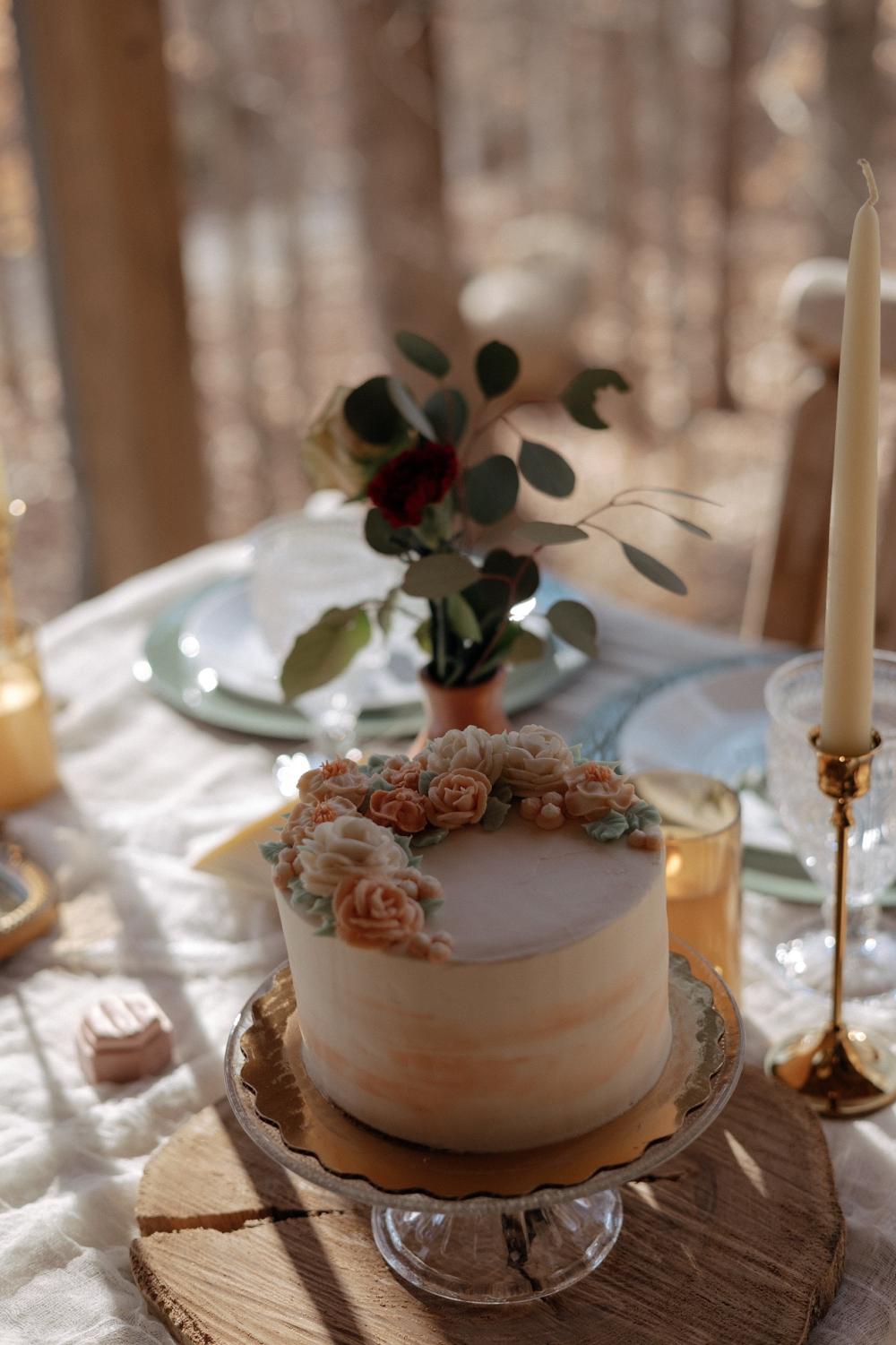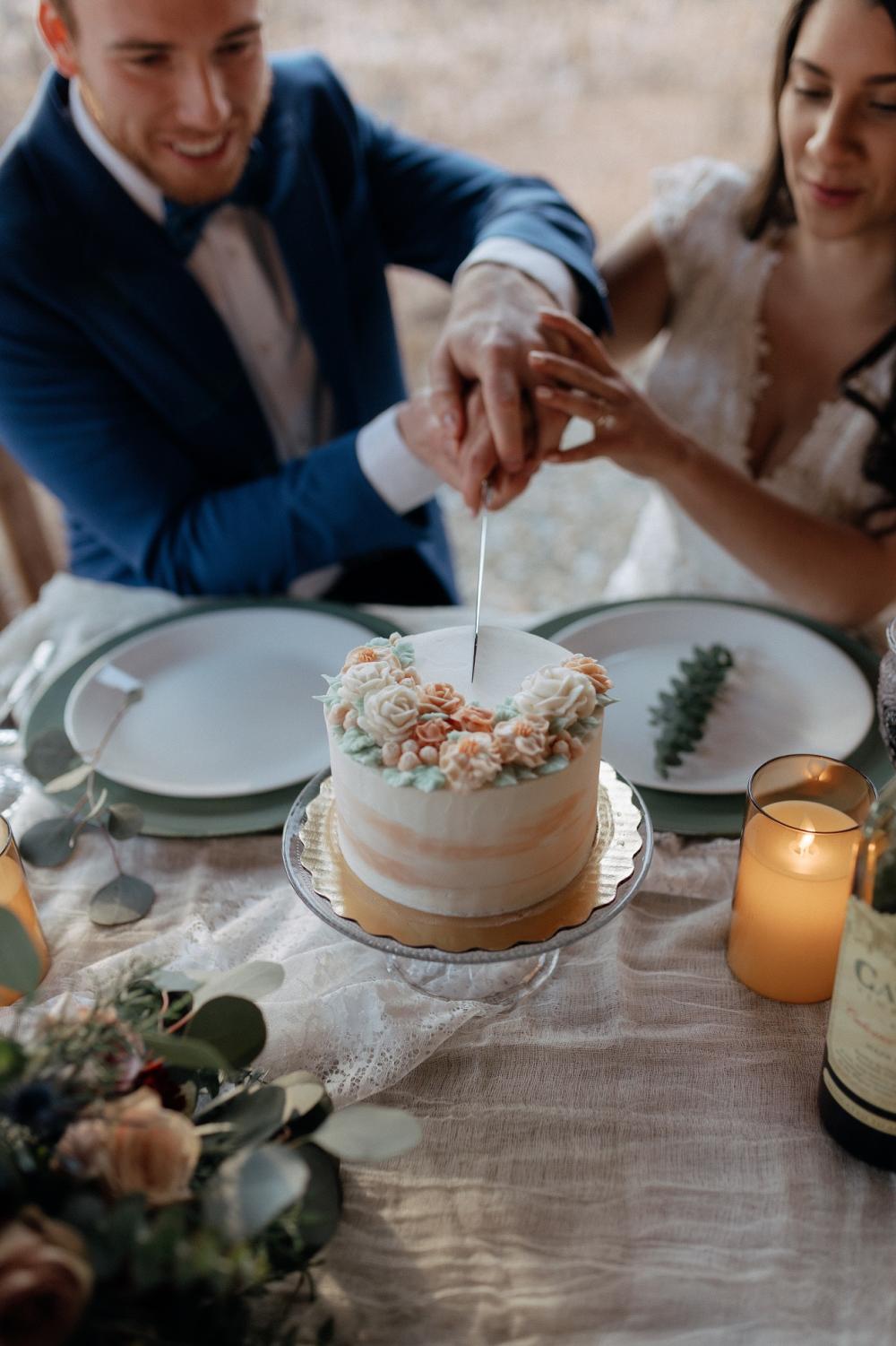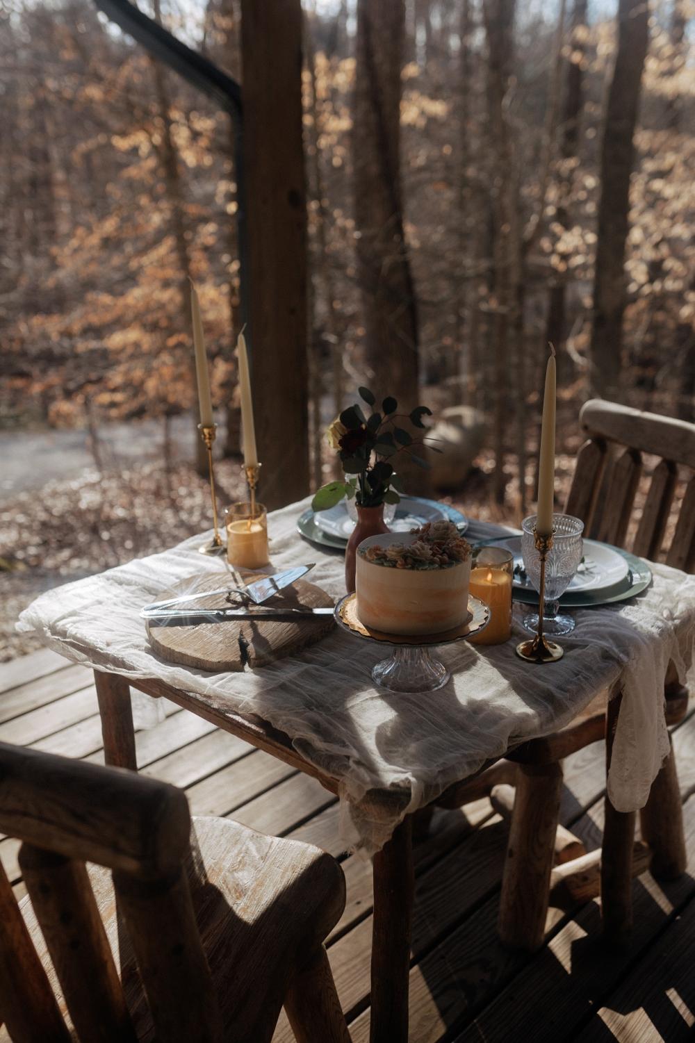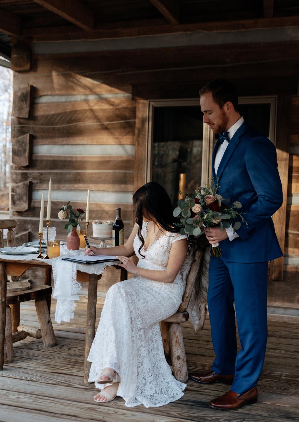 With the elopement idea in mind, Hannah and David didn't choose to incorporate any overarching theme or color scheme but decided to use things they both liked. "I just picked out things and colors that I like (neutral, earthy tones), and everything looked cohesive together. My husband just really wanted to wear a blue suit, so he did," Hannah admits.