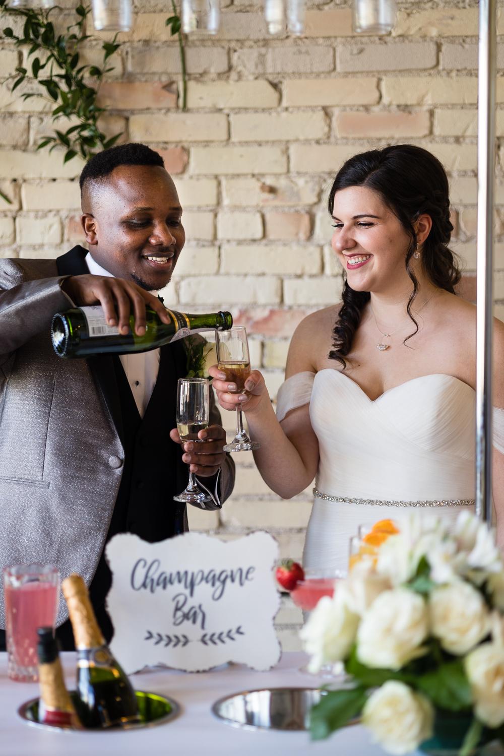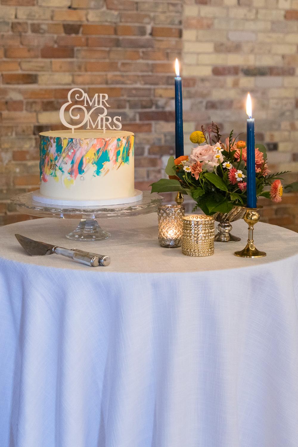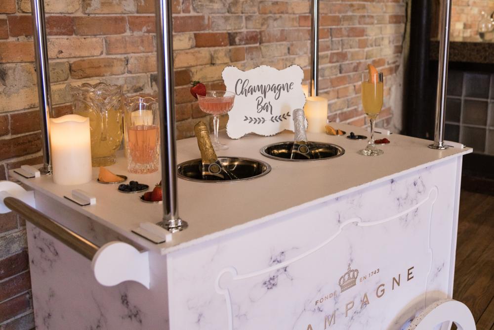 You'll notice that some of the decor ties the two opposing shoots together—like the champagne cart— while other pieces separate them—for example, the table setting. However, a lot of thought went into the contrasting decor, especially the color schemes. Michael says, "The color palettes we chose we wanted to be palettes that could be used year-round and also have a timeless elegance to them." The modern cake is also a delicious touch that brings the whole shoot together!