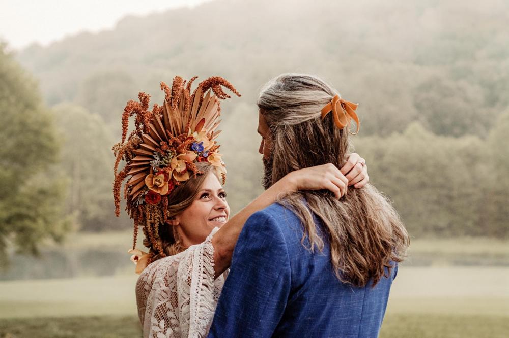 This gown makes a statement visually and economically--the best of both worlds! Upcycled from recycled and vintage materials, this dress has an incredibly unique style and story that stands out in a crowd. Those sleeves are simply swoon-worthy! The bride’s loose braid ties in a boho feel, and her stunning flower crown creates a gorgeous silhouette. The ribbon in the groom’s hair adds a perfect match!