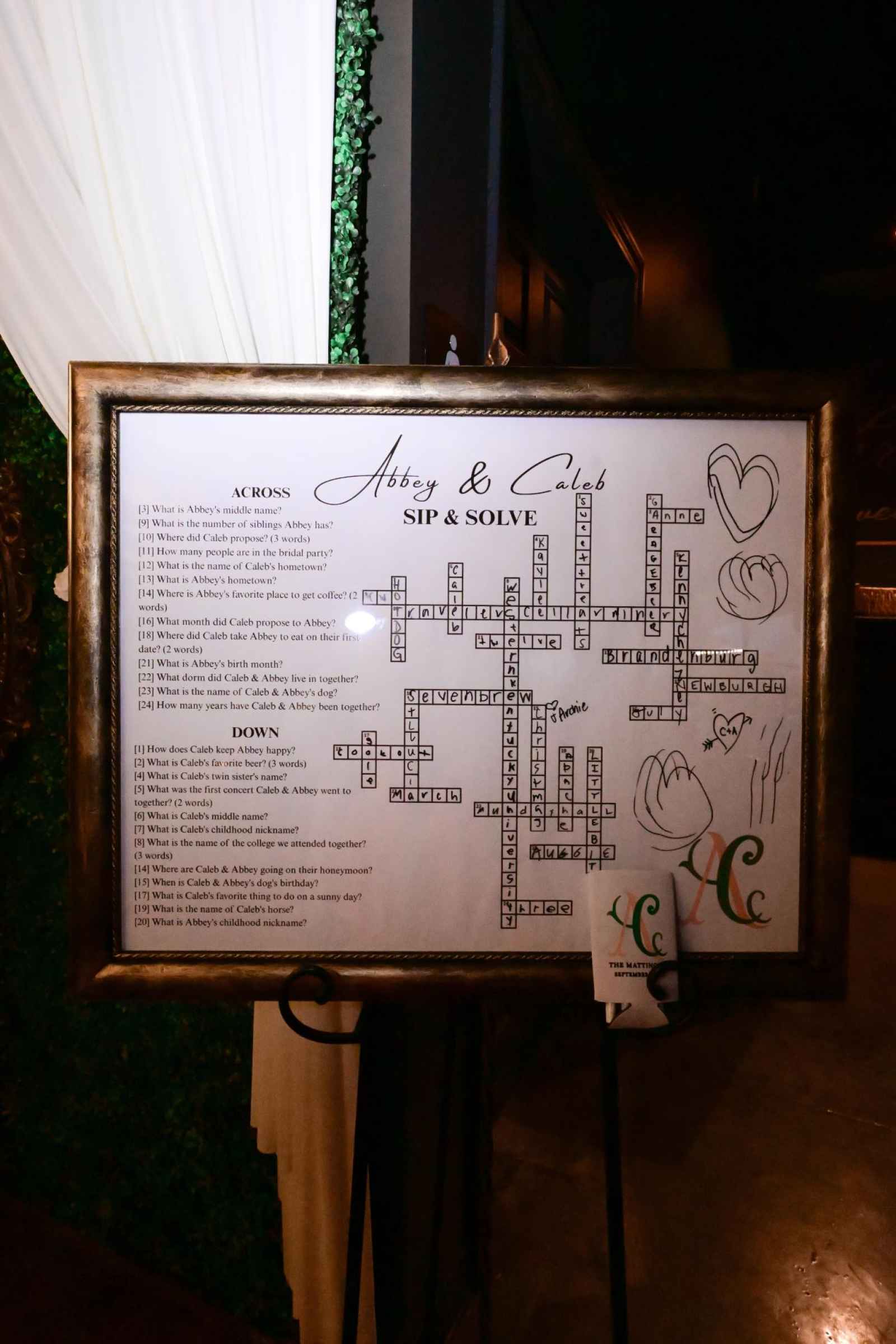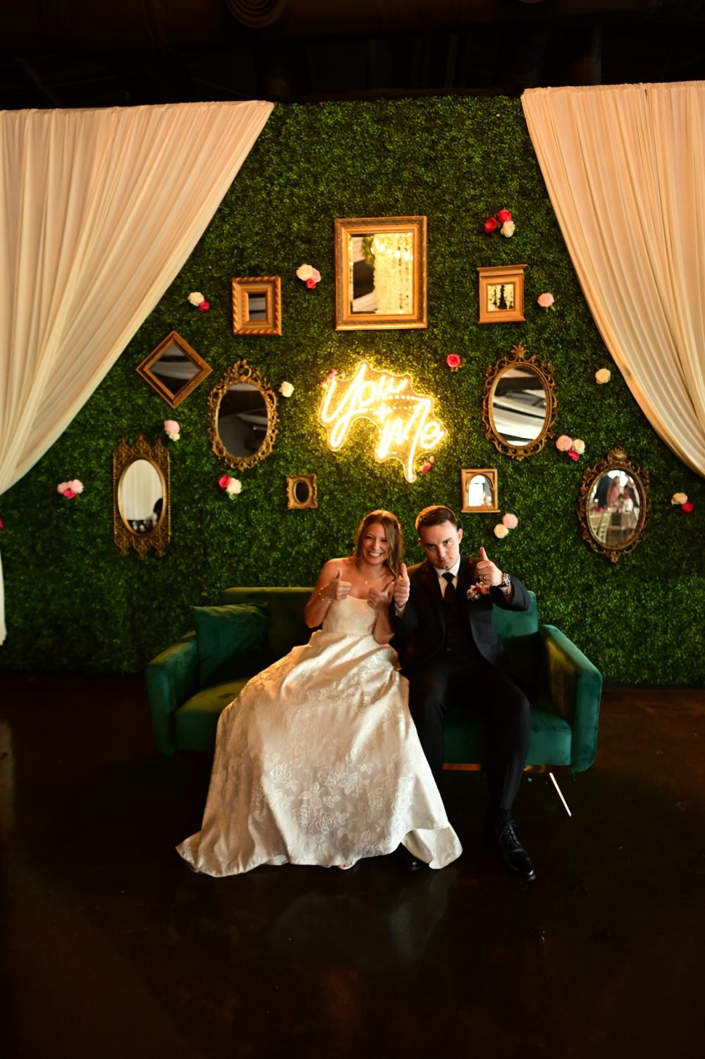 Wanting a unique way to get pictures with all the guests who shared their wedding day with them, Caleb and Abbey curated a photo-op at their reception. They had a greenery display and flower wall with mirrors and a sofa at the entrance of their reception space. "It let us take photos with each guest or group as soon as we arrived at the reception, creating special memories we’ll always be able to look back on," Abbey gushes.