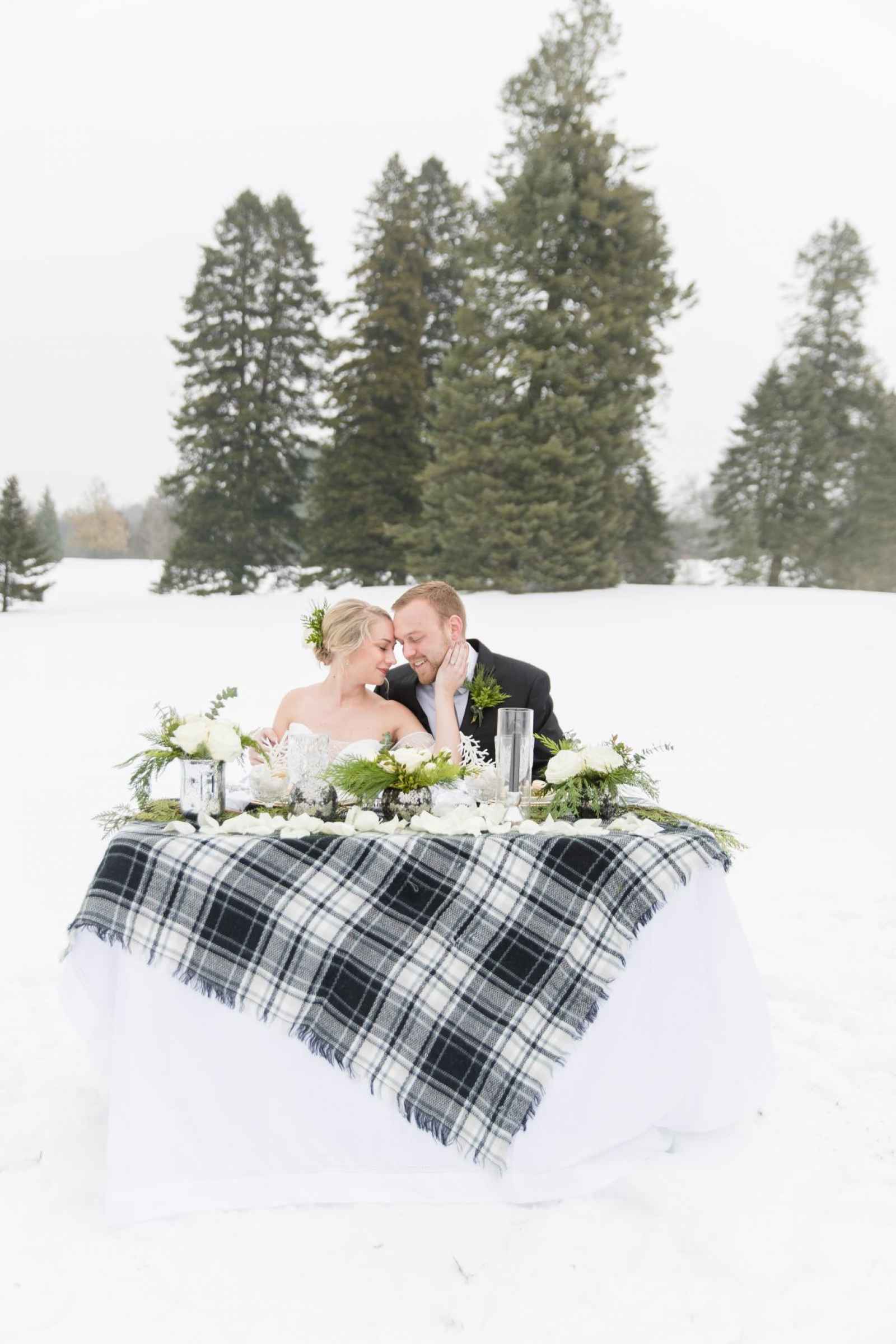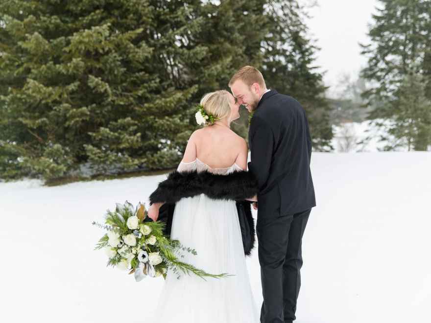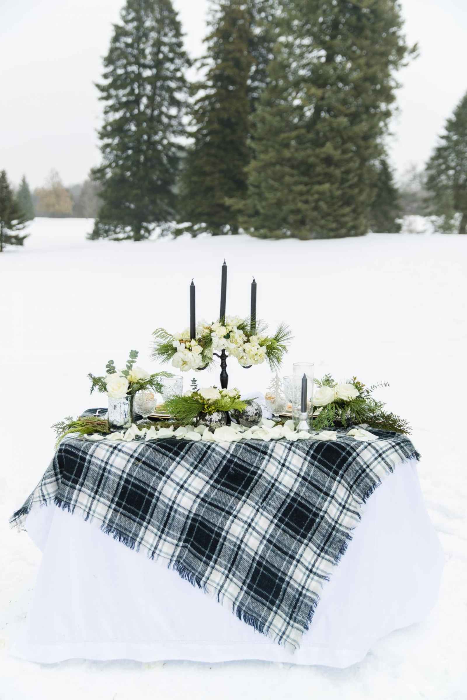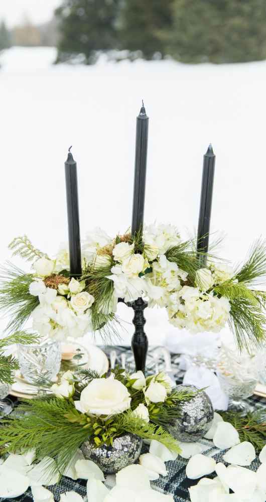 This style shoot proves that upscale black and white vibes can pair perfectly with wintry day in Michigan. Stephanie of Stephanie Parshall Photography says, “The original idea started with Tracy Park of Park Place Design because there comes a point with all creatives where we need to break out into something completely different and unique. She wanted to make something creative so we decided on a black tie, outdoor winter inspiration!