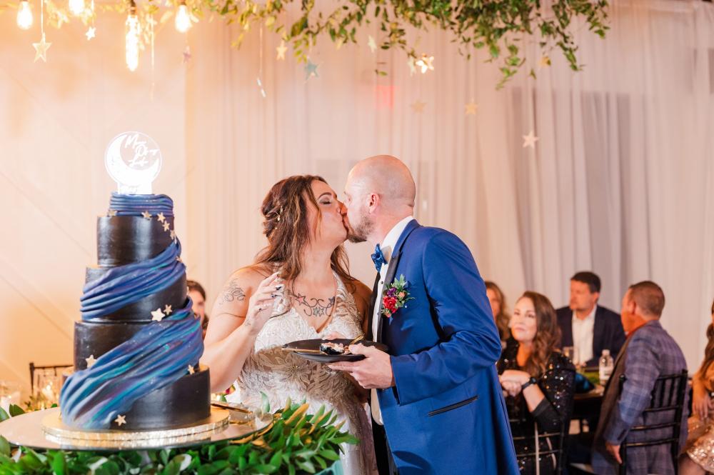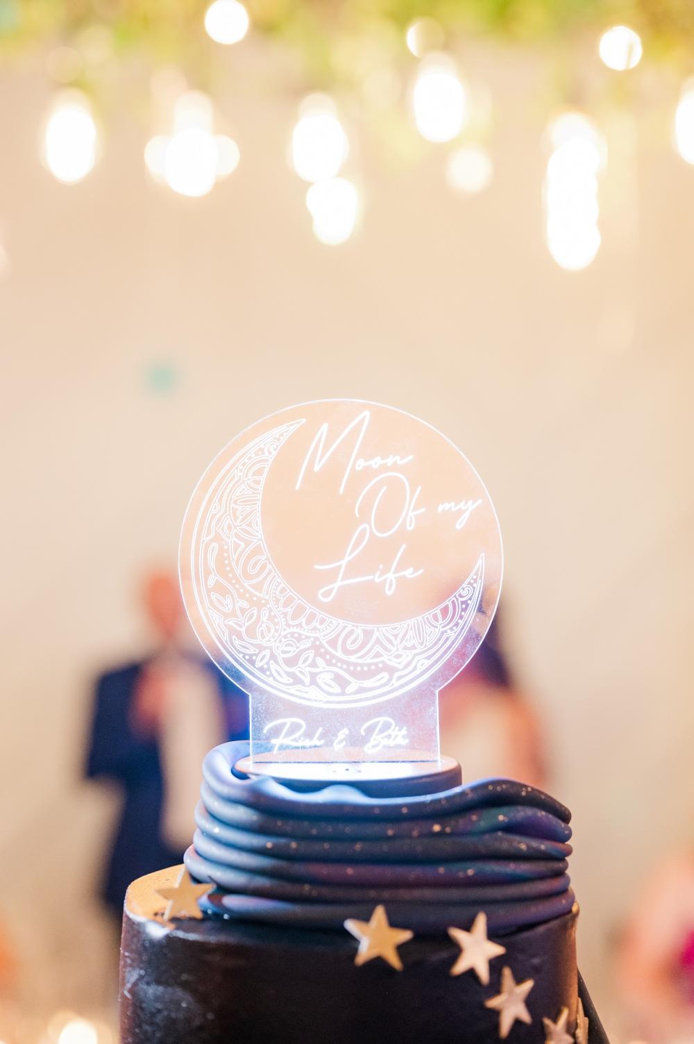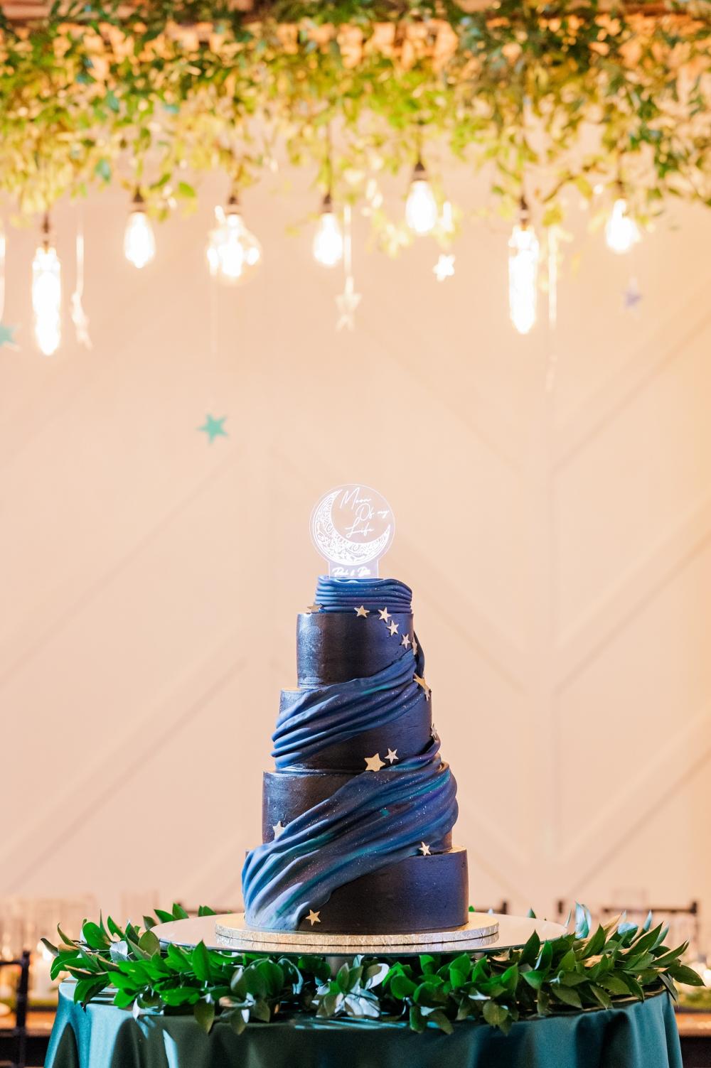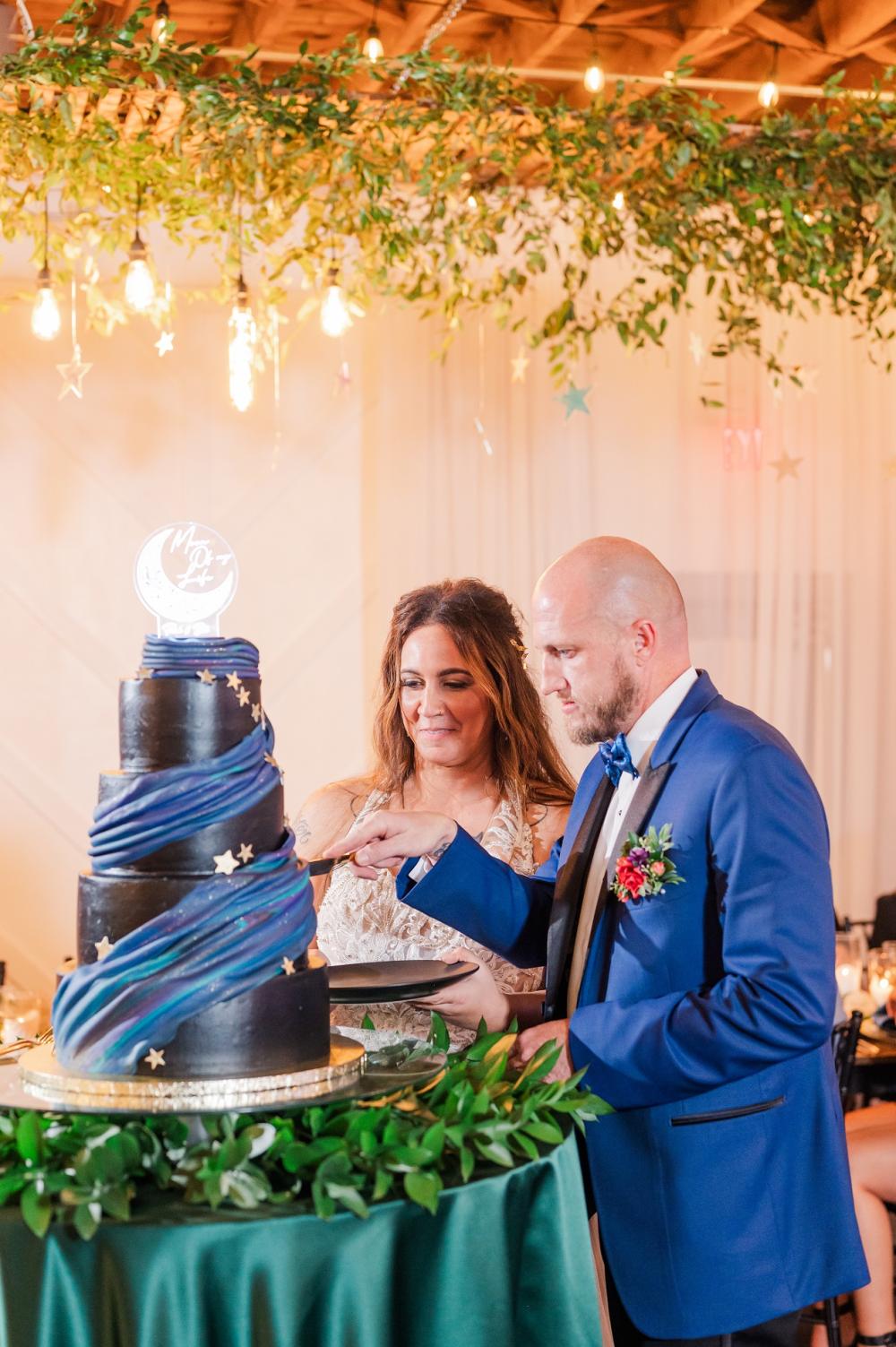 "We focused the wedding on unique touches so I think everything was done with our love story in mind, but some of my favorite elements were so fun!" Beth says. Part of the fun for them was being able to design so many elements of their day. Beth had the most fun with the stationery she made. The cake for this event also adds a fun flair! Beth and Rich didn't see the cake until the day of the wedding and were floored with how perfect it was for their celebration.