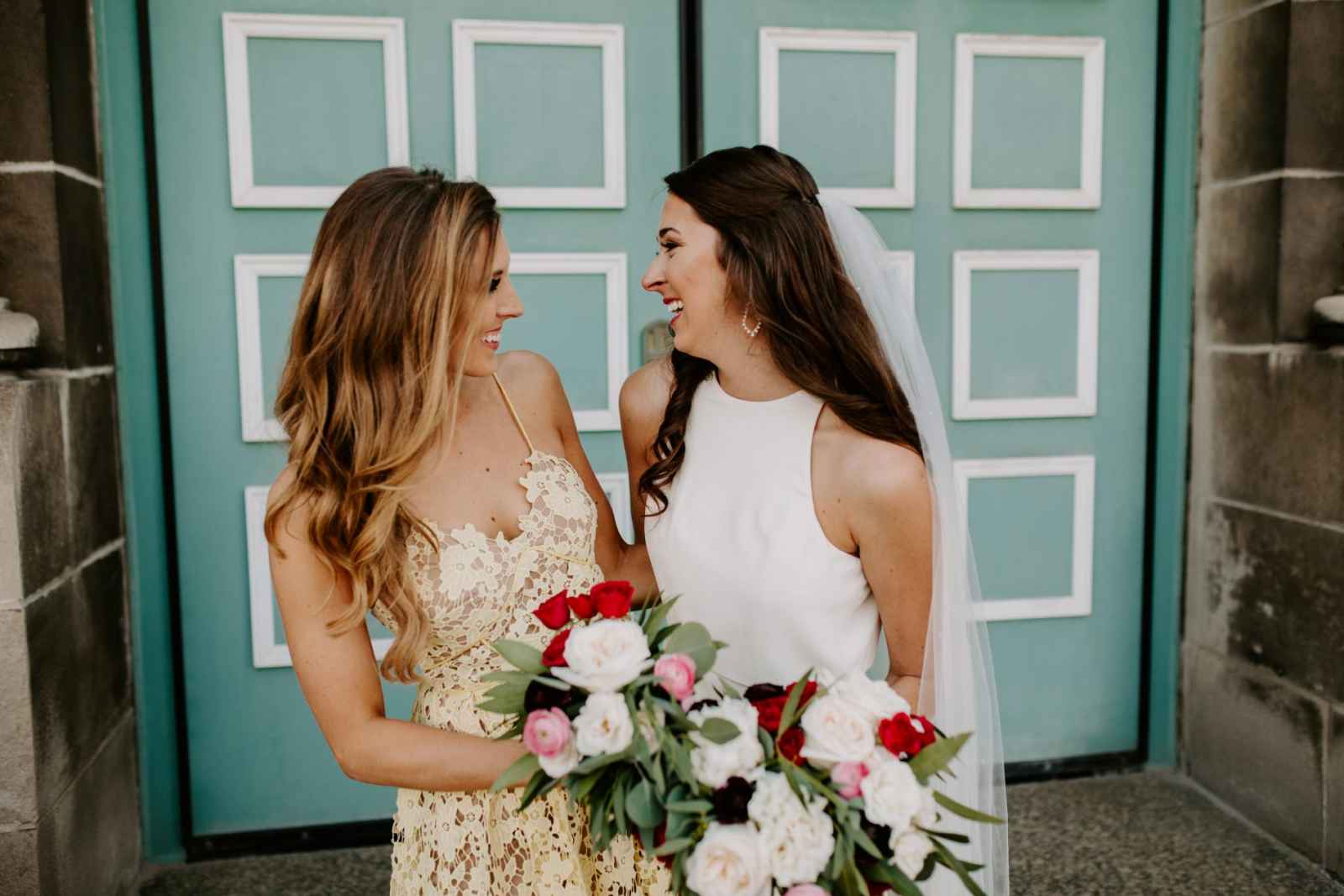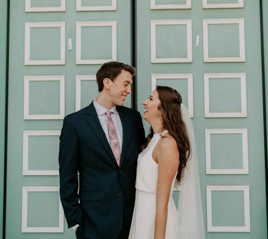 The couple ended up creating a dream, modern wedding with nods to a classic style. The style was also brought to life in Mary’s bridal look. She went with an elegant gown from BHLDN. She says, “I found this perfectly simple yet classic white gown at BHLDN – the first one I tried on!”