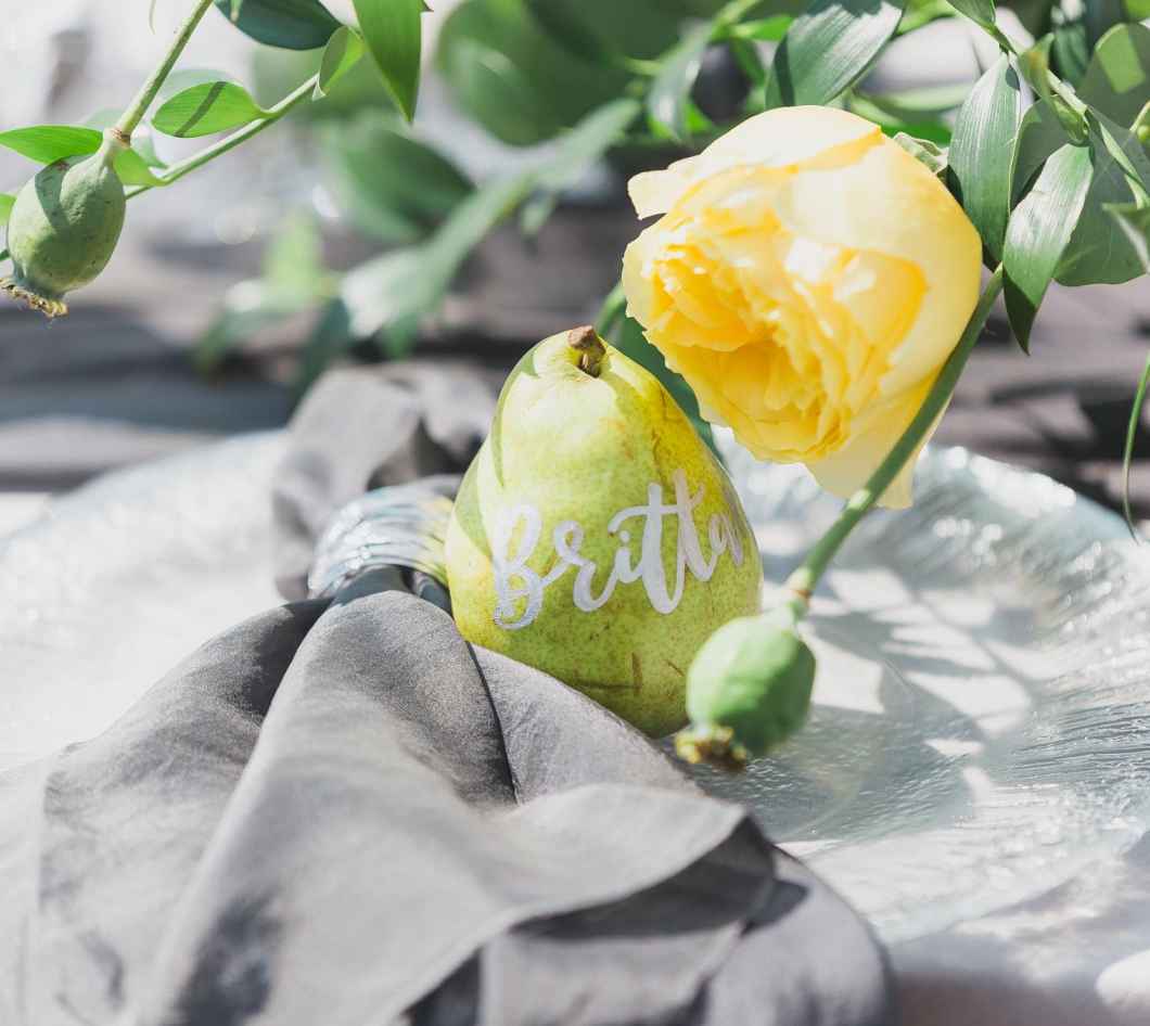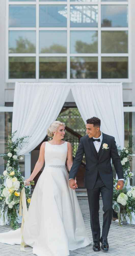 “For the ceremony setup, I wanted to focus mostly on greenery and making it very lush, especially since greenery is so trendy right now!” Hannah says. The clear glass urns were another addition to the modern flair. Gina from Pomp&Bloom infused yellow garden roses, white garden roses, white ranunculus, hydrangeas, Veronica, fresh pears and greens. “I wanted the florals to be clean and fresh with a vibrant pop of color,” Gina says. The white and green hues accompanied by a yellow accent lent itself to the perfect color combination—one that was the embodiment of summer.