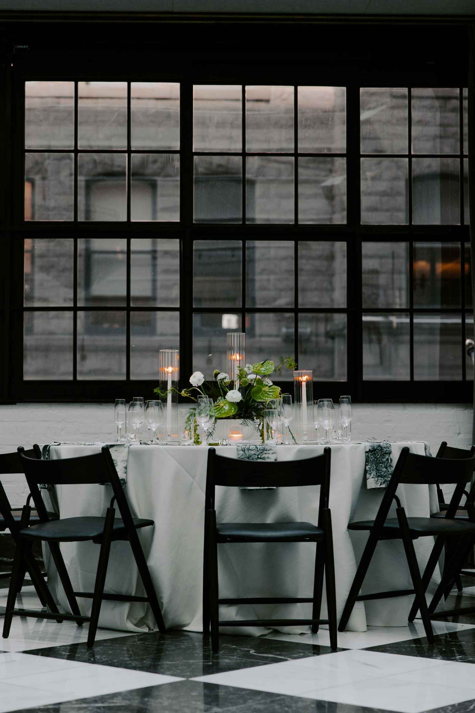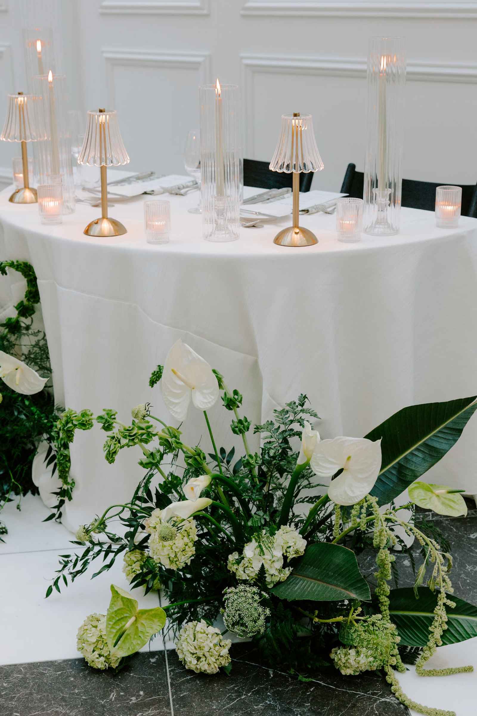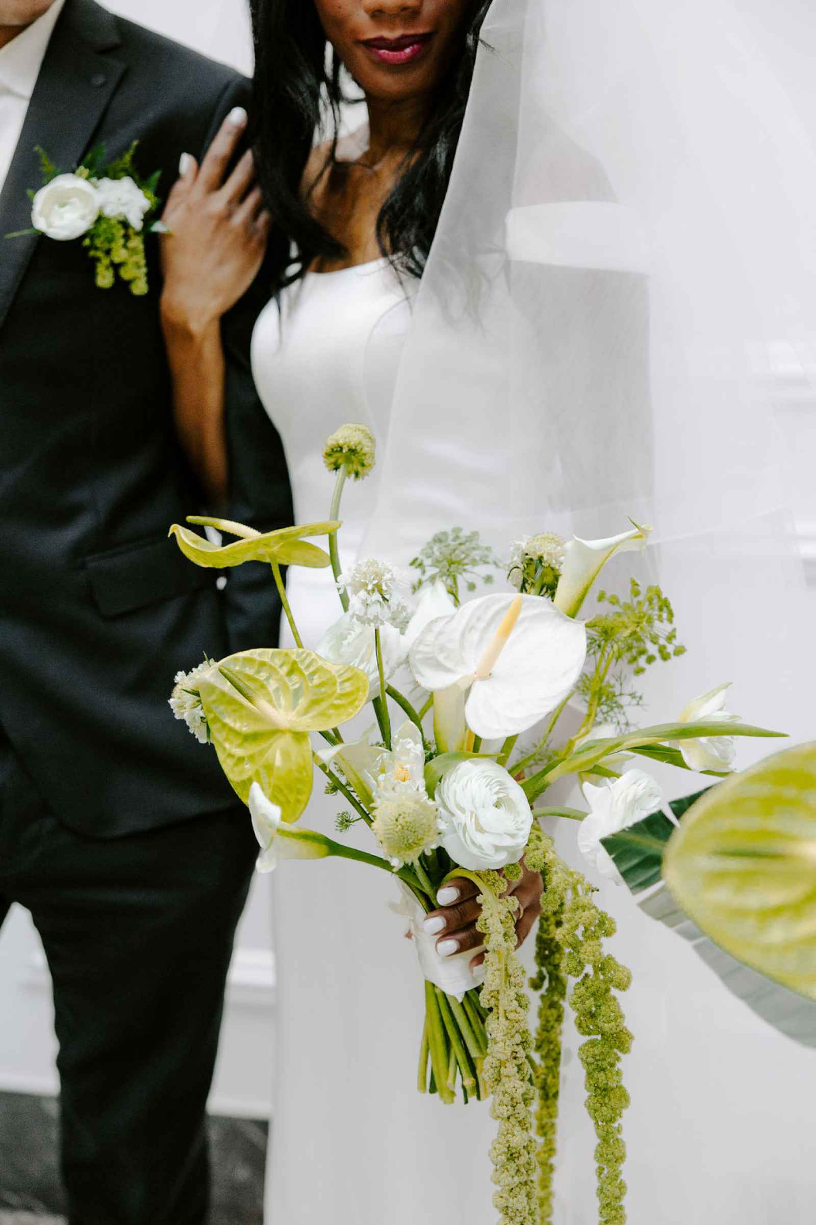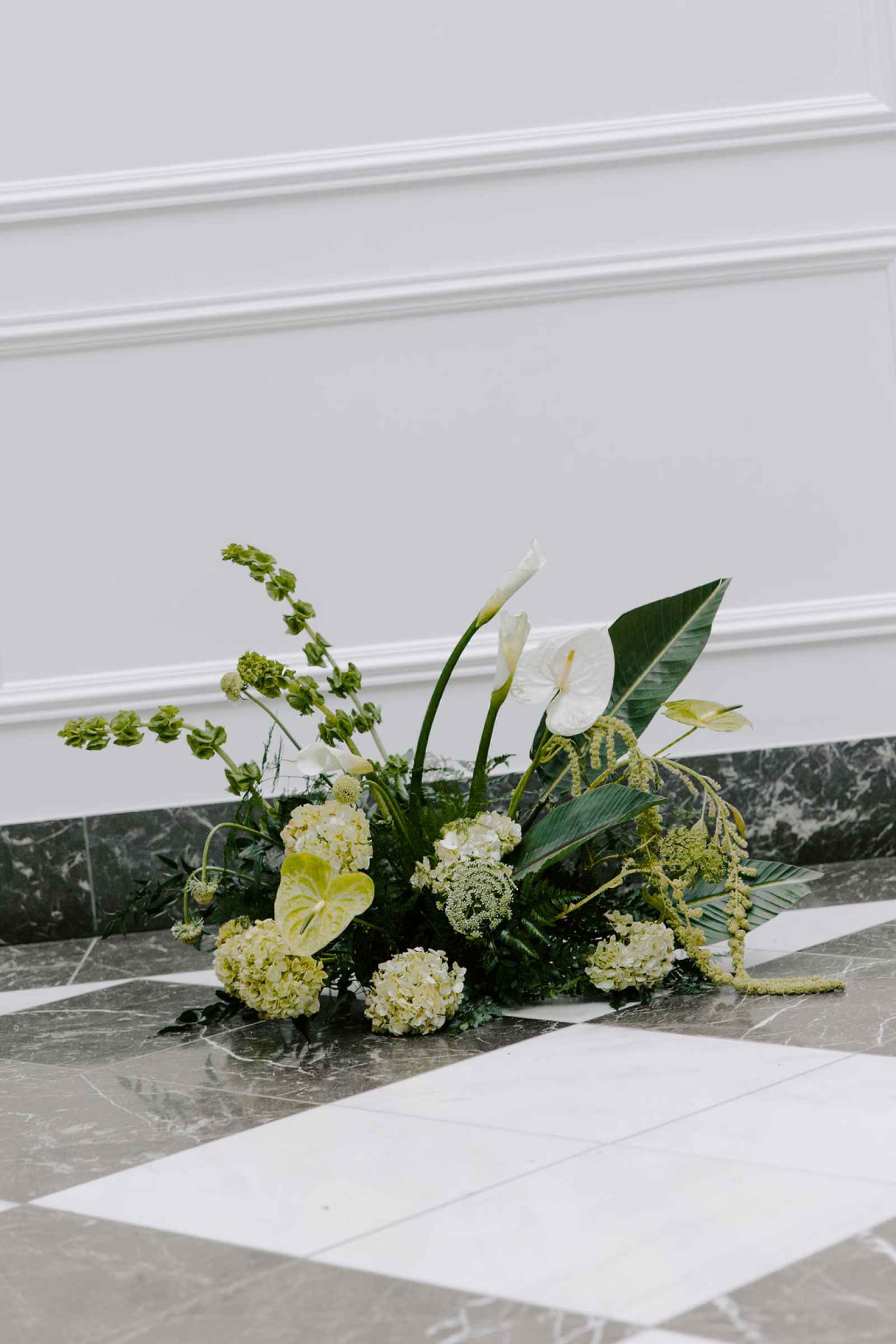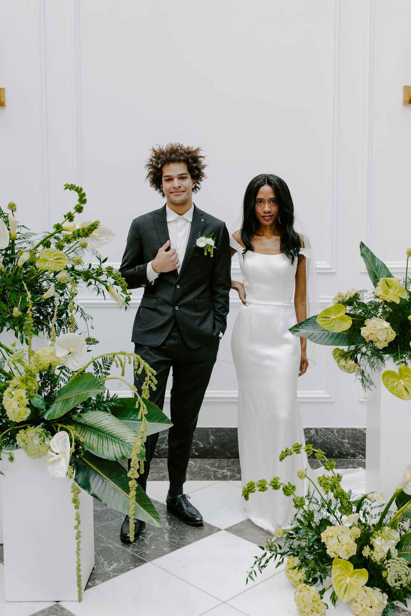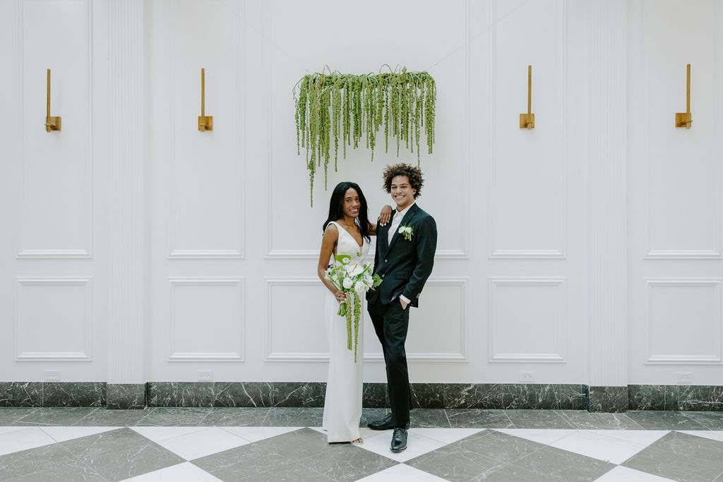 The vision for this shoot was to create a luxurious and exotic scene in a modern Chicago venue. Despite a small snafu with the plants not surviving the Chicago temperatures in February—mended by a trip to a floral wholesaler—this vision came to life perfectly! When deciding the details for this day, the team based everything on what would make the florals pop the most. They settled on a simplistic yet modern design with numerous black and white elements that elevated the atmosphere of the scene. As for the florals themselves, they utilized anthurium, green hydrangea, calla lilies, draping amaranthus and ranunculus to fill the space. Each bloom has a unique design that can stand on its own, but when placed with the rest of the florals, it created a stunning array of textures and designs that make this shoot feel like it was set far from the windy city. We love how simple yet luxurious this shoot turned out with all the neutral, elegant details!