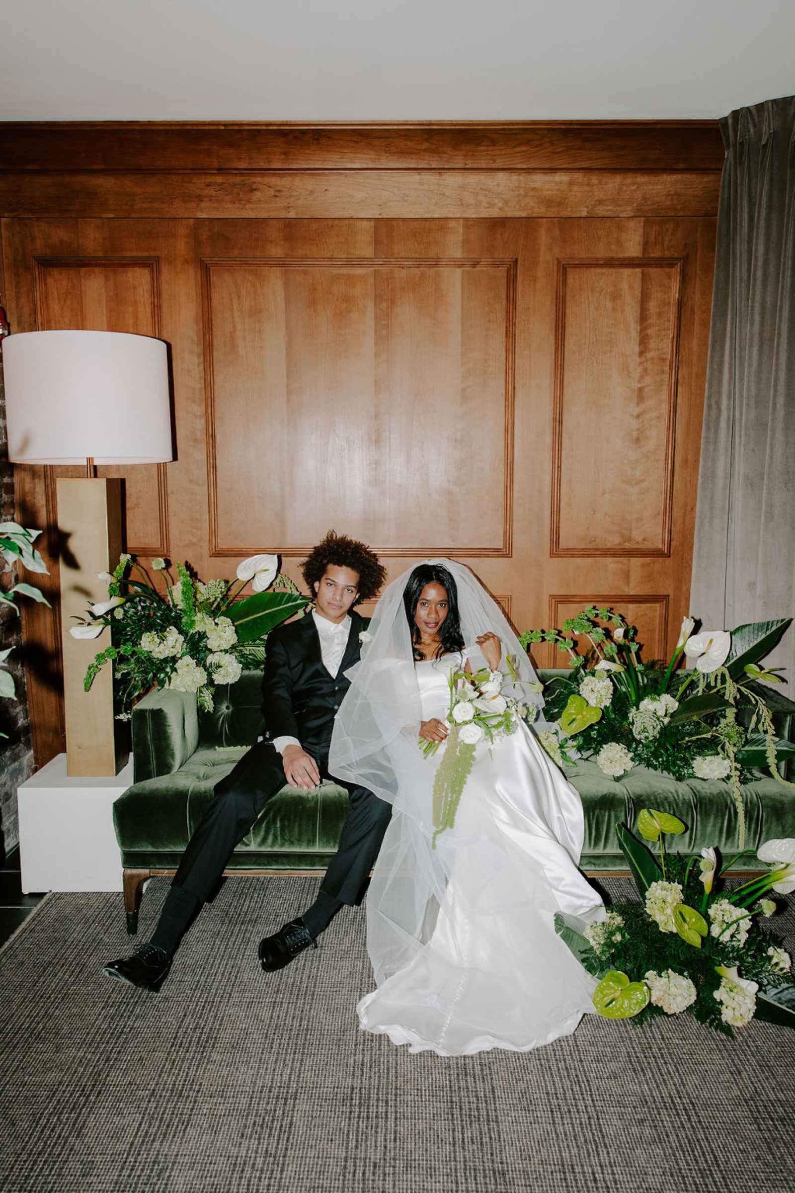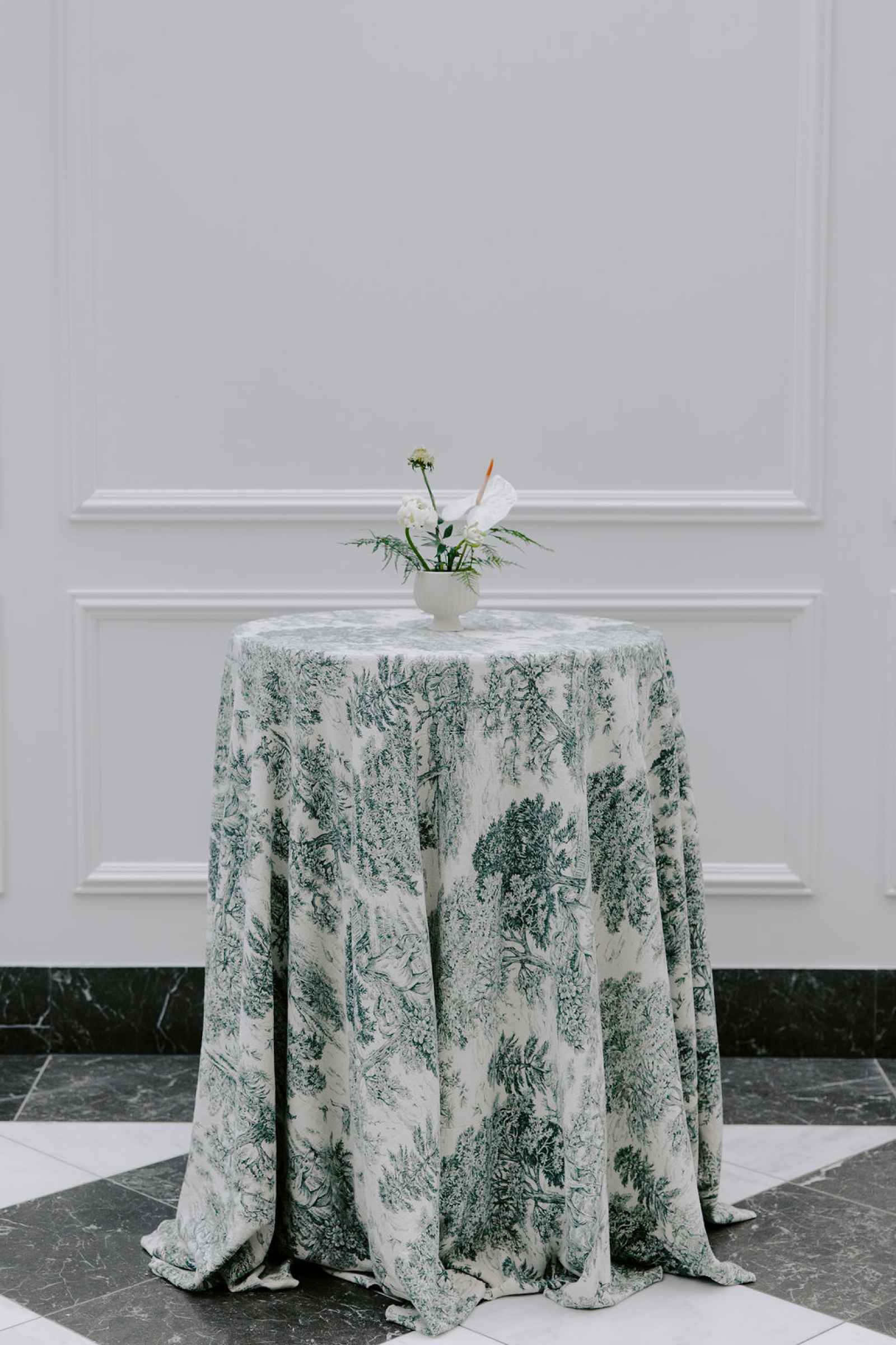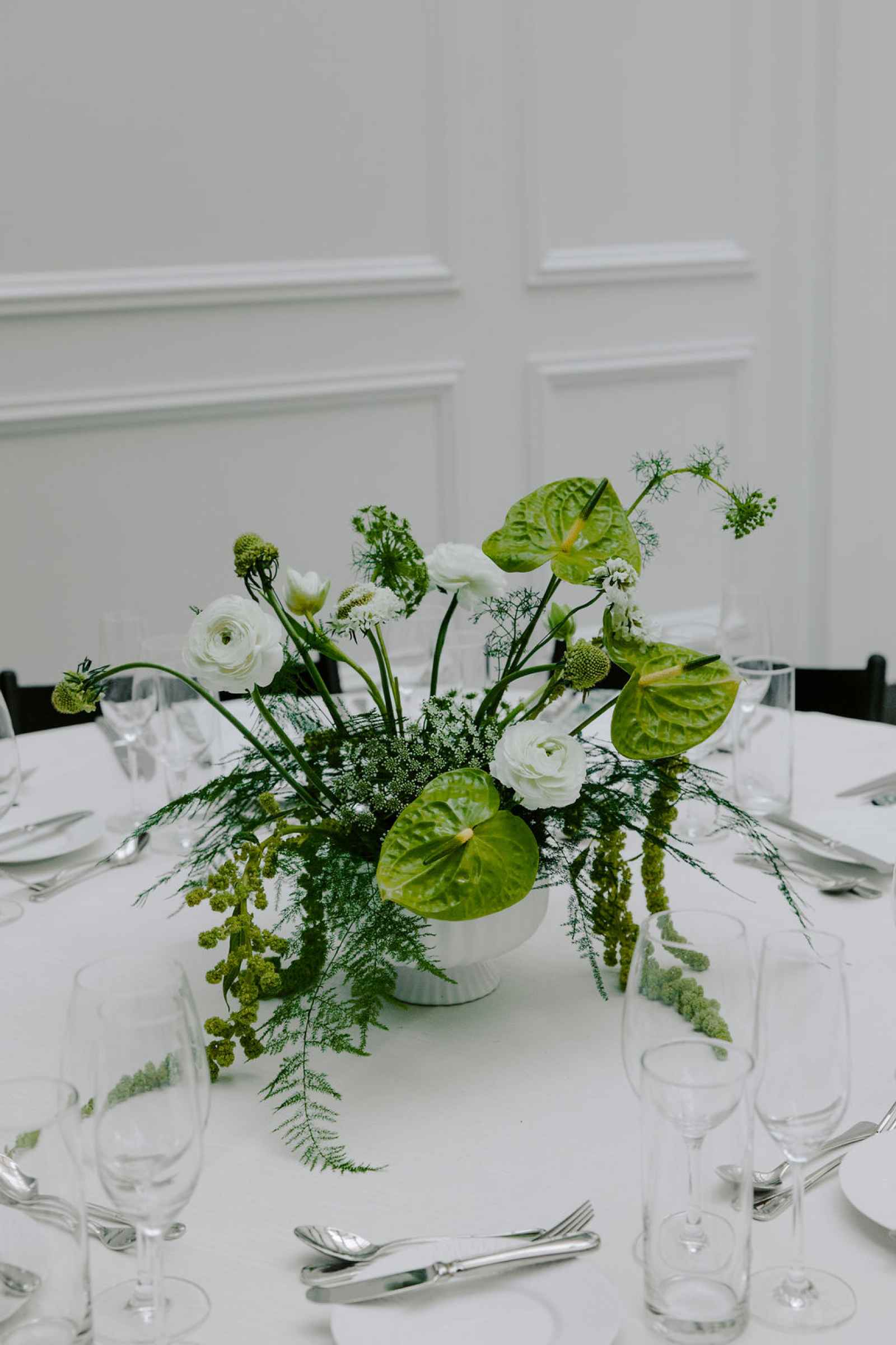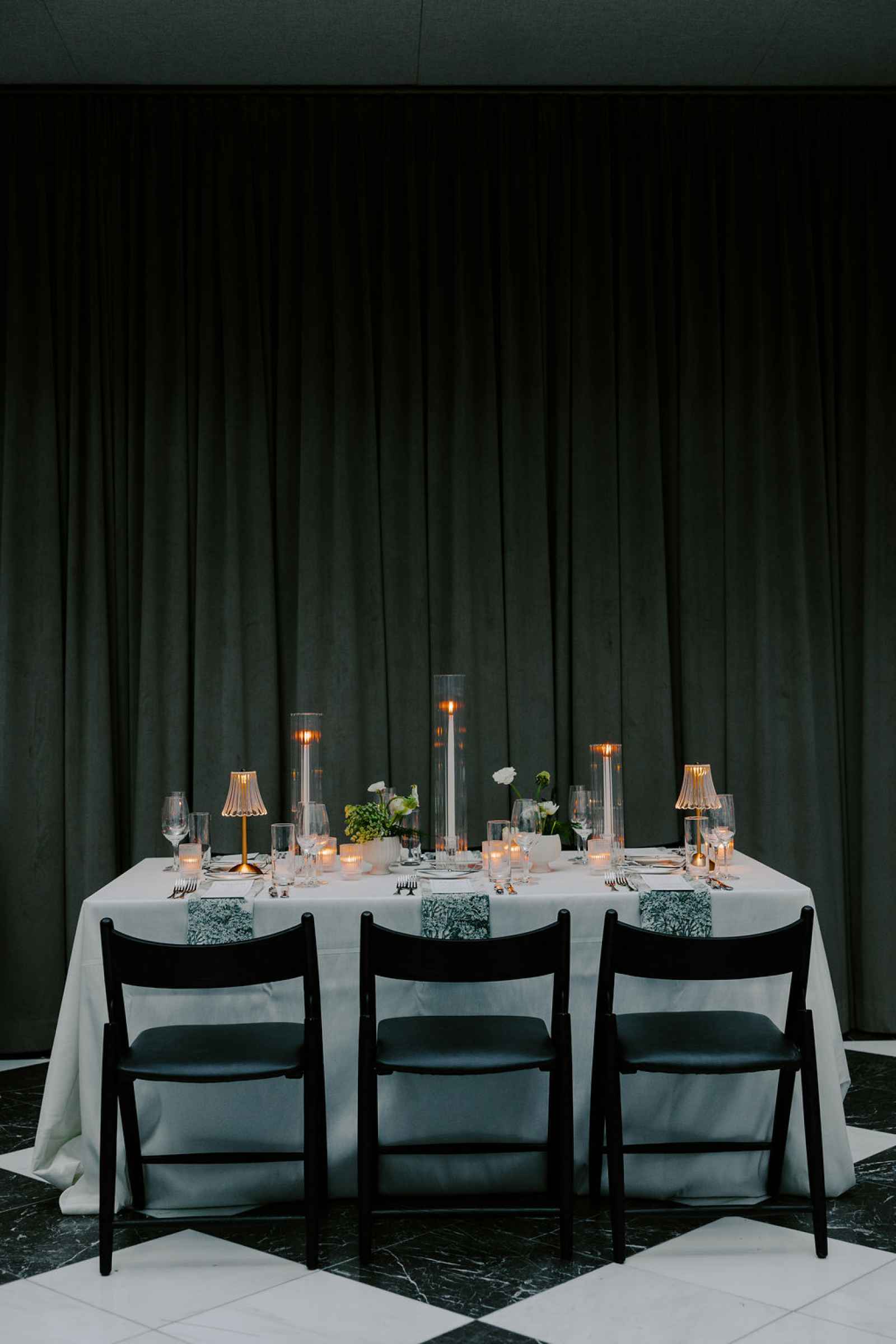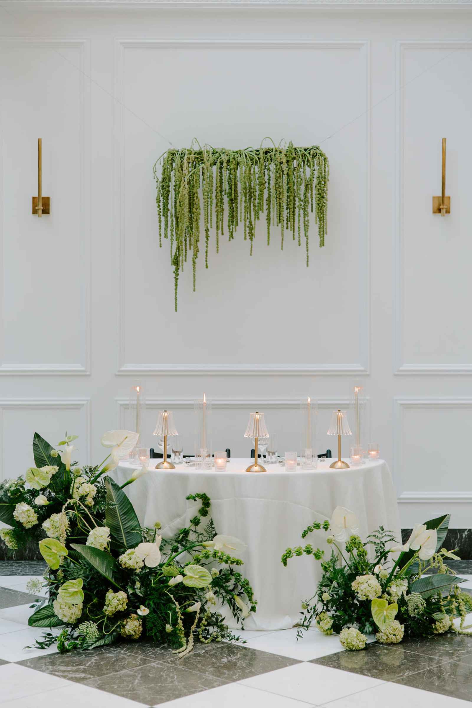 The vision for this shoot was to create a luxurious and exotic scene in a modern Chicago venue. Despite a small snafu with the plants not surviving the Chicago temperatures in February—mended by a trip to a floral wholesaler—this vision came to life perfectly! When deciding the details for this day, the team based everything on what would make the florals pop the most. They settled on a simplistic yet modern design with numerous black and white elements that elevated the atmosphere of the scene. As for the florals themselves, they utilized anthurium, green hydrangea, calla lilies, draping amaranthus and ranunculus to fill the space. Each bloom has a unique design that can stand on its own, but when placed with the rest of the florals, it created a stunning array of textures and designs that make this shoot feel like it was set far from the windy city. We love how simple yet luxurious this shoot turned out with all the neutral, elegant details!
