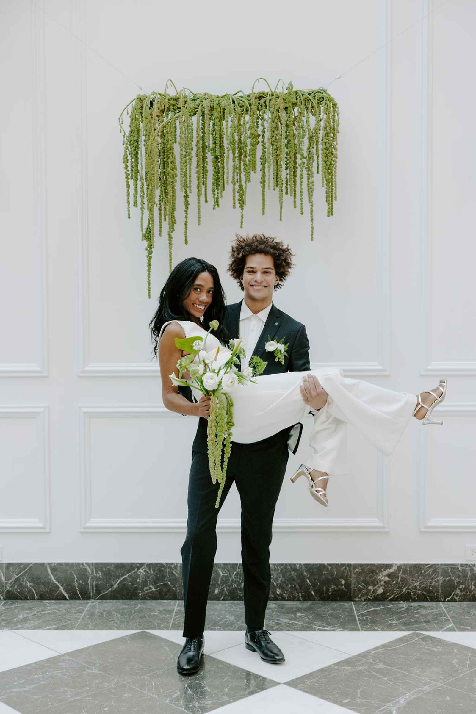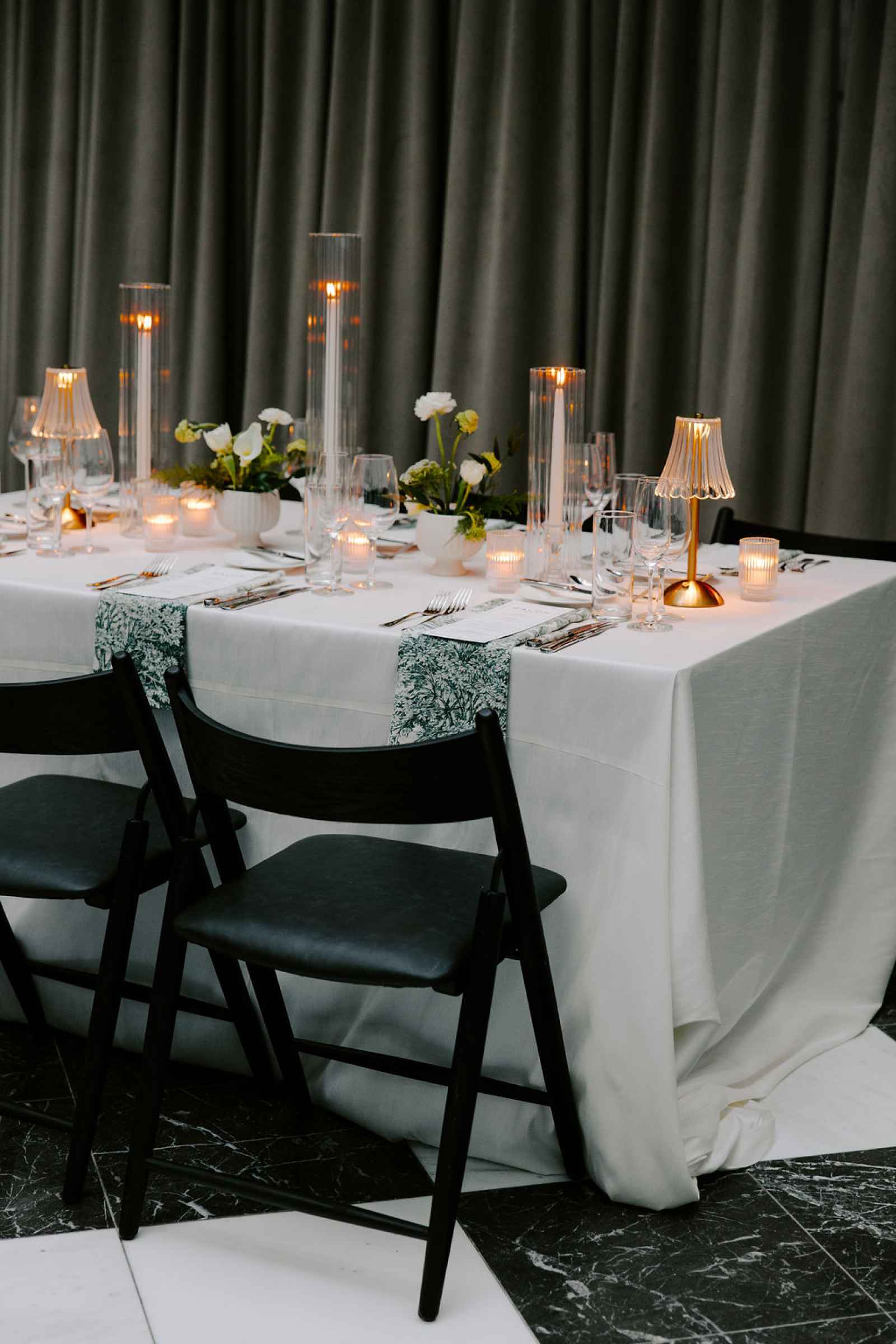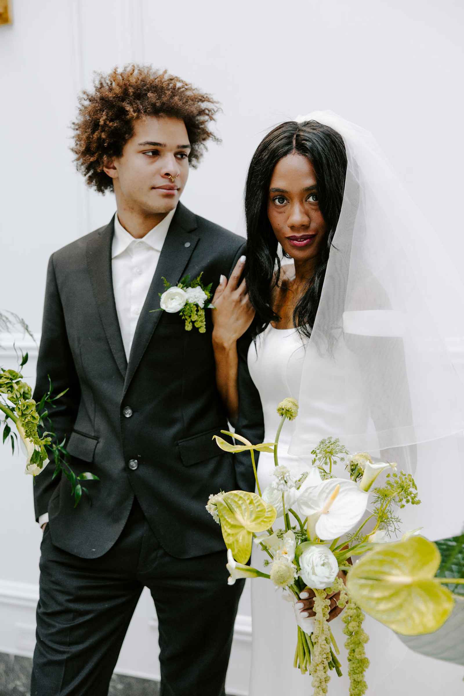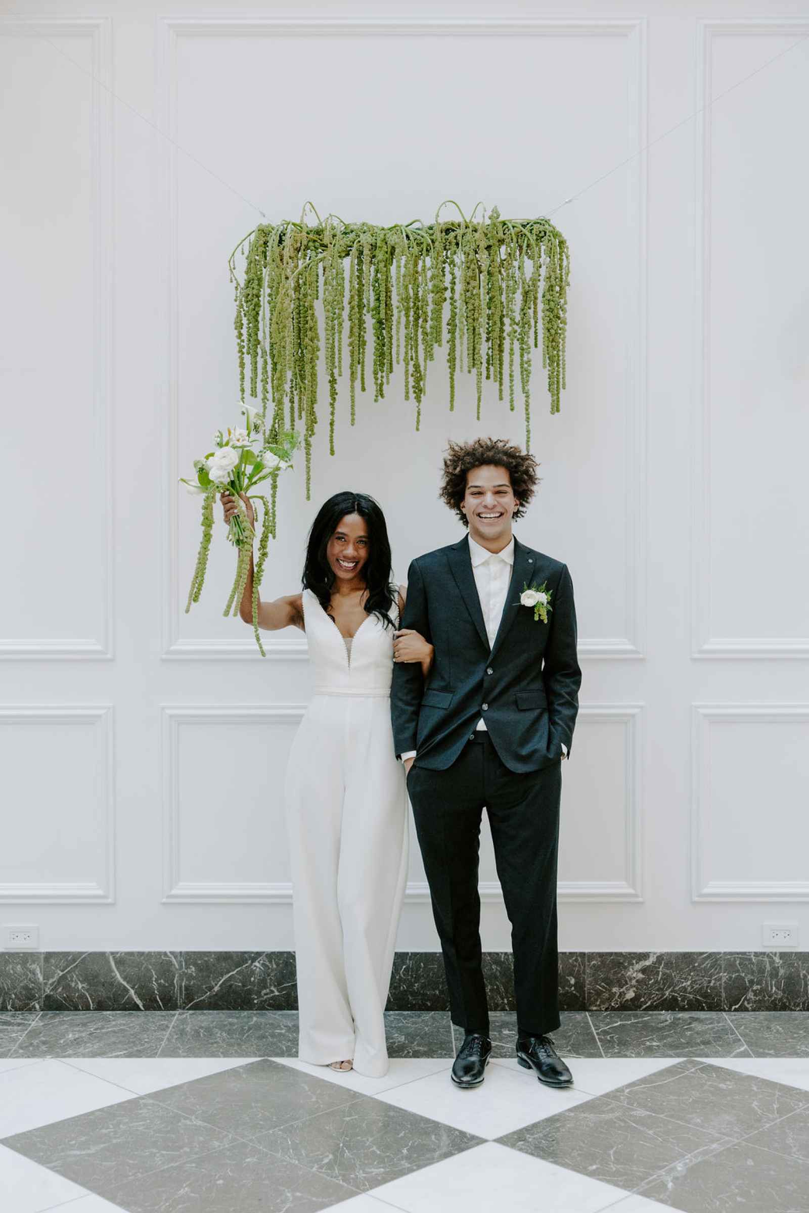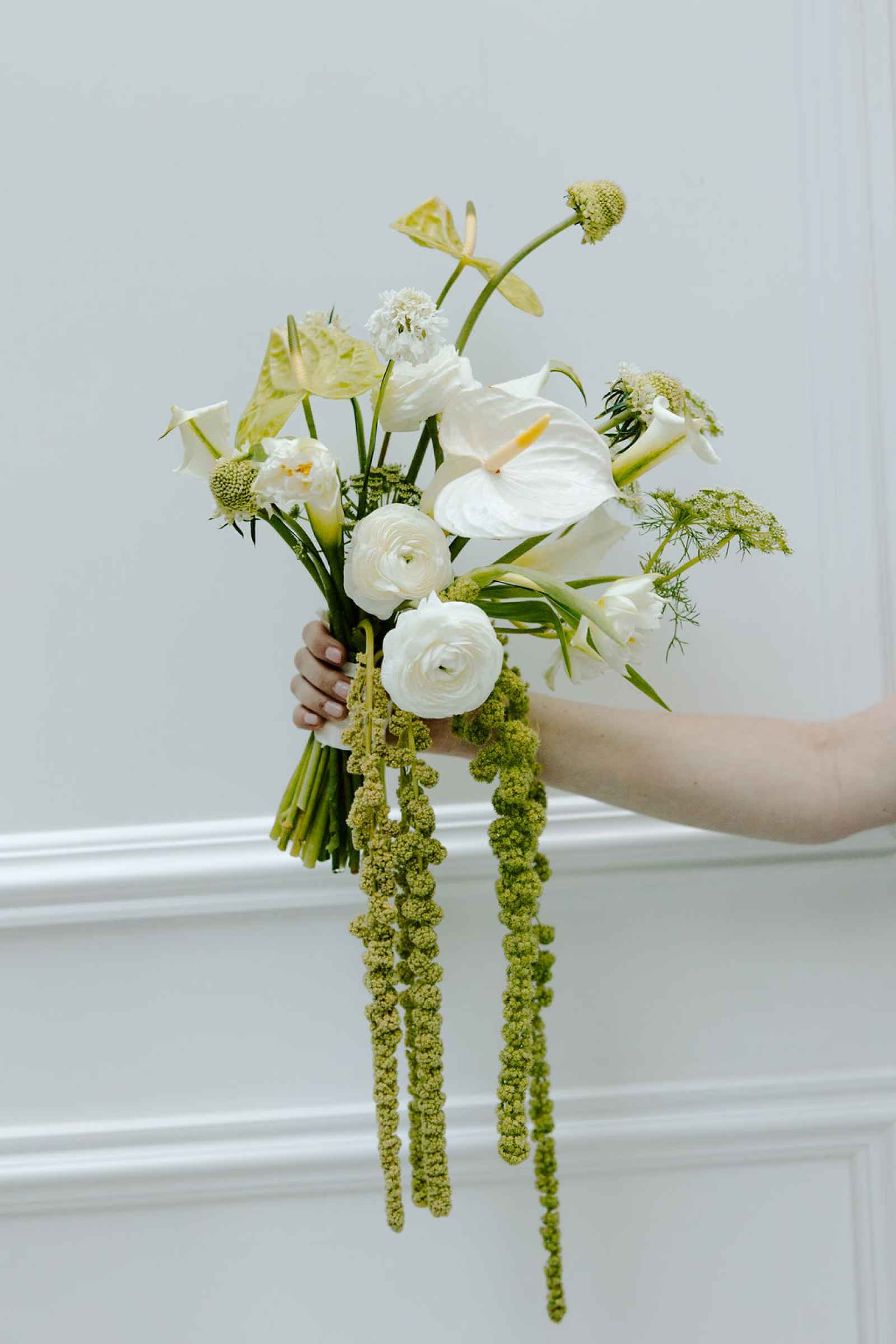 The vision for this shoot was to create a luxurious and exotic scene in a modern Chicago venue. Despite a small snafu with the plants not surviving the Chicago temperatures in February—mended by a trip to a floral wholesaler—this vision came to life perfectly! When deciding the details for this day, the team based everything on what would make the florals pop the most. They settled on a simplistic yet modern design with numerous black and white elements that elevated the atmosphere of the scene. As for the florals themselves, they utilized anthurium, green hydrangea, calla lilies, draping amaranthus and ranunculus to fill the space. Each bloom has a unique design that can stand on its own, but when placed with the rest of the florals, it created a stunning array of textures and designs that make this shoot feel like it was set far from the windy city. We love how simple yet luxurious this shoot turned out with all the neutral, elegant details!