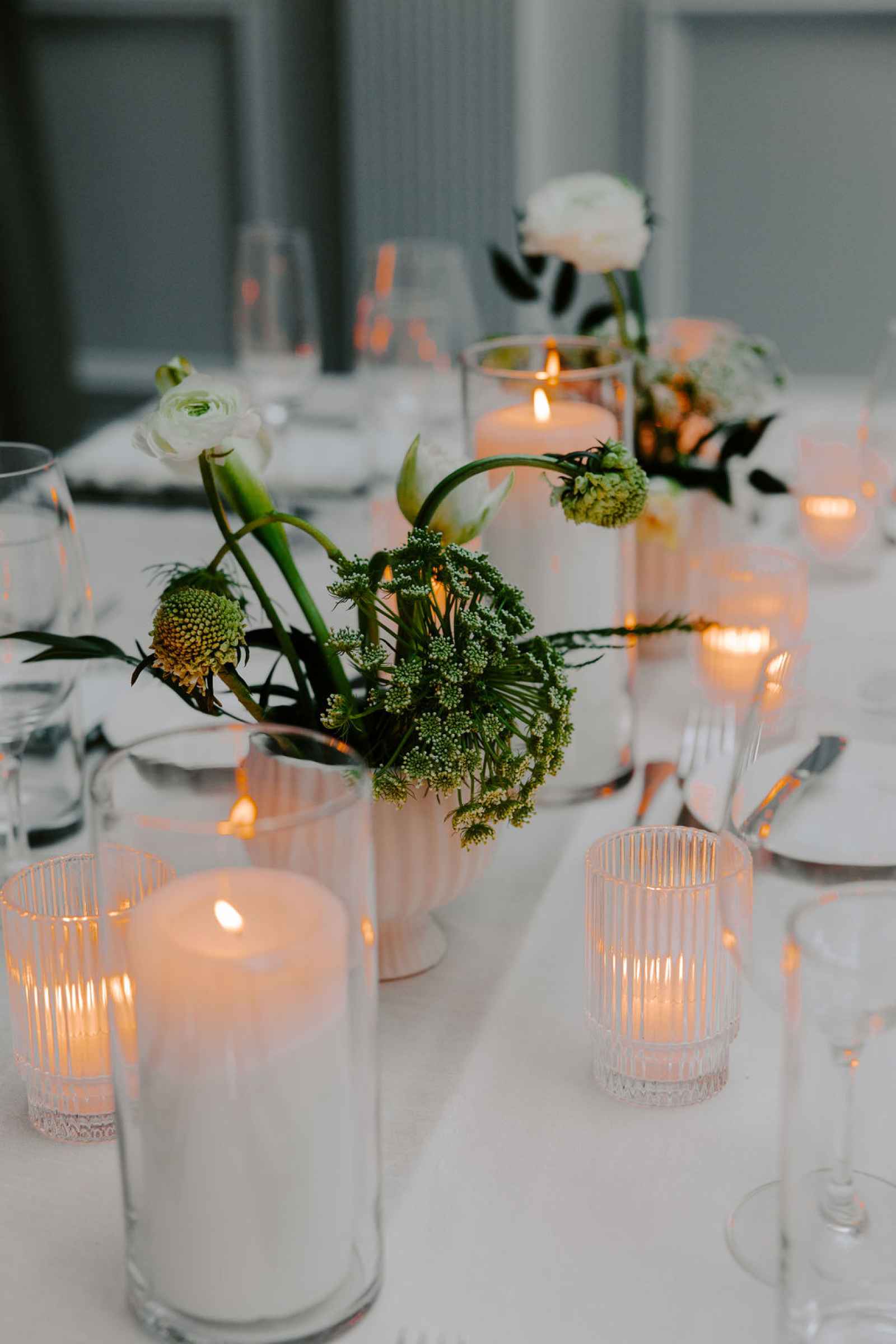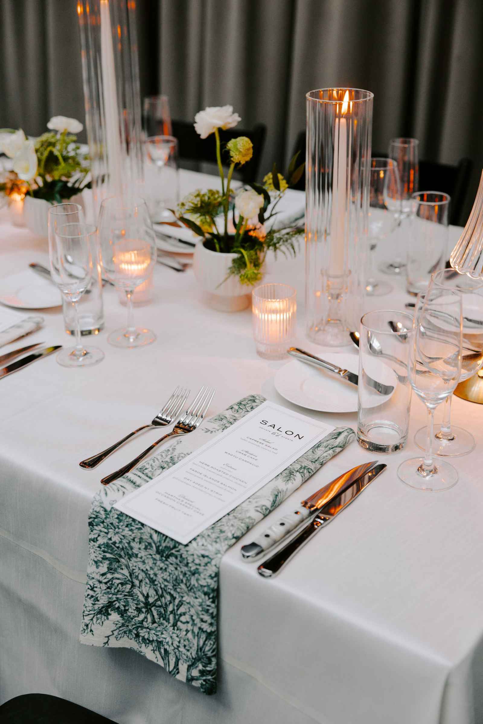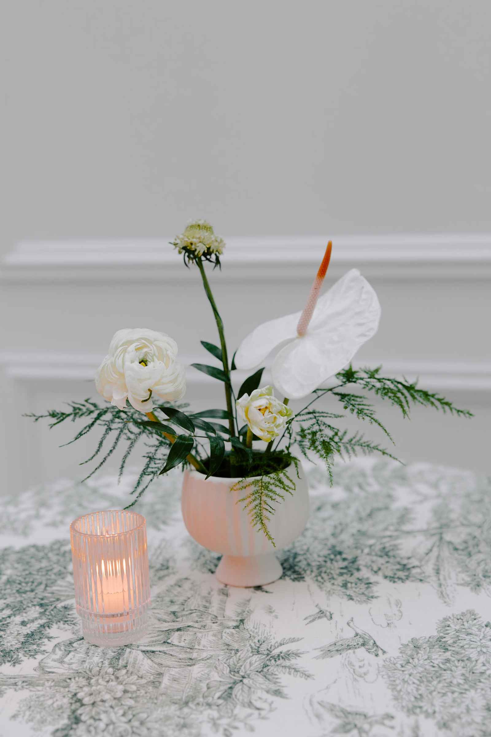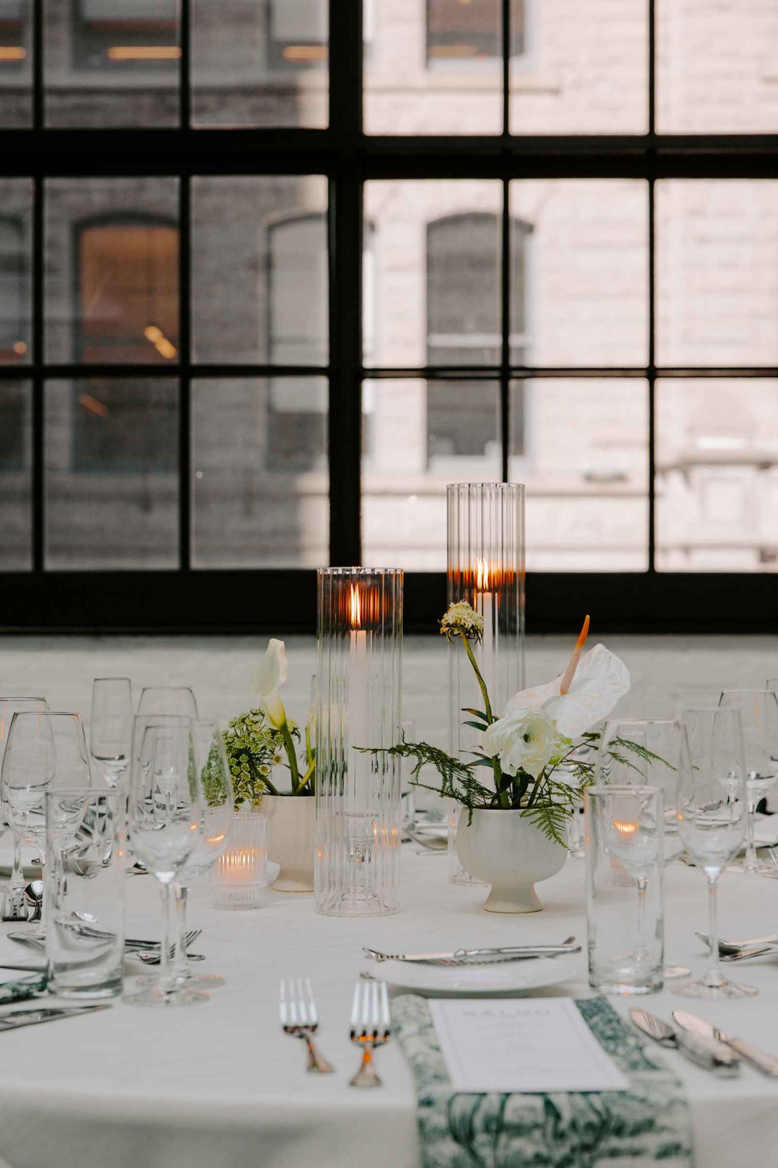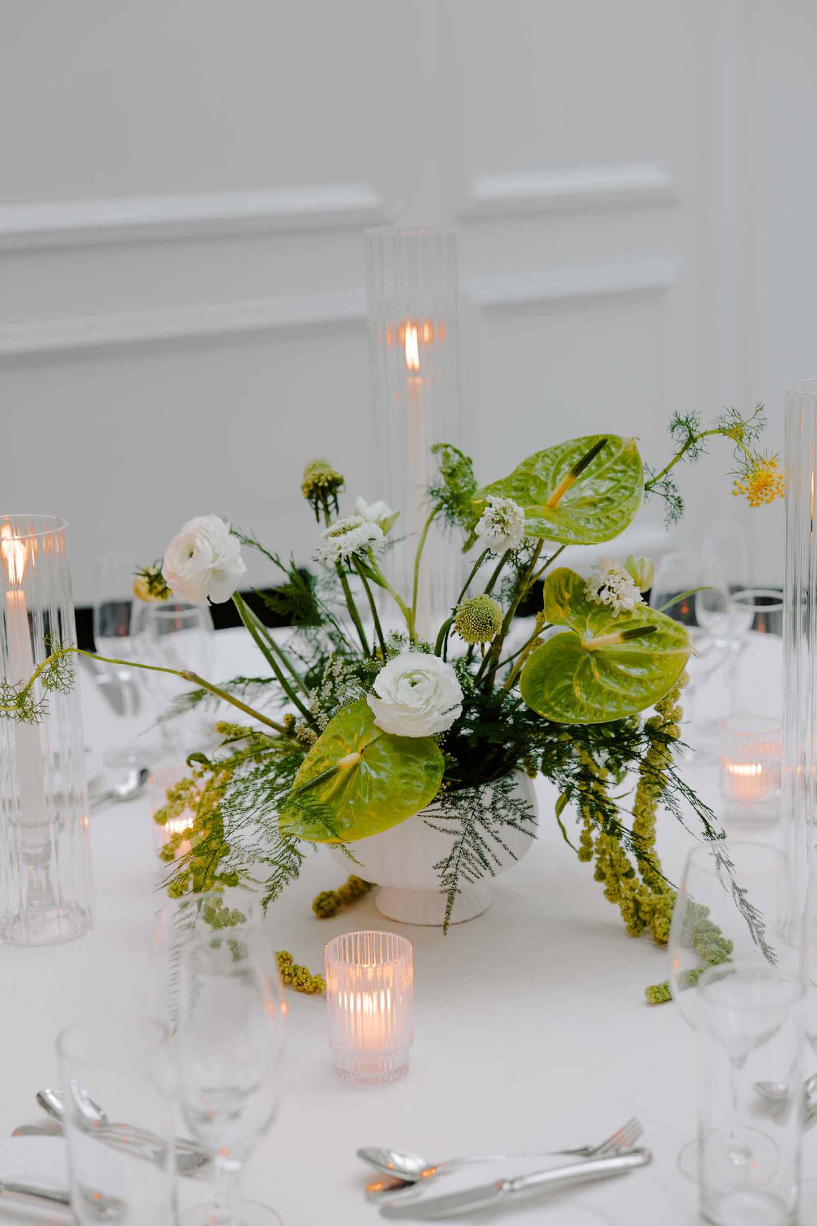 The vision for this shoot was to create a luxurious and exotic scene in a modern Chicago venue. Despite a small snafu with the plants not surviving the Chicago temperatures in February—mended by a trip to a floral wholesaler—this vision came to life perfectly! When deciding the details for this day, the team based everything on what would make the florals pop the most. They settled on a simplistic yet modern design with numerous black and white elements that elevated the atmosphere of the scene. As for the florals themselves, they utilized anthurium, green hydrangea, calla lilies, draping amaranthus and ranunculus to fill the space. Each bloom has a unique design that can stand on its own, but when placed with the rest of the florals, it created a stunning array of textures and designs that make this shoot feel like it was set far from the windy city. We love how simple yet luxurious this shoot turned out with all the neutral, elegant details!