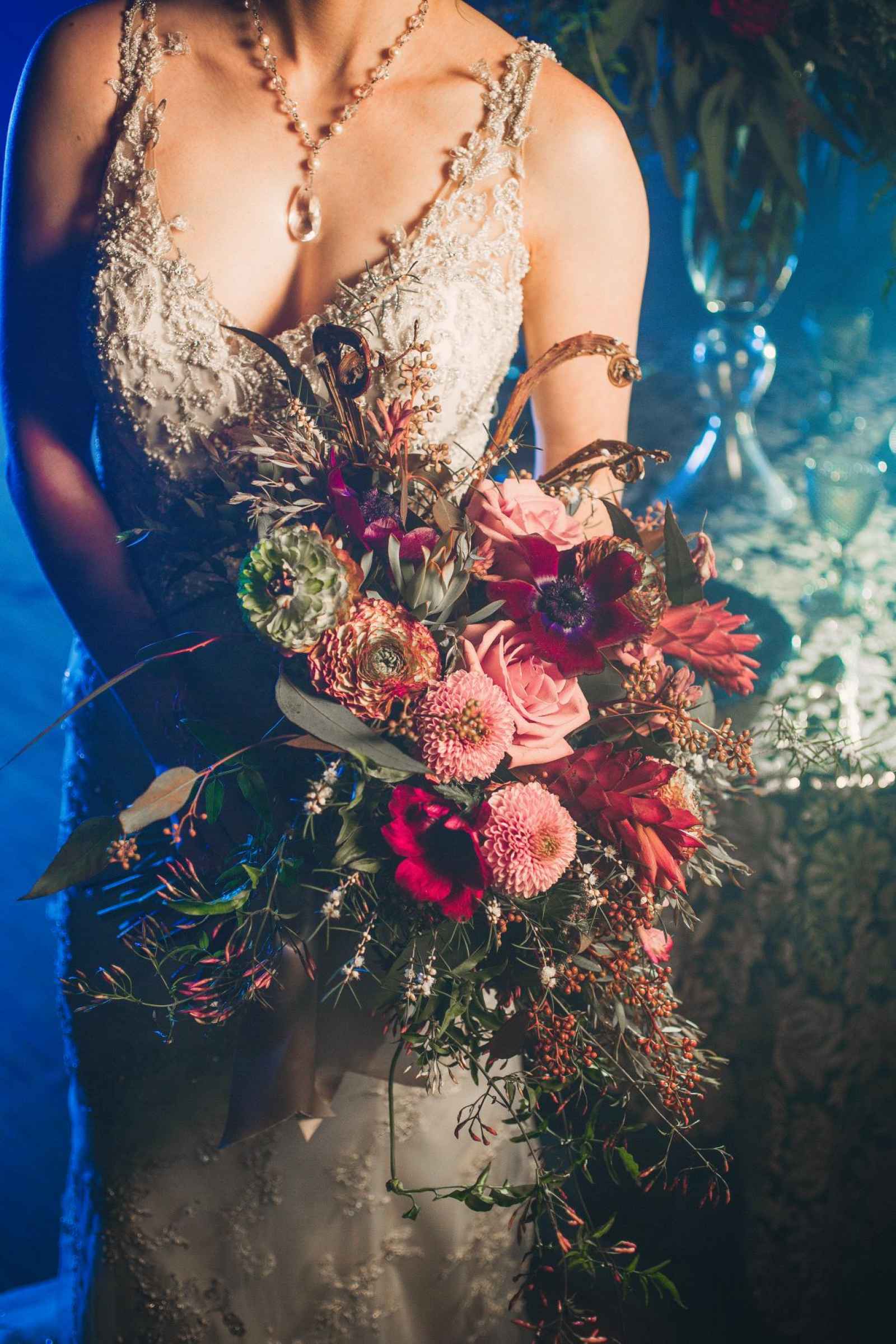 Given the direction of keeping to a moody, jewel-toned palette, Tammy of Chiffon Floral was excited by the bold choice. “I had been doing a lot of weddings in neutrals and very light color palettes, I wanted to style something that had some more saturated colors to give my portfolio some variation, as well as exercise my creativity and get out of my norm,” she says. The floral included Italian Ranunculus, roses, anemones, red ginger, leucodendron, swan lake, flowering jasmine vine, chocolate Queen Anne's lace, seeded eucalyptus, Pom Pom mums and curly pussy willow.
