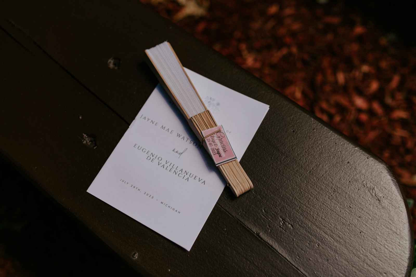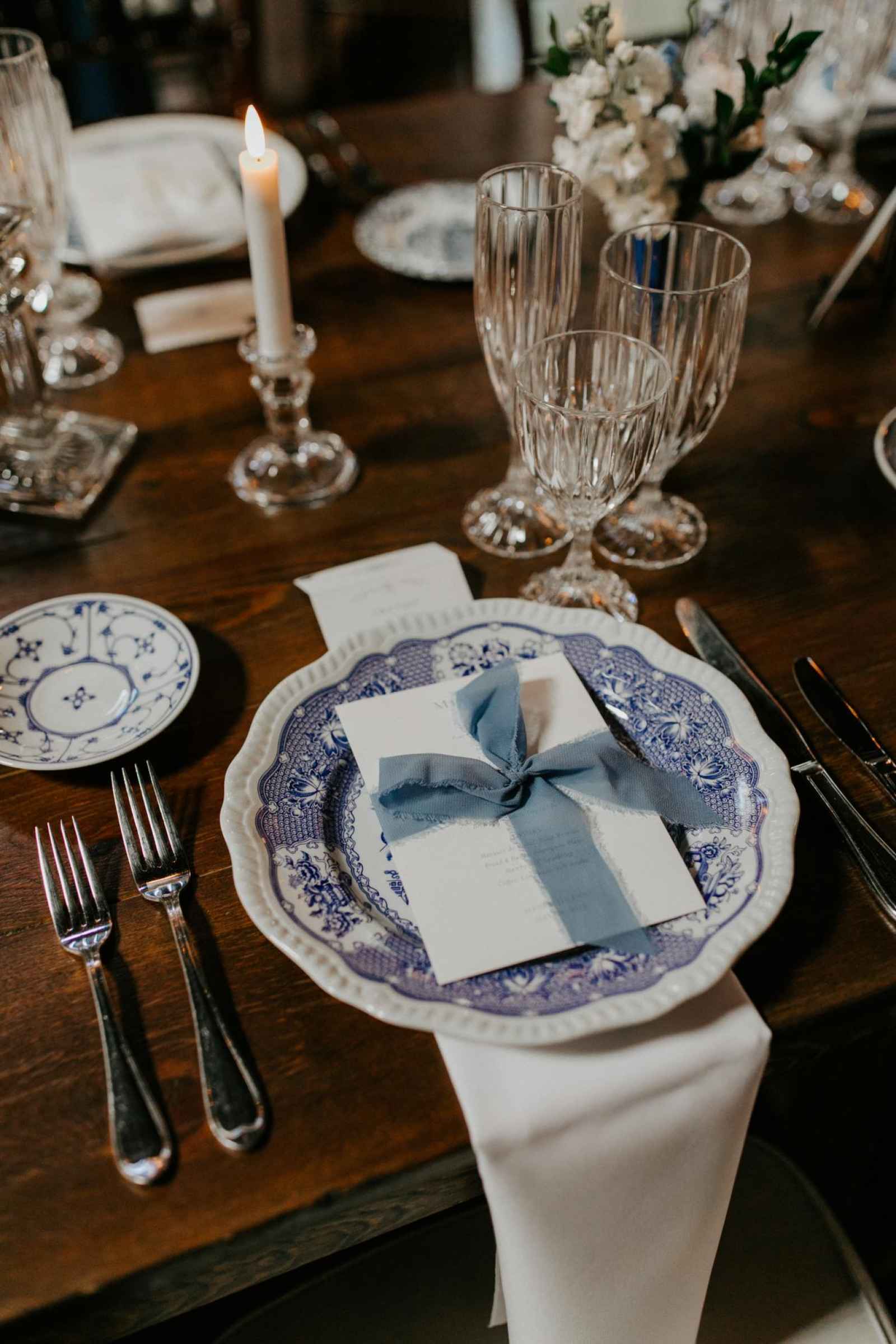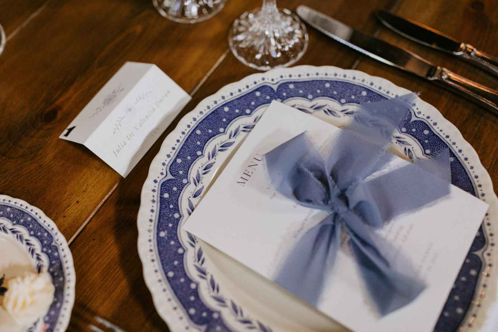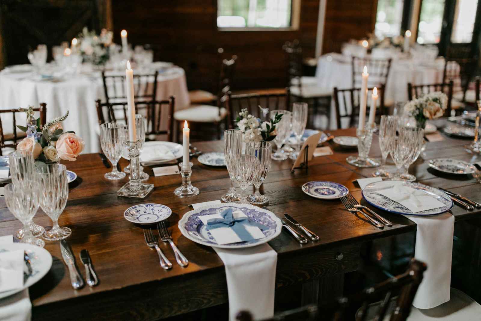 As much as Jayne wanted a northern Michigan wedding, with Eugenio’s family traveling from Spain to be a part of their big day, she needed to find a centralized venue with a northern Michigan feel. They ended up finding Tandale Nature Barn—a venue near Detroit with a woodsy location and pond on-site—the perfect combination of up north scenery. Even her dress had the feel of nature! As a lover of Delft blue china, Jayne also chose to incorporate some European touches to their big day. Each person’s tableware was collected by Jayne’s parents after she struck out finding a rental company that offered what she was looking for. This unique and personal touch made their tablescapes so special!