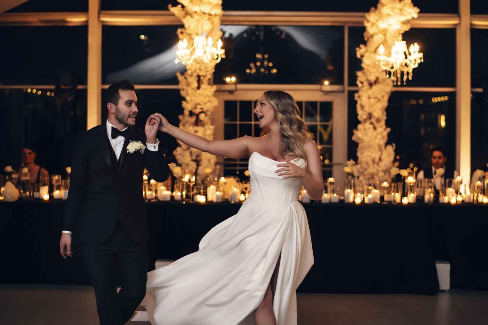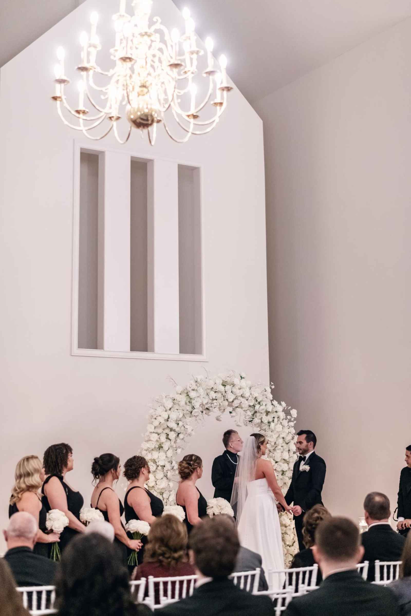 Though Lauren imagined a sophisticated black-tie wedding with gold accents, Brandon, an Indiana University grad, vetoed the “Purdue colors.” So, they decided on black-tie elegance with mixed metals instead. Since they were ringing in the New Year on their big day, they added plenty of sparkle to their opulent occasion, leaning into moody and romantic vibes for the décor. Because of their chosen date, they opted for a non-traditional timeline. The ceremony began at 7:30 and the celebration lasted until one in the morning, so they could ring in the New Year with all their friends and family! For a fun beginning to the year, Brandon and Lauren also sent their guests home with scratch-off lottery tickets instead of more traditional wedding favors.