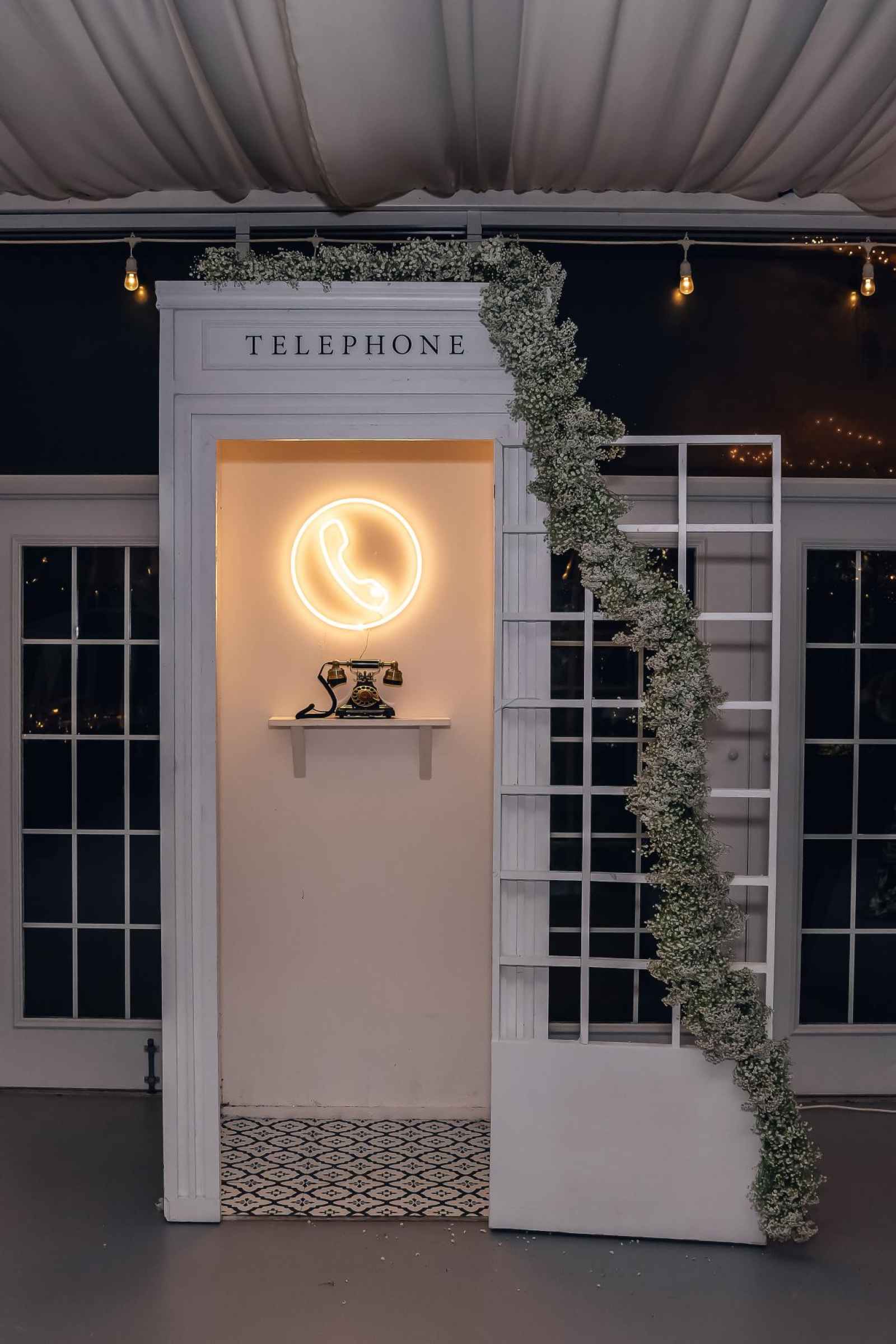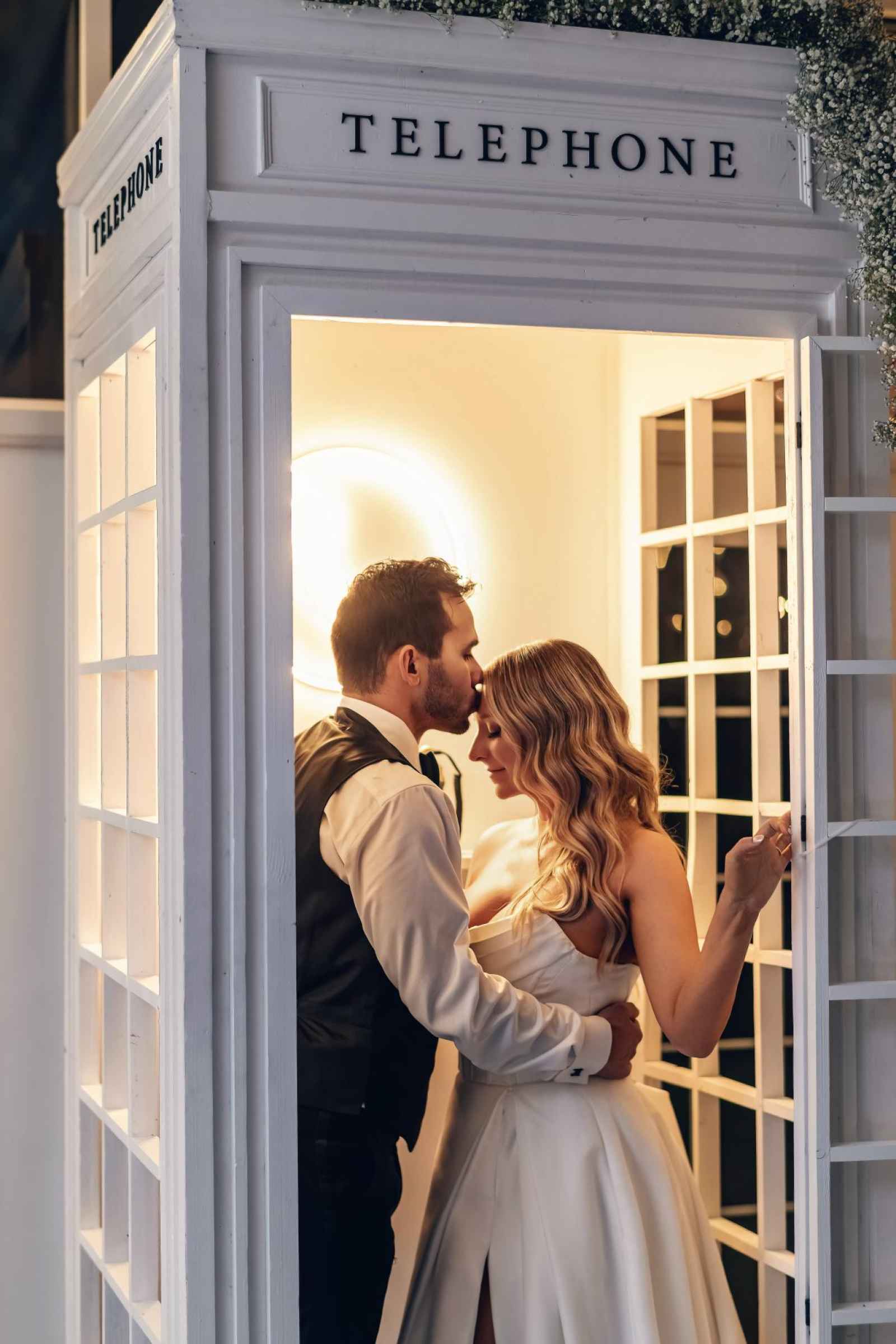 Flora and Flame brought Lauren and Brandon's entire vision to life! While Lauren initially inquired with them regarding their phone booth rental, they ended up providing florals, candles, stationery, signage, custom-built pieces and more. “Flora and Flame Design was one of those meant-to-be moments. While scrolling through New Year’s Eve wedding ideas, I came across a beautiful wedding at Ritz Charles from the year before,” Lauren shares. “After probably hours of Instagram sleuthing, I found Beth and reached out to rent the booth. After just one video chat, I knew she got me. She understood my vision immediately, and her energy was everything we were looking for.”