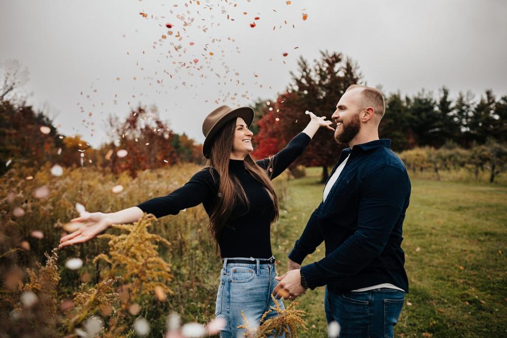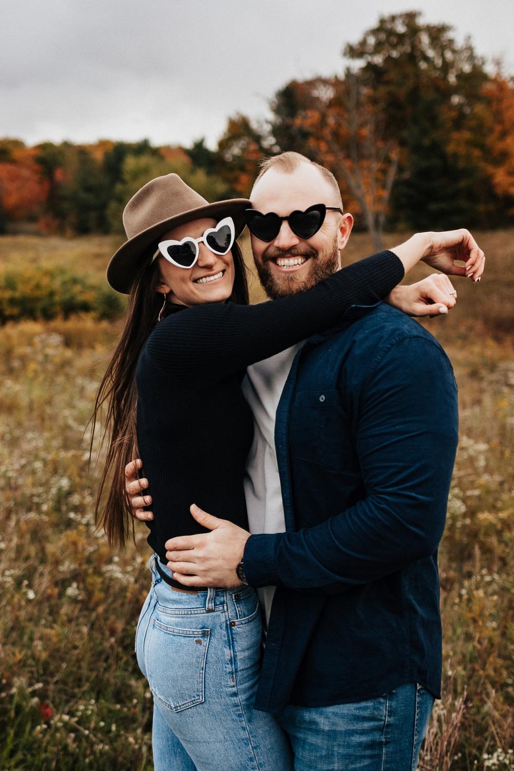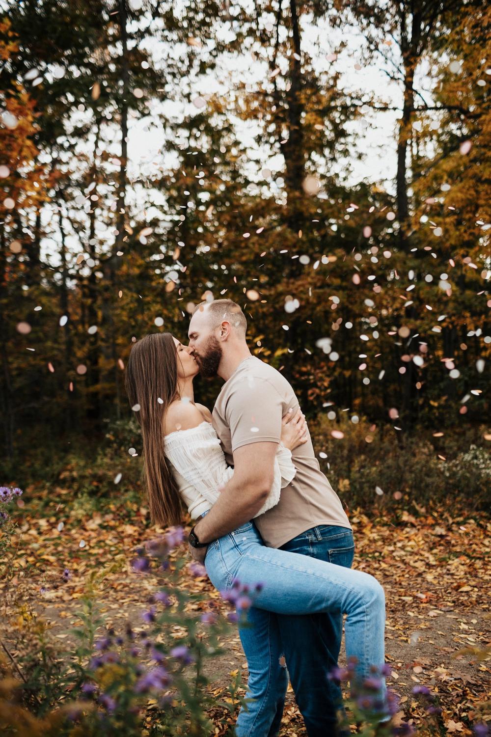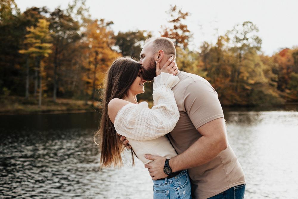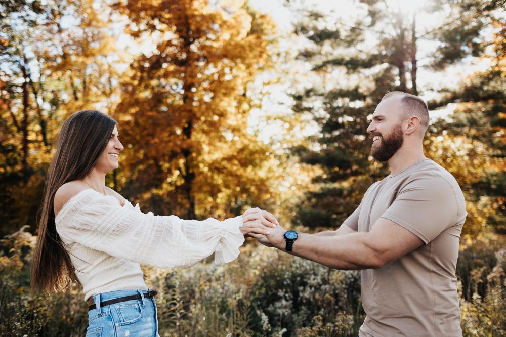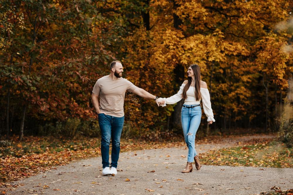 Their photographer Marisa was super helpful to Nick and Lauren by offering all types of guidance to prepared them for the shoot. She helped them pick the location for their engagement session. Lauren shares, "I knew I wanted to show off the beautiful fall foliage in northeastern Ohio in our photos and she gave a few recommendations! We lucked out that it was 'peak week' for the fall colors on the date that we set for the shoot." Marisa also sent them a pamphlet before their engagement session that helped them decide on neutral toned outfits and gave advice for accessorizing their attire.