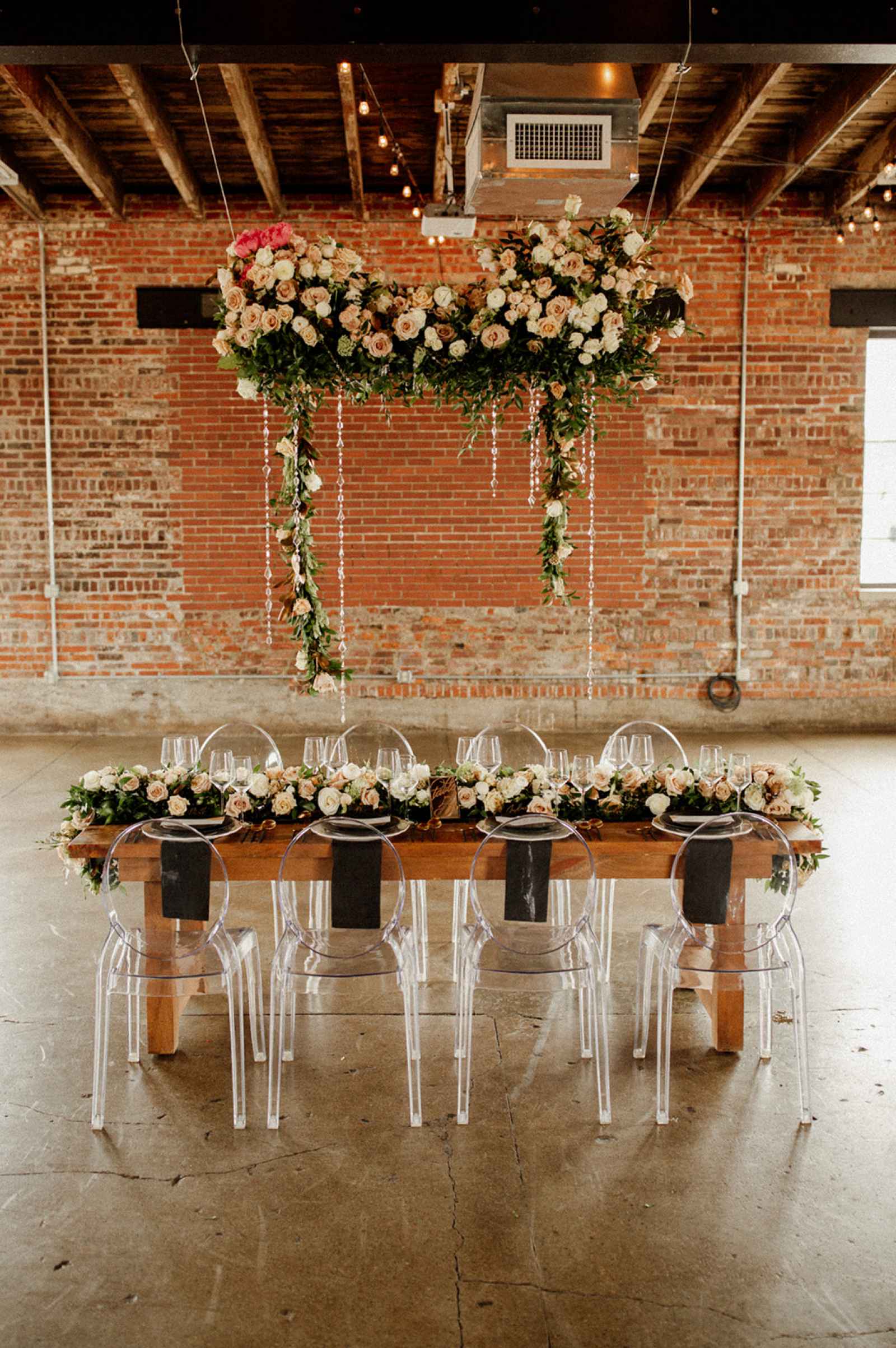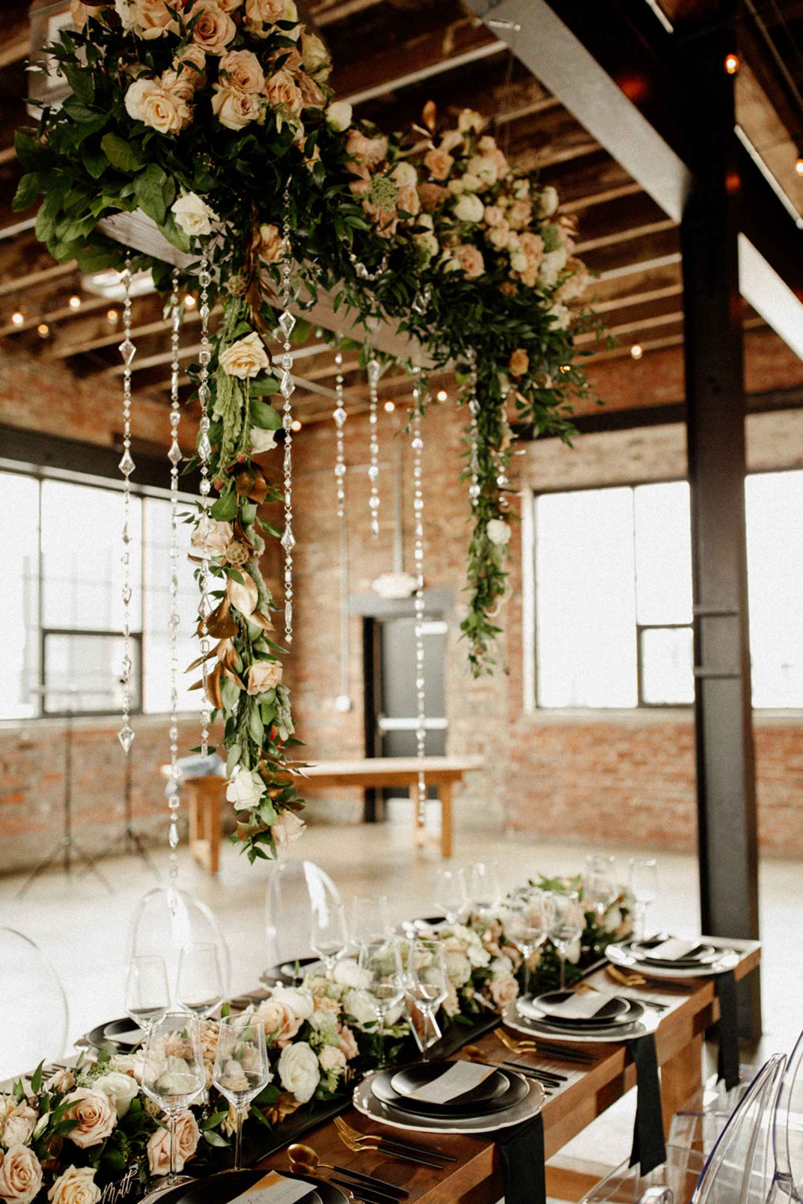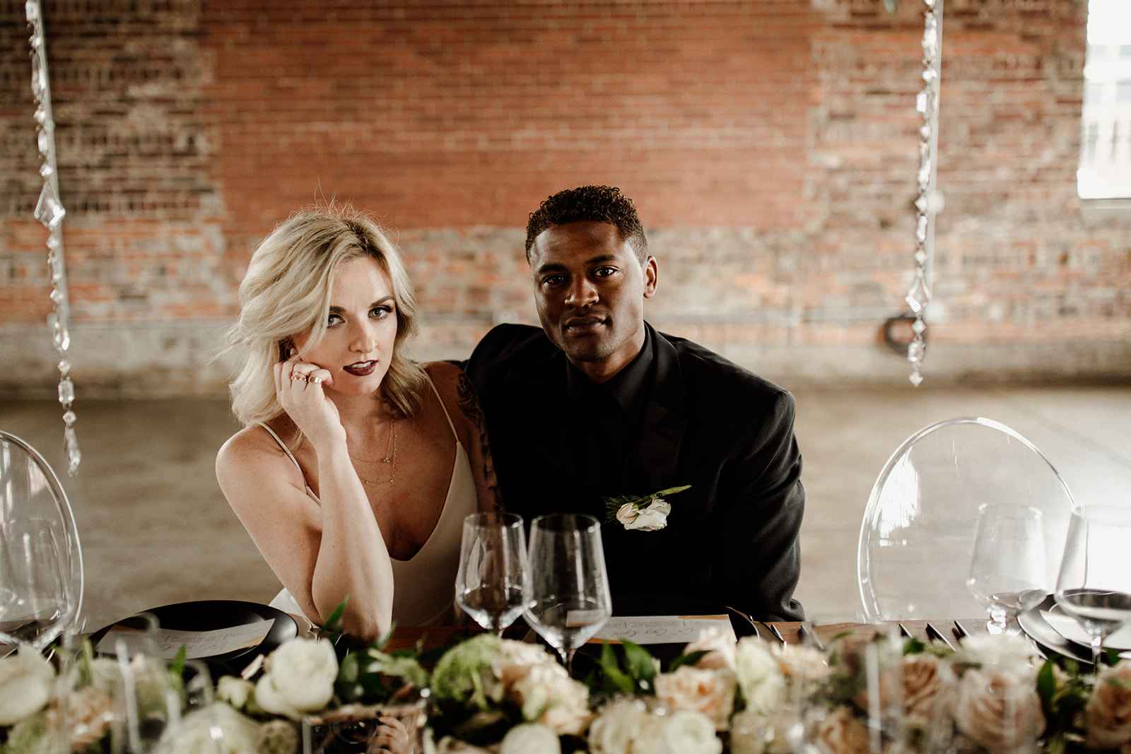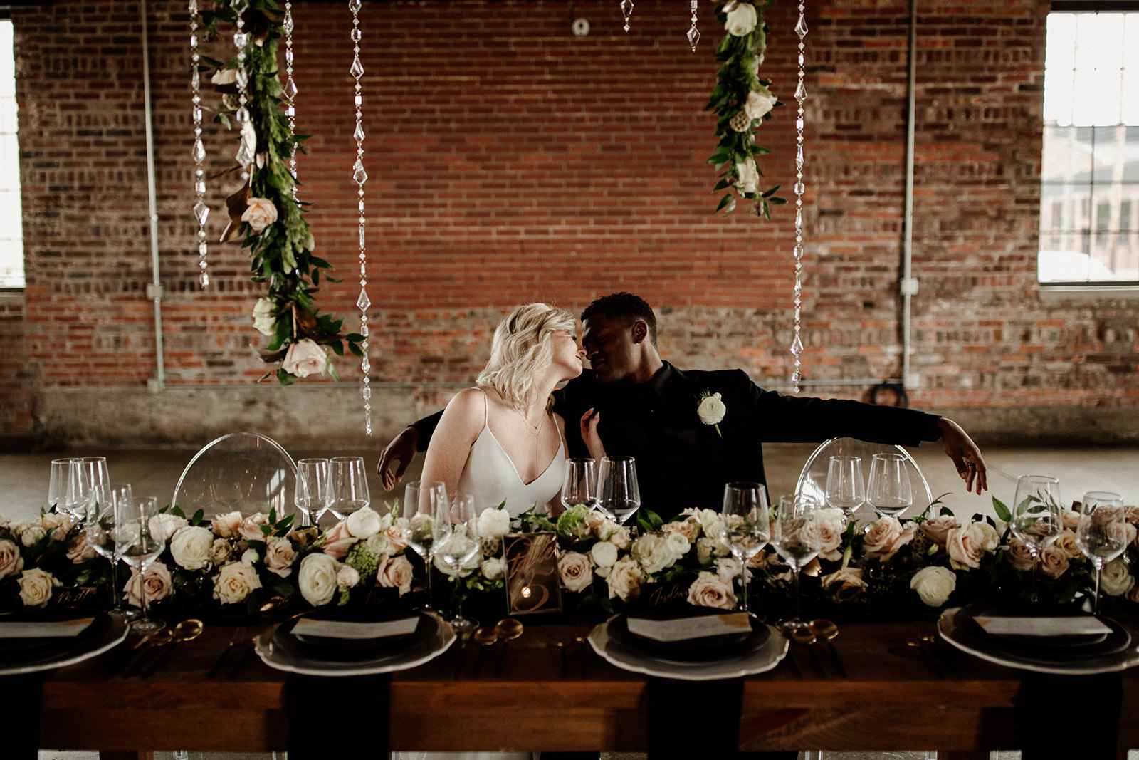 The team opted to use Industry as their venue, as it acts as the perfect blank slate. Sarah adds, "Industry is an industrial venue, but while its brick walls and exposed metal beams appeal to modern brides, we knew the pairing of heavy florals would create the perfect blend we were looking for!" With the venue selected, the color palette was an easy choice. She says, "Our color palette was simple - mostly black and white with a hint of blush and deep green. We wanted to pull in a bit of color to prevent the space from looking too bland, but only in a minimal way." The floral design was one way the color palette was infused in the shoot, using light colored, heavy florals and minimal greenery to pull in a classic, elegant vibe against the more modern venue.
