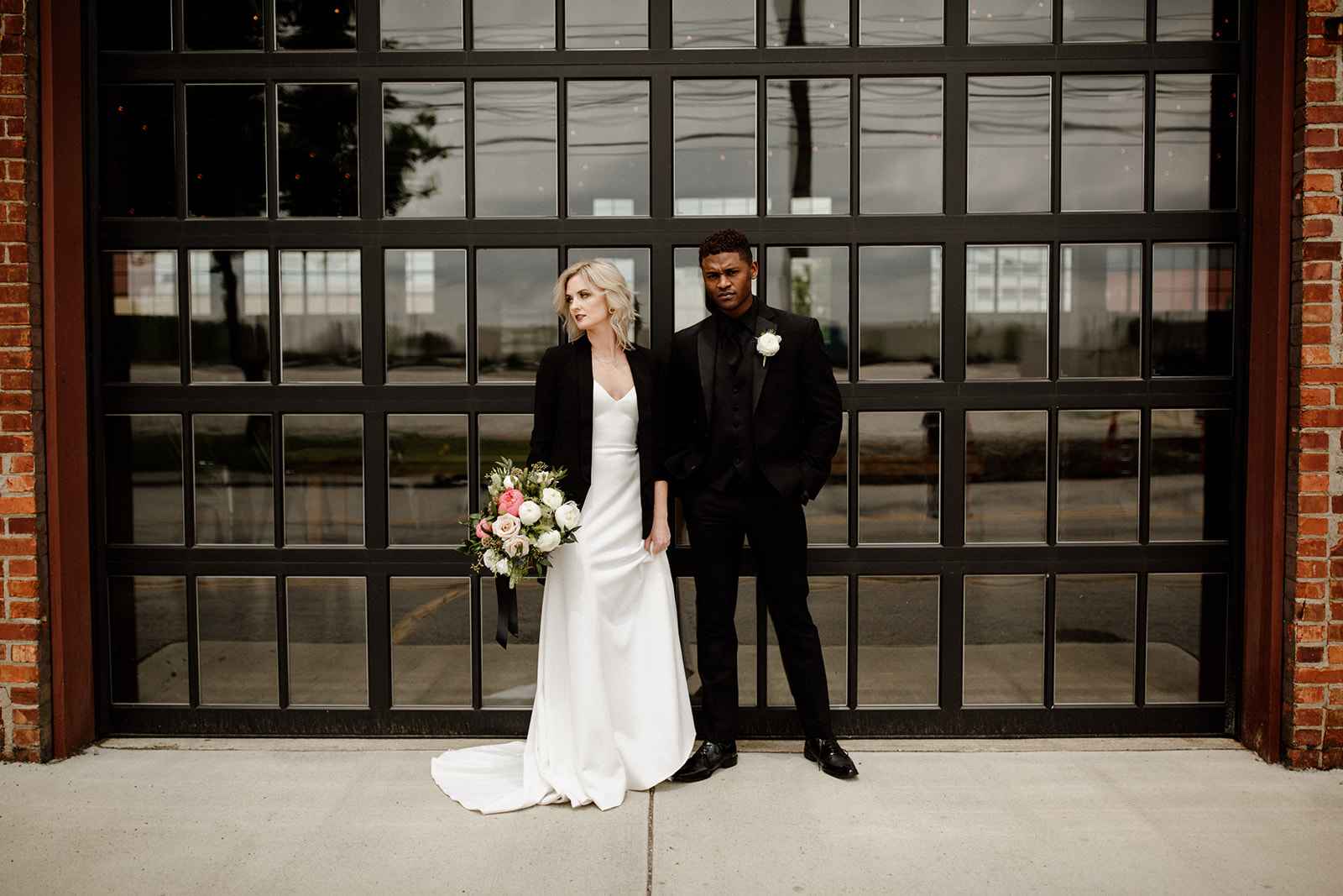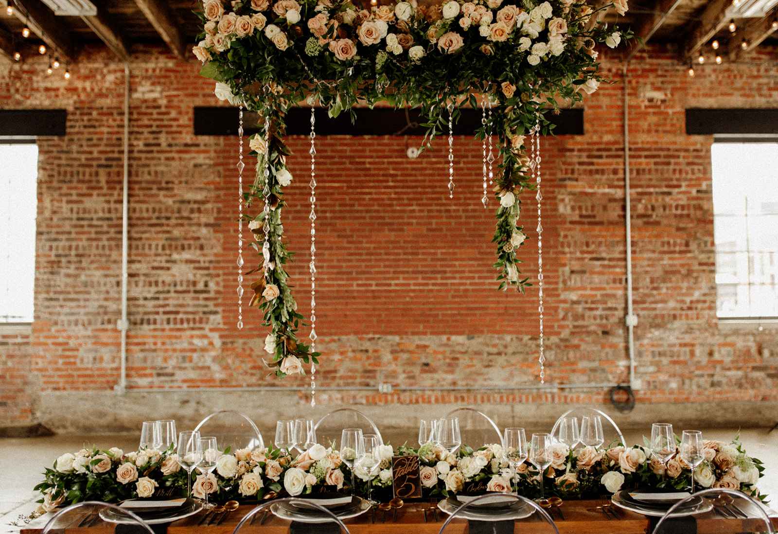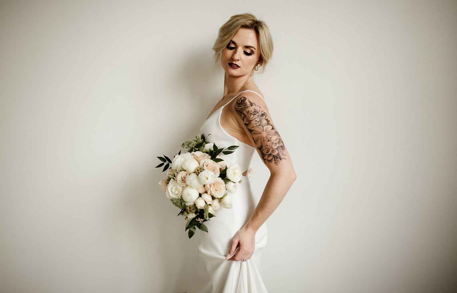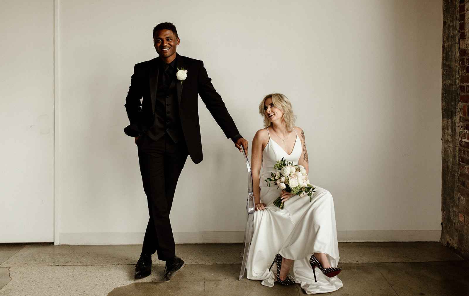 The team opted to use Industry as their venue, as it acts as the perfect blank slate. Sarah adds, "Industry is an industrial venue, but while its brick walls and exposed metal beams appeal to modern brides, we knew the pairing of heavy florals would create the perfect blend we were looking for!" With the venue selected, the color palette was an easy choice. She says, "Our color palette was simple - mostly black and white with a hint of blush and deep green. We wanted to pull in a bit of color to prevent the space from looking too bland, but only in a minimal way." The floral design was one way the color palette was infused in the shoot, using light colored, heavy florals and minimal greenery to pull in a classic, elegant vibe against the more modern venue.
