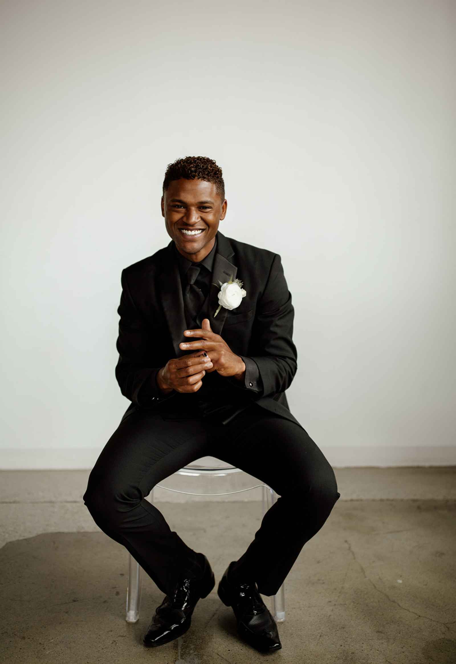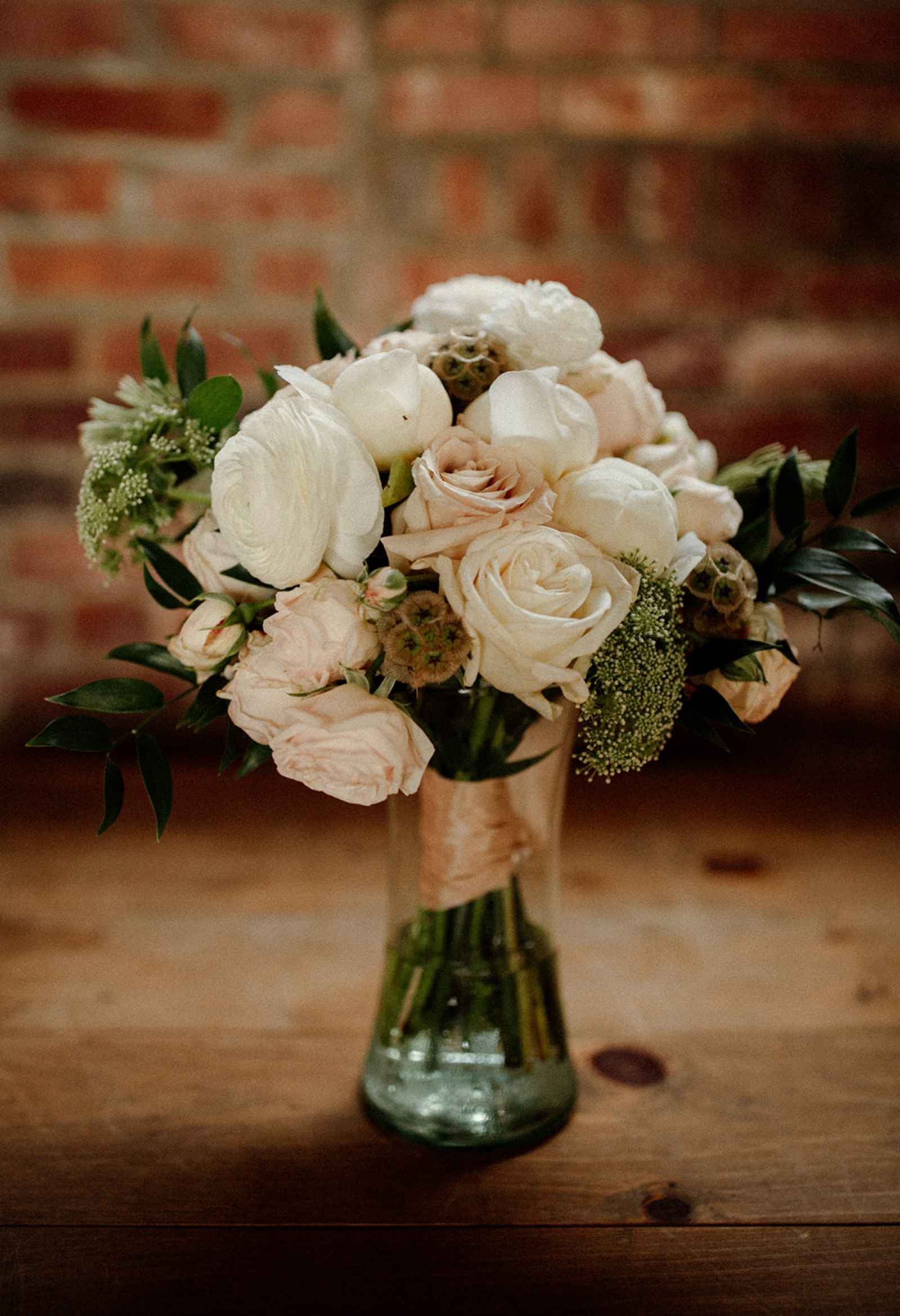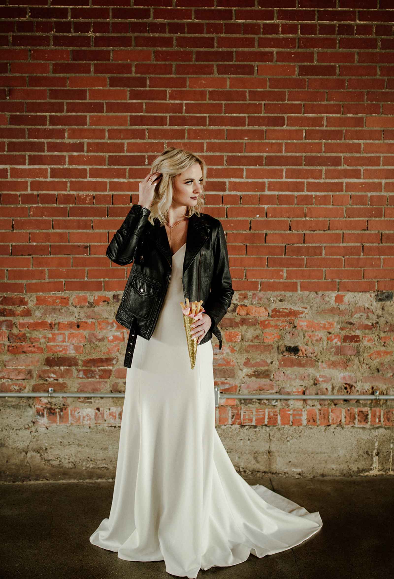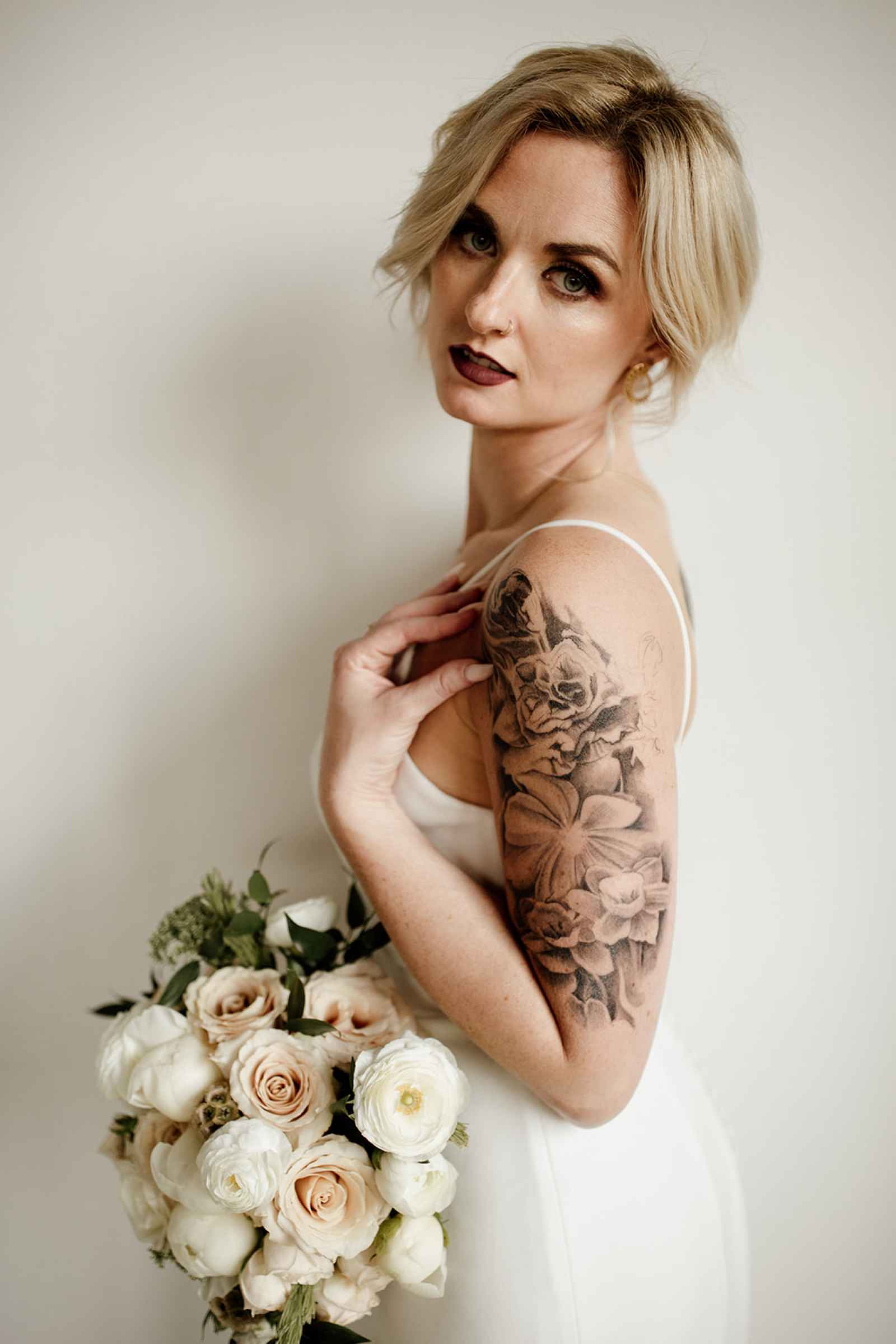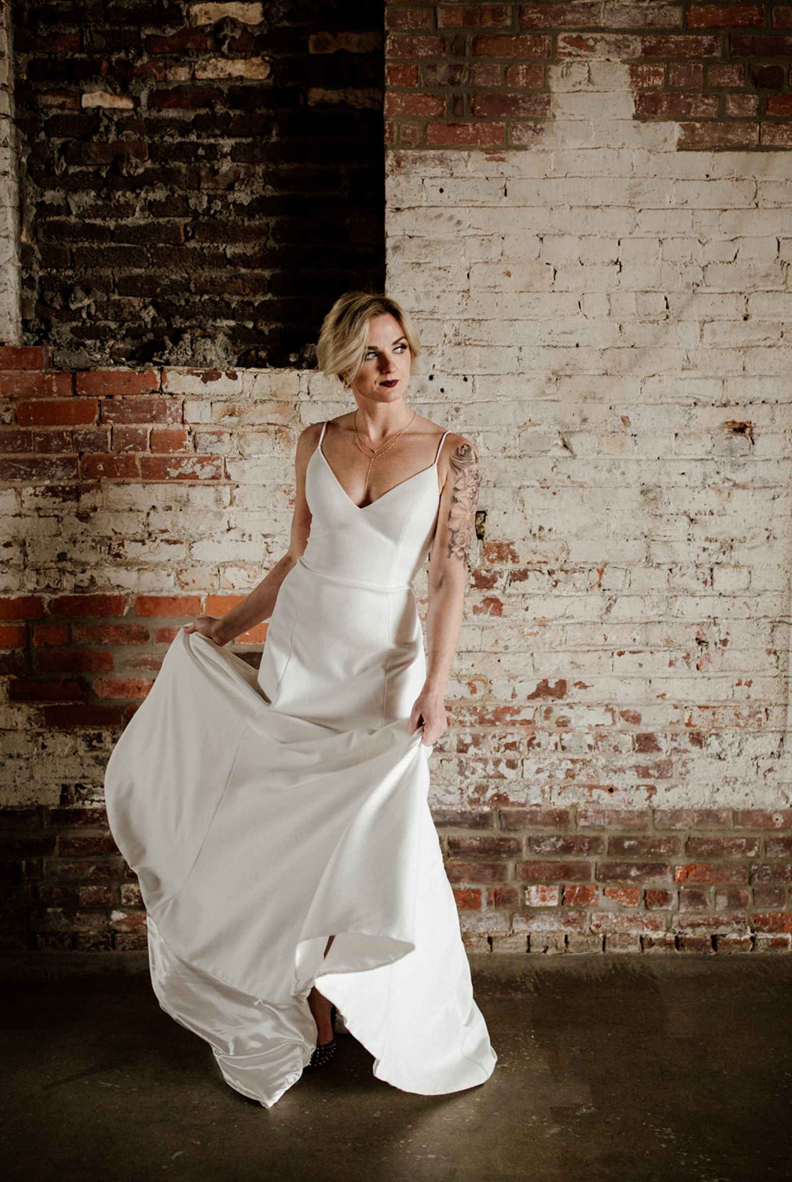 The team opted to use Industry as their venue, as it acts as the perfect blank slate. Sarah adds, "Industry is an industrial venue, but while its brick walls and exposed metal beams appeal to modern brides, we knew the pairing of heavy florals would create the perfect blend we were looking for!" With the venue selected, the color palette was an easy choice. She says, "Our color palette was simple - mostly black and white with a hint of blush and deep green. We wanted to pull in a bit of color to prevent the space from looking too bland, but only in a minimal way." The floral design was one way the color palette was infused in the shoot, using light colored, heavy florals and minimal greenery to pull in a classic, elegant vibe against the more modern venue.