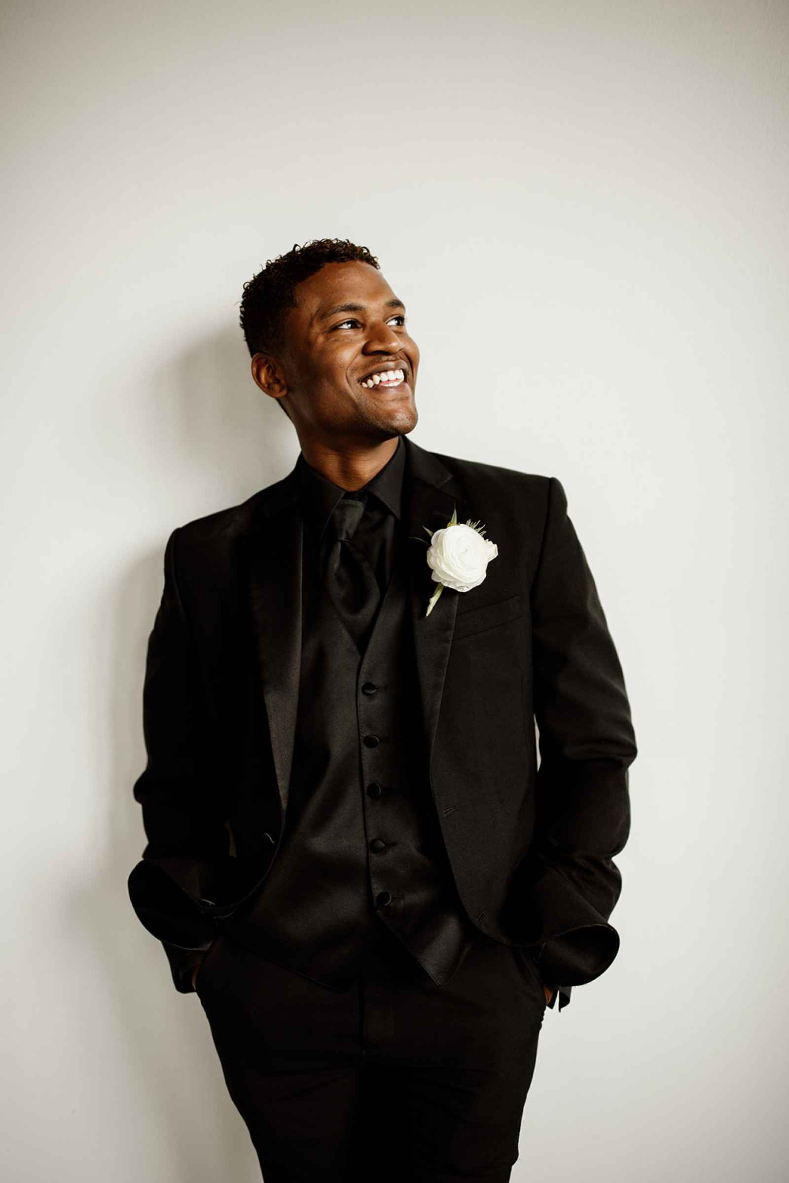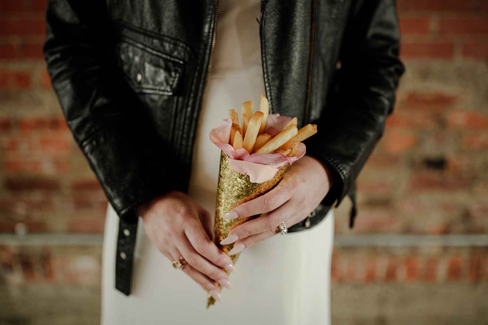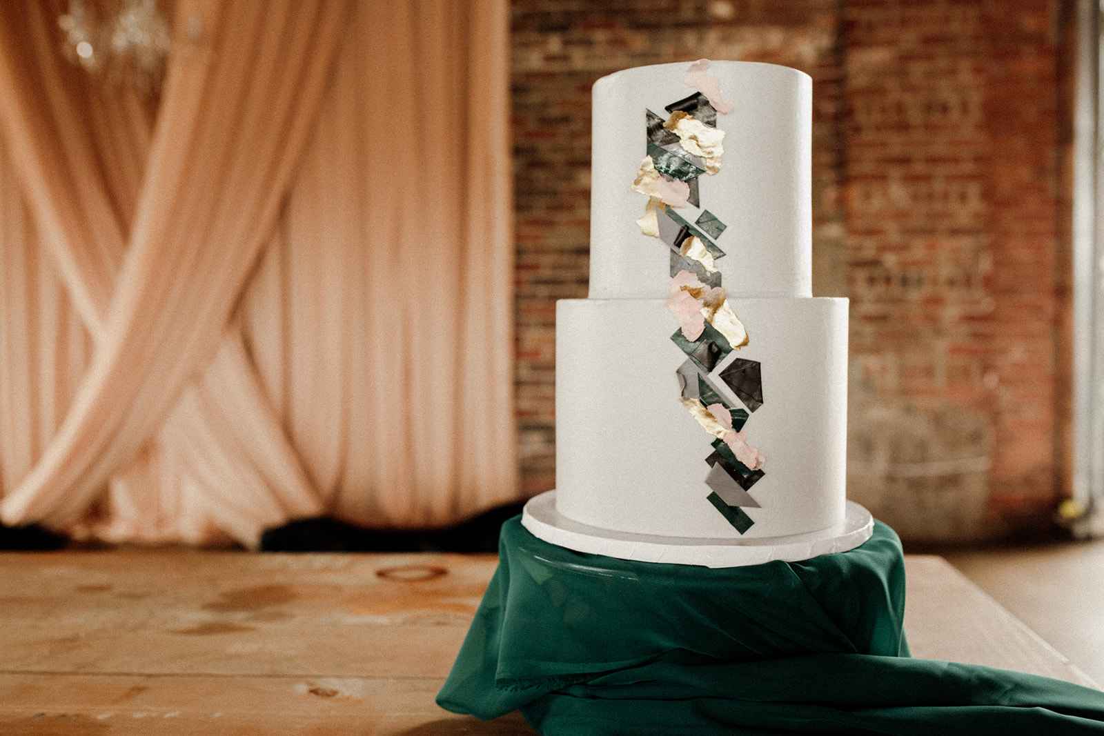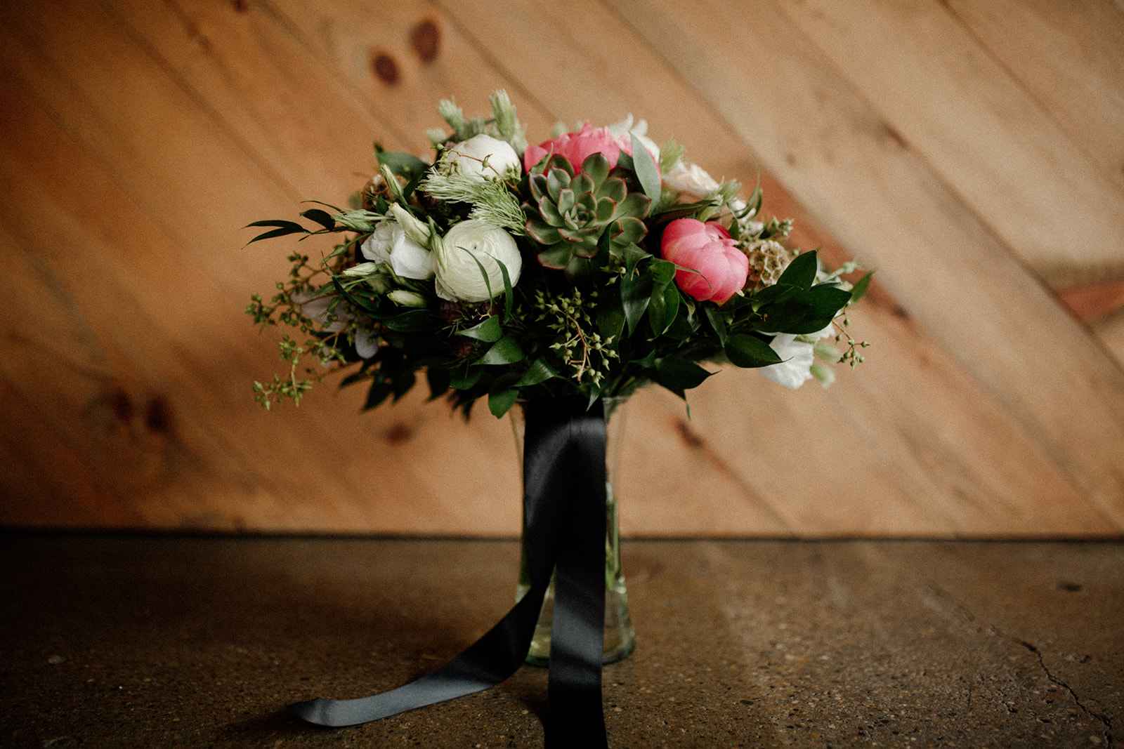 The team opted to use Industry as their venue, as it acts as the perfect blank slate. Sarah adds, "Industry is an industrial venue, but while its brick walls and exposed metal beams appeal to modern brides, we knew the pairing of heavy florals would create the perfect blend we were looking for!" With the venue selected, the color palette was an easy choice. She says, "Our color palette was simple - mostly black and white with a hint of blush and deep green. We wanted to pull in a bit of color to prevent the space from looking too bland, but only in a minimal way." The floral design was one way the color palette was infused in the shoot, using light colored, heavy florals and minimal greenery to pull in a classic, elegant vibe against the more modern venue.